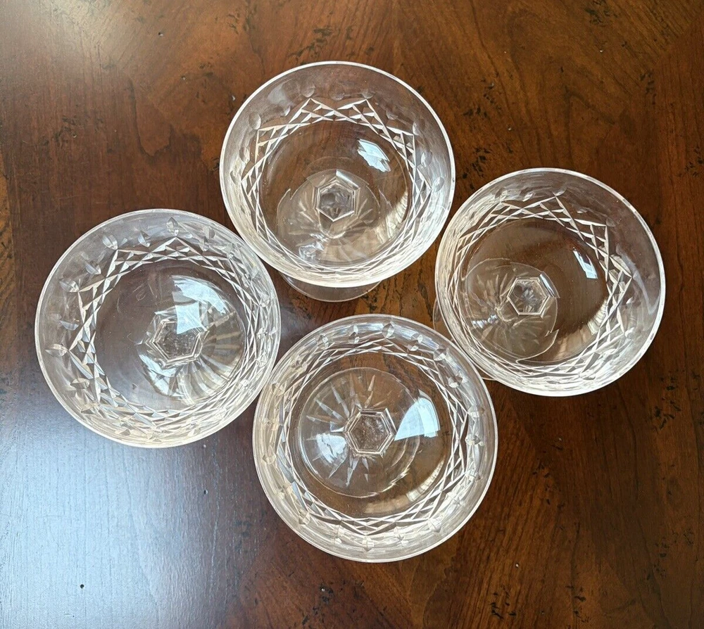 Set of 4 Waterford, Lismore pattern champaign glasses. They are in excellent condition. Measures ( approx.): 4" DIA rim, 4.25" H. They are etched marked. Please see photos for more details. Please note that the item is vintage and may show signs of wear. We have done our best to honestly and accurately describe and photograph the item, including possible flaws. What you see are the actual photos of the item being sold. If you have any questions regarding the item, please ask! We DO NOT SELL outside United States. SHIPPING The item will be shipped within three business days after receipt of payment. We ship via USPS to any location within the 48 continental United States, NO INTERNATIONAL SHIPPING. Shipping is calculated by EBAY based on the weight and size of the item plus packaging. We can combine shipping in case you buy multiple items that can be safely shipped together. Thanks for looking!