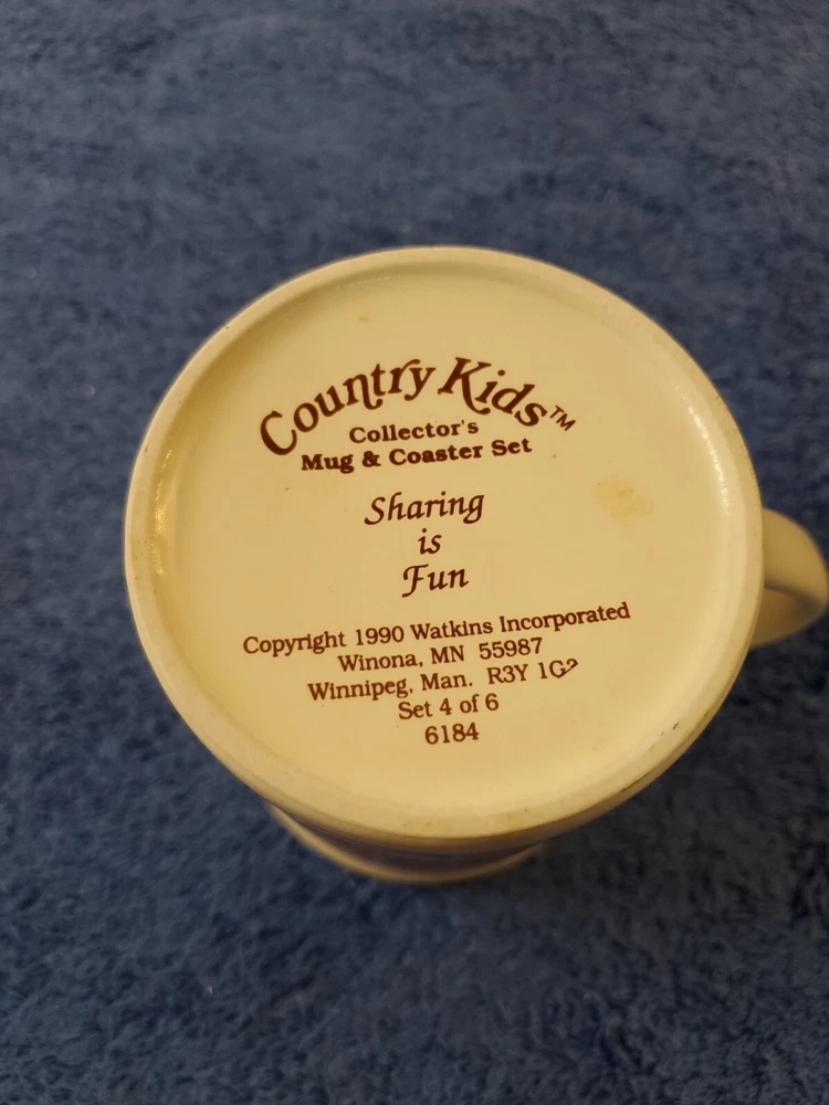 Vintage Watkins Country Kids “Sharing Is Fun” Mug And Coaster Set - never used. WILL SHIP IN STURDY BOX. WE WILL COMBINE SHIPPING ON MULTIPLE ITEMS IF POSSIBLE. PLEASE CHECK OUT OUR OTHER ITEMS. THANKS FOR LOOKING.