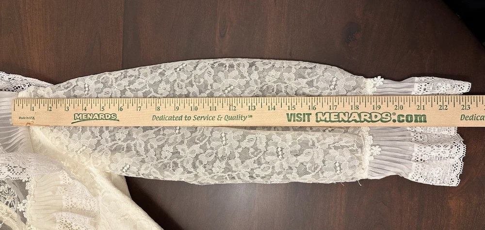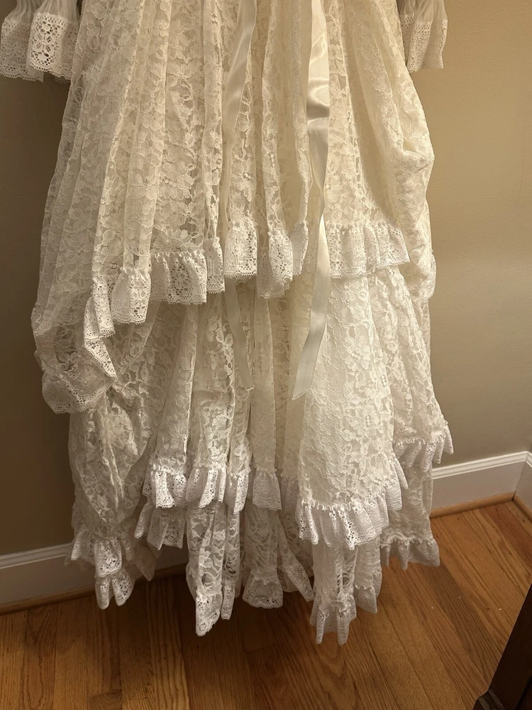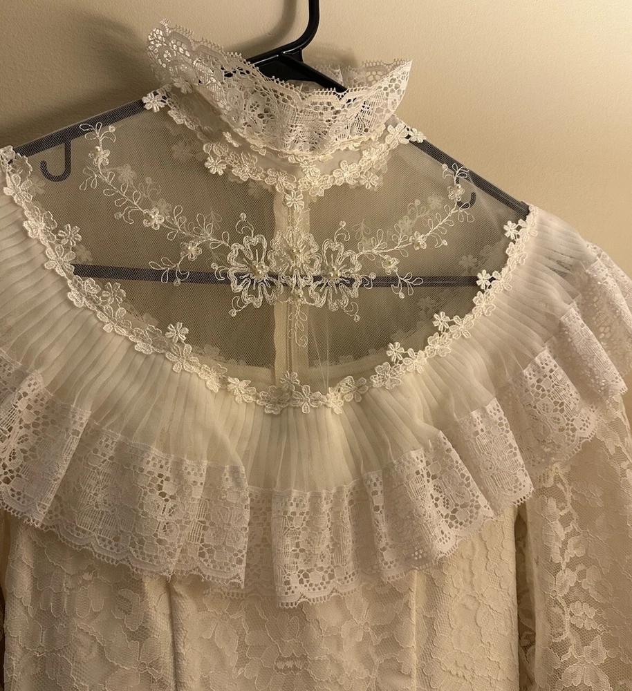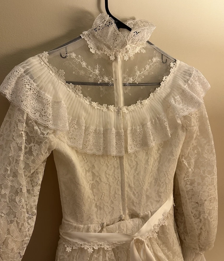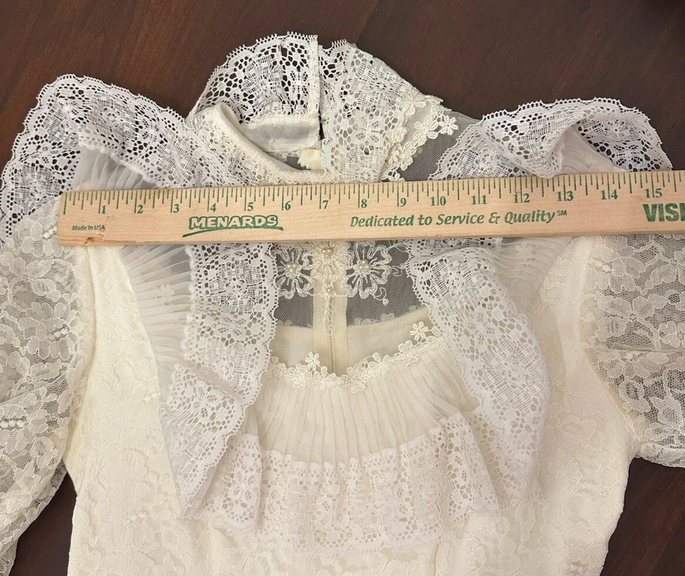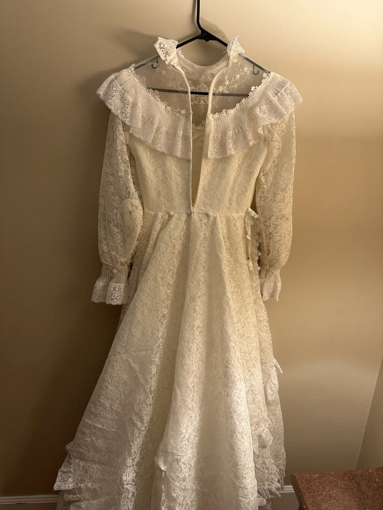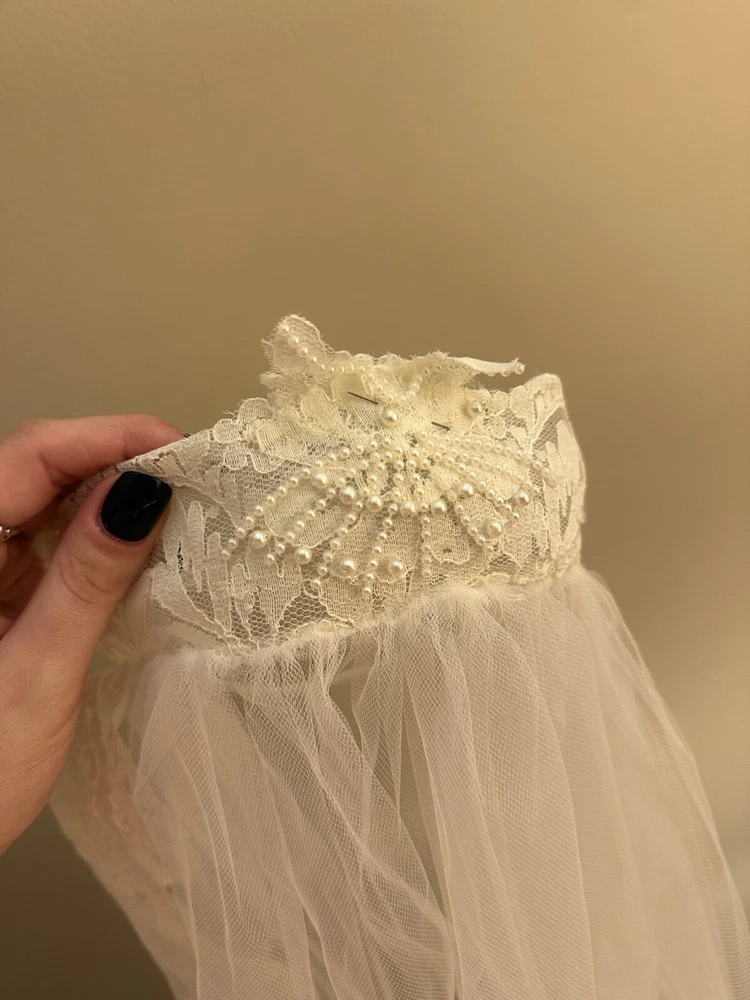 Beautiful vintage wedding gown and veil. Excellent condition! The hem of the lining is a little dirty as shown in photos. there is a very small black mark on the back near the zipper. Will be shipped in a box with care! There is no brand or tags on this dress. It is probably close to a size 0. See measurements below and reach out with any questions before purchase! Shoulder to shoulder: 14.5” Waist: 12” Neckline to hem: 56” Waist to hem: 41” Waist to hem of train (train length): 67.5” Veil length: 48.5” Arm length: 23”