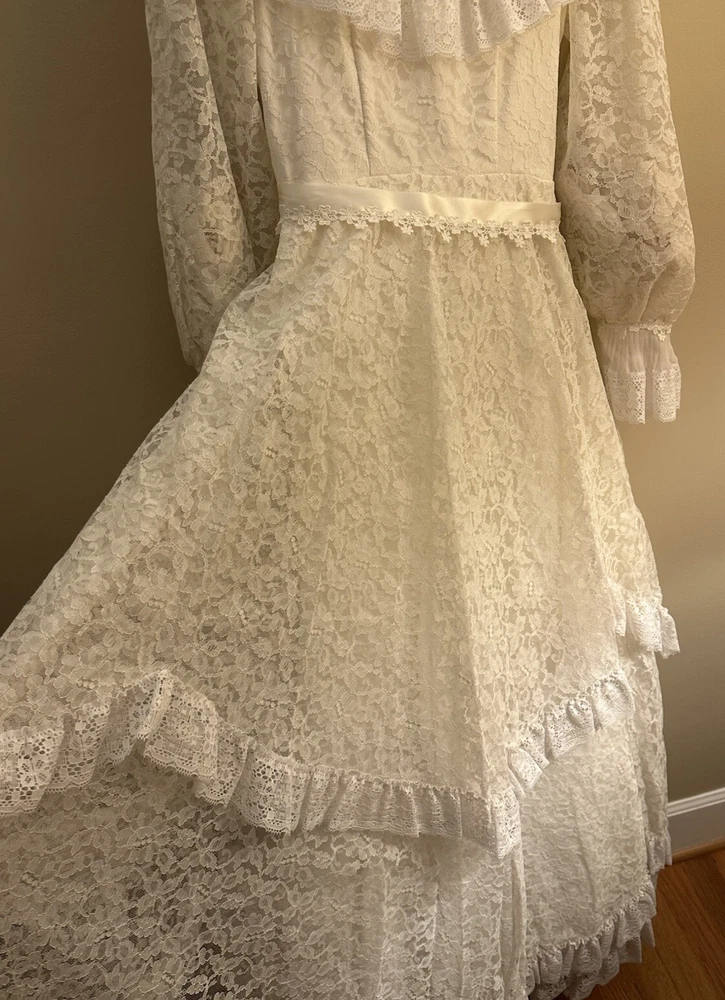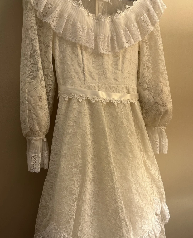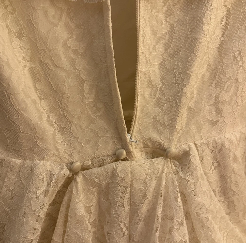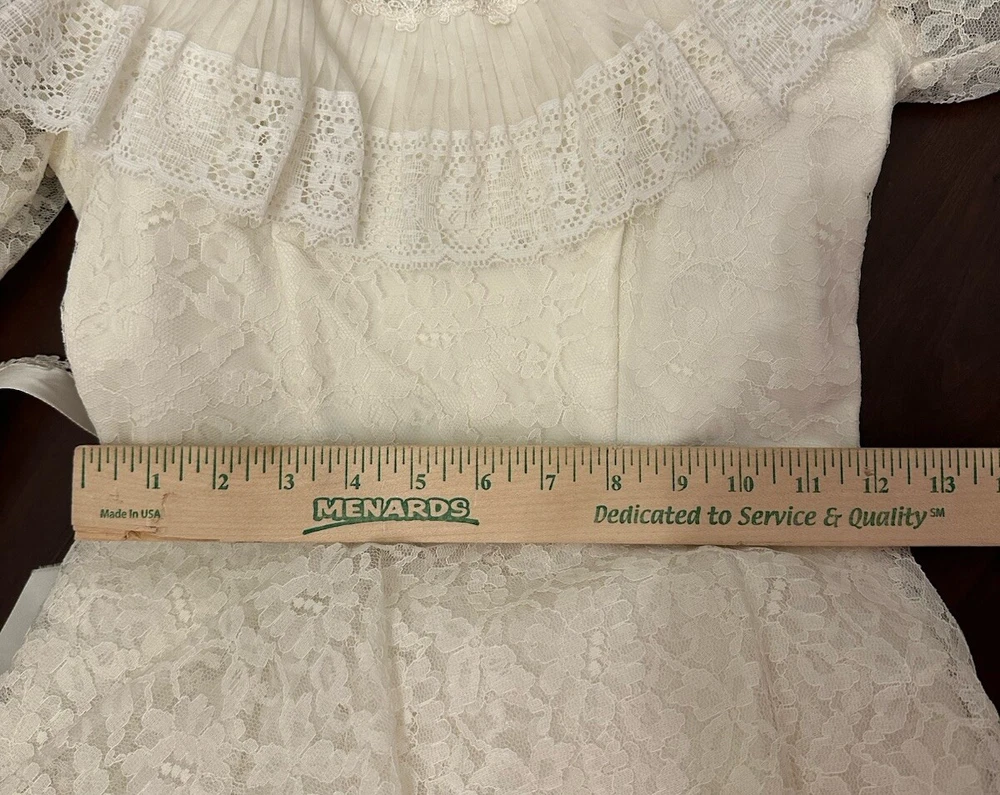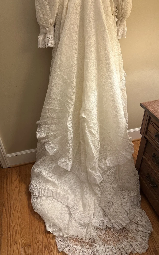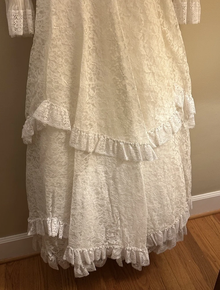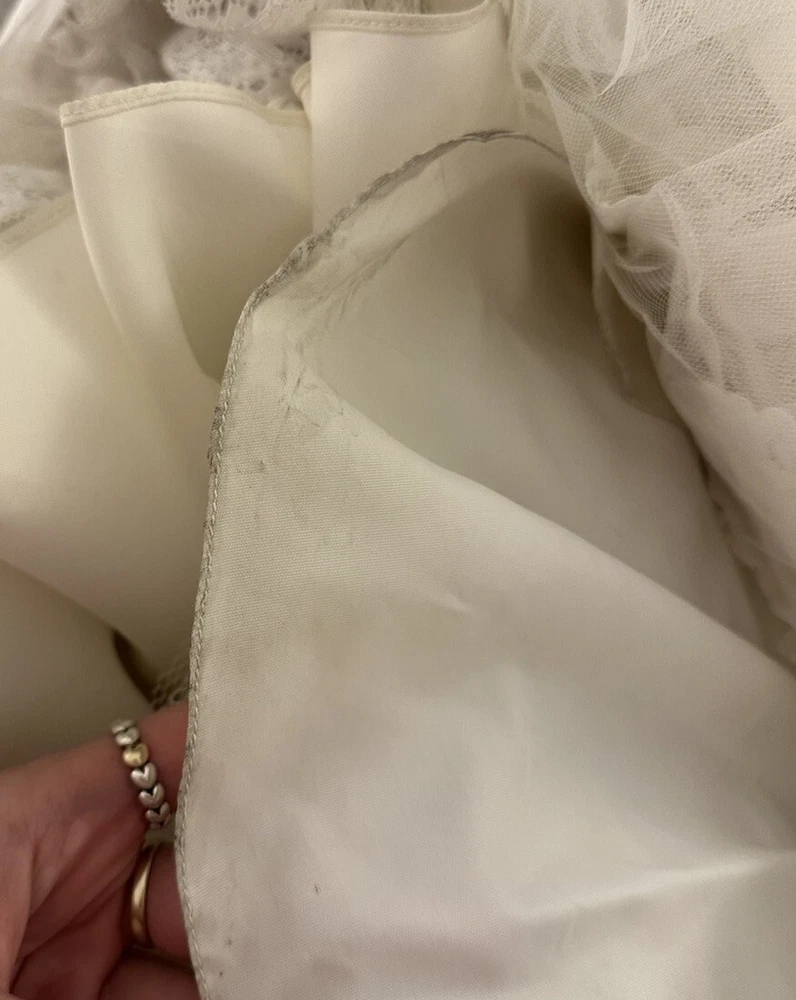 Beautiful vintage wedding gown and veil. Excellent condition! The hem of the lining is a little dirty as shown in photos. there is a very small black mark on the back near the zipper. Will be shipped in a box with care! There is no brand or tags on this dress. It is probably close to a size 0. See measurements below and reach out with any questions before purchase! Shoulder to shoulder: 14.5” Waist: 12” Neckline to hem: 56” Waist to hem: 41” Waist to hem of train (train length): 67.5” Veil length: 48.5” Arm length: 23”