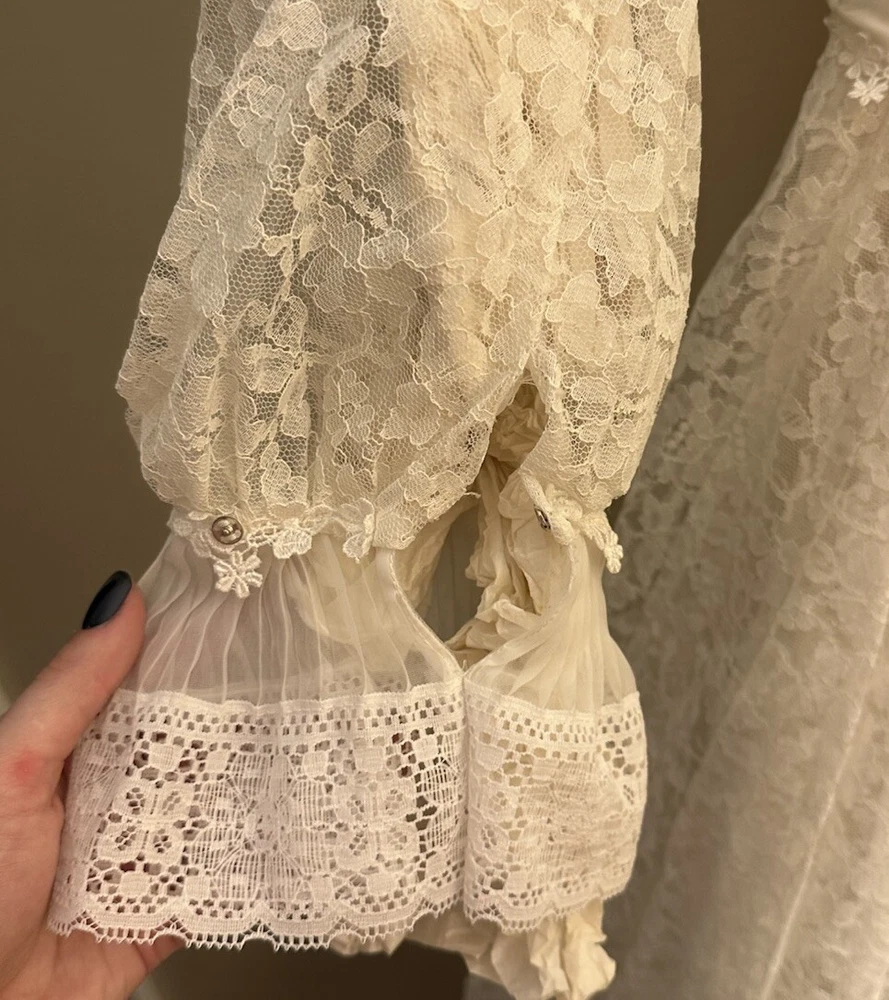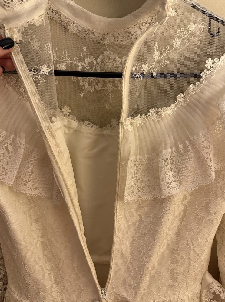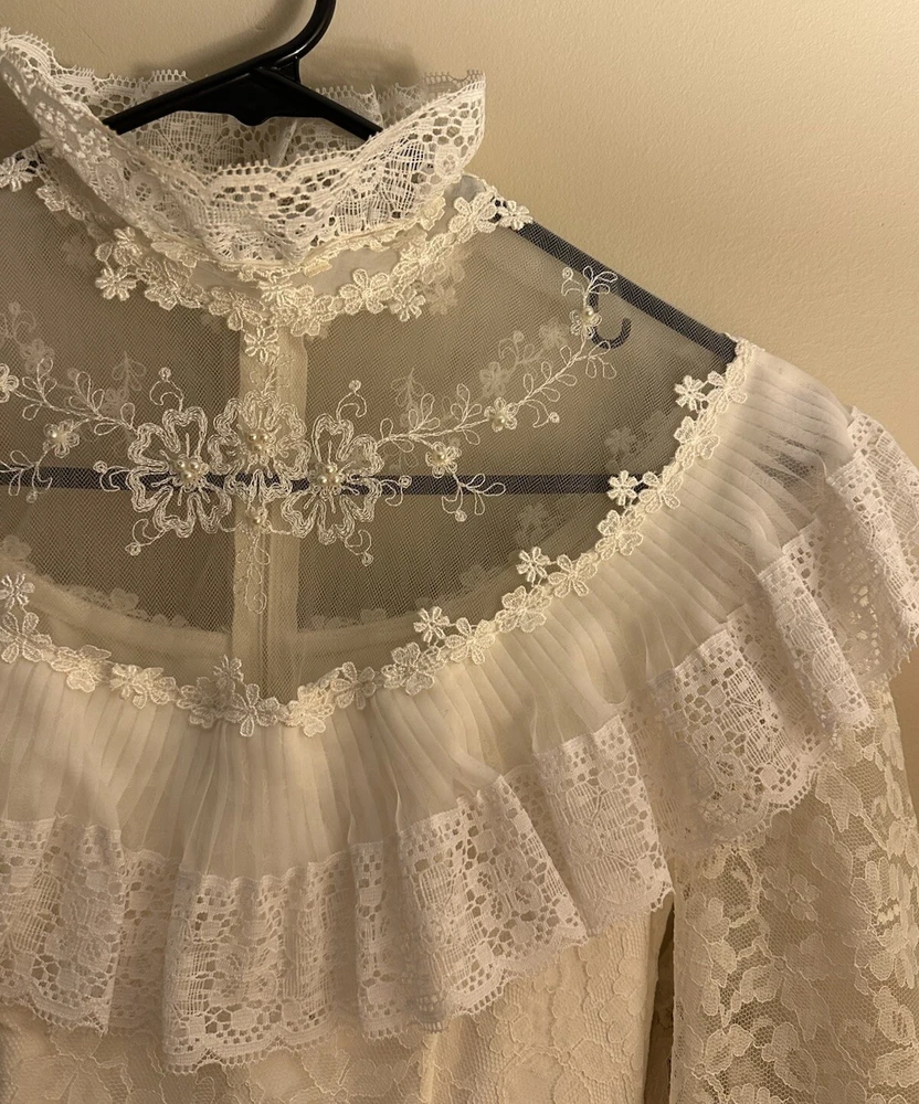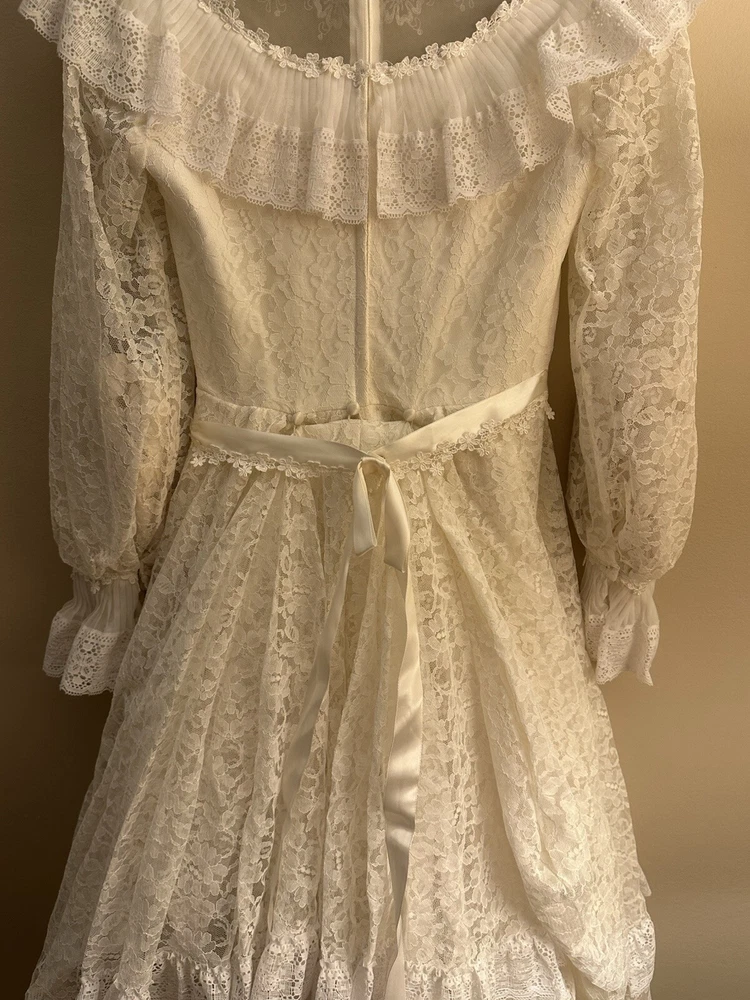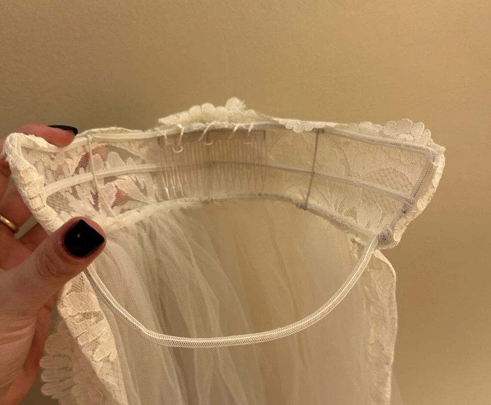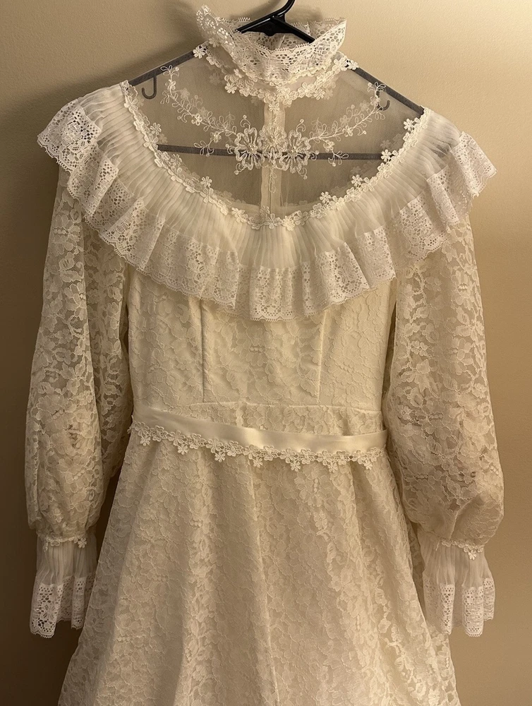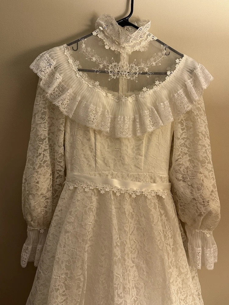 Beautiful vintage wedding gown and veil. Excellent condition! The hem of the lining is a little dirty as shown in photos. there is a very small black mark on the back near the zipper. Will be shipped in a box with care! There is no brand or tags on this dress. It is probably close to a size 0. See measurements below and reach out with any questions before purchase! Shoulder to shoulder: 14.5” Waist: 12” Neckline to hem: 56” Waist to hem: 41” Waist to hem of train (train length): 67.5” Veil length: 48.5” Arm length: 23”