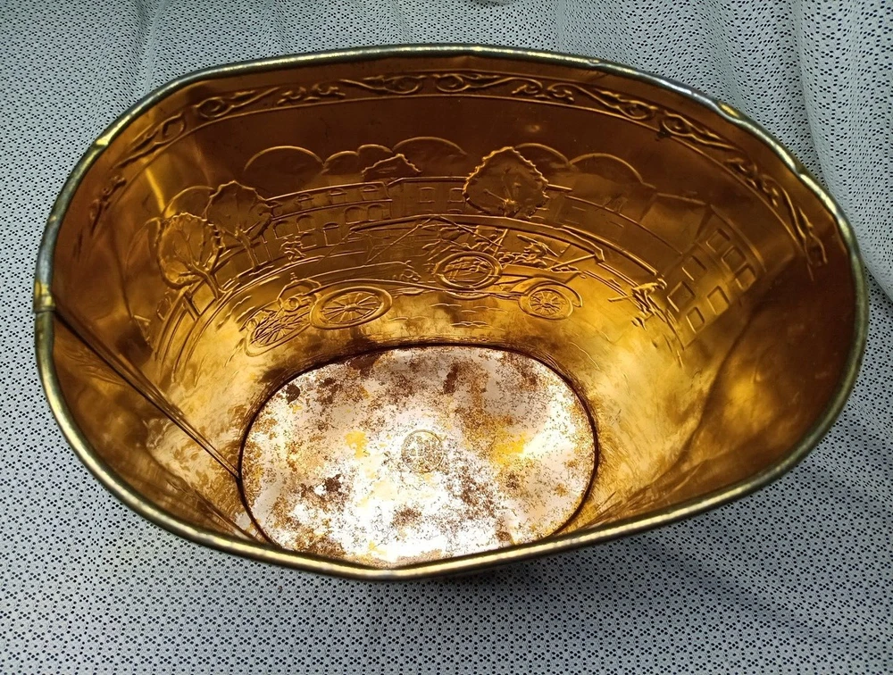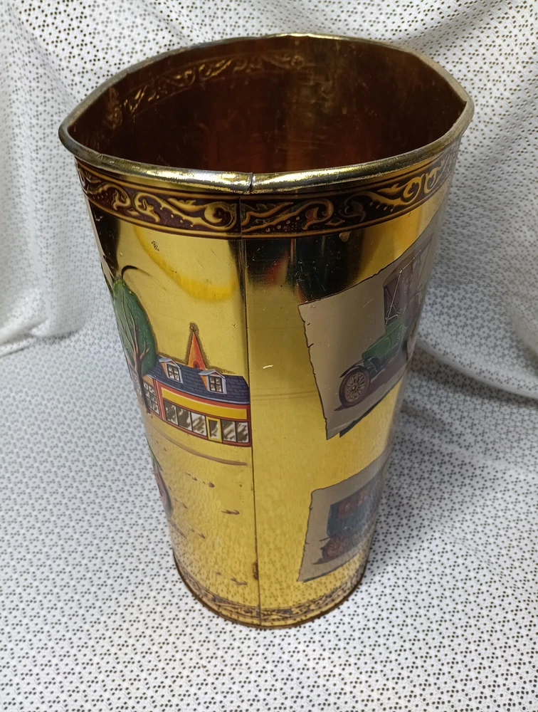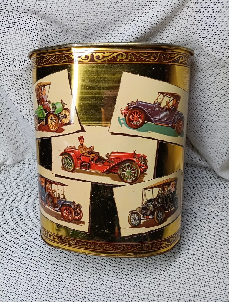 Vintage Weibro Metal Trash Can with Old Jalopy / Antique Car Images. Approx 13" X 10,5" X 7". Some minor surface rust in bottom of can, A few dings and dents, nothing major. See Pictures. Nice Bright color. Has been properly cleaned.