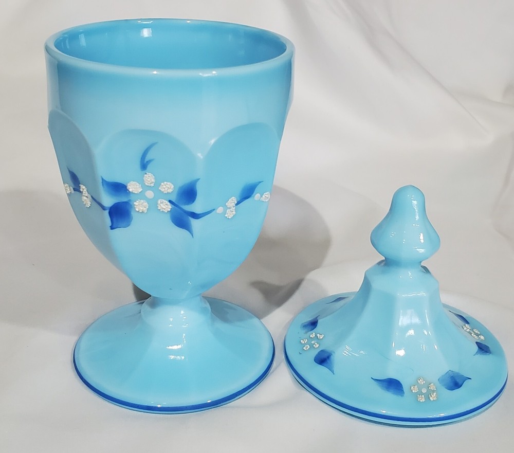 This elegant Westmoreland milk glass covered compote or candy dish, is hand painted with delicate white daisies. It is signed by the artist, R (or L) Drury, 1979. The interior of the lid is also signed. The height is 8" to the top of the finial, the bowl diameter is 3 3/8" and the foot is 3 1/8". The condition is good, no issues that I can find.