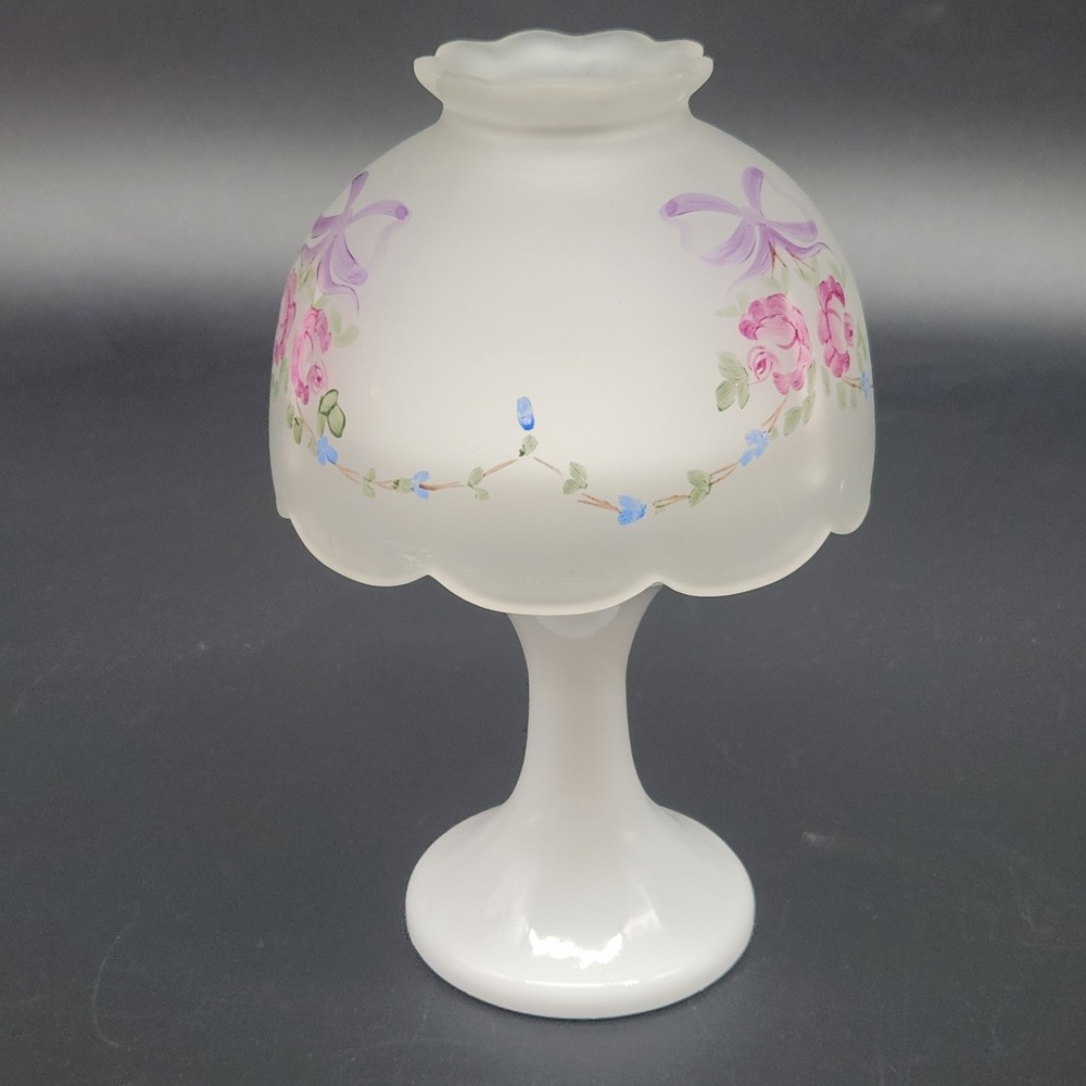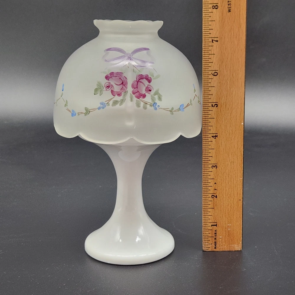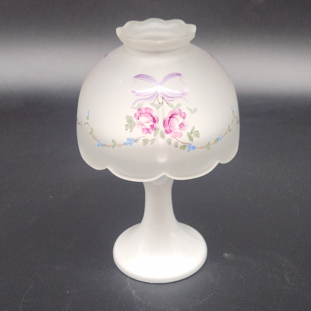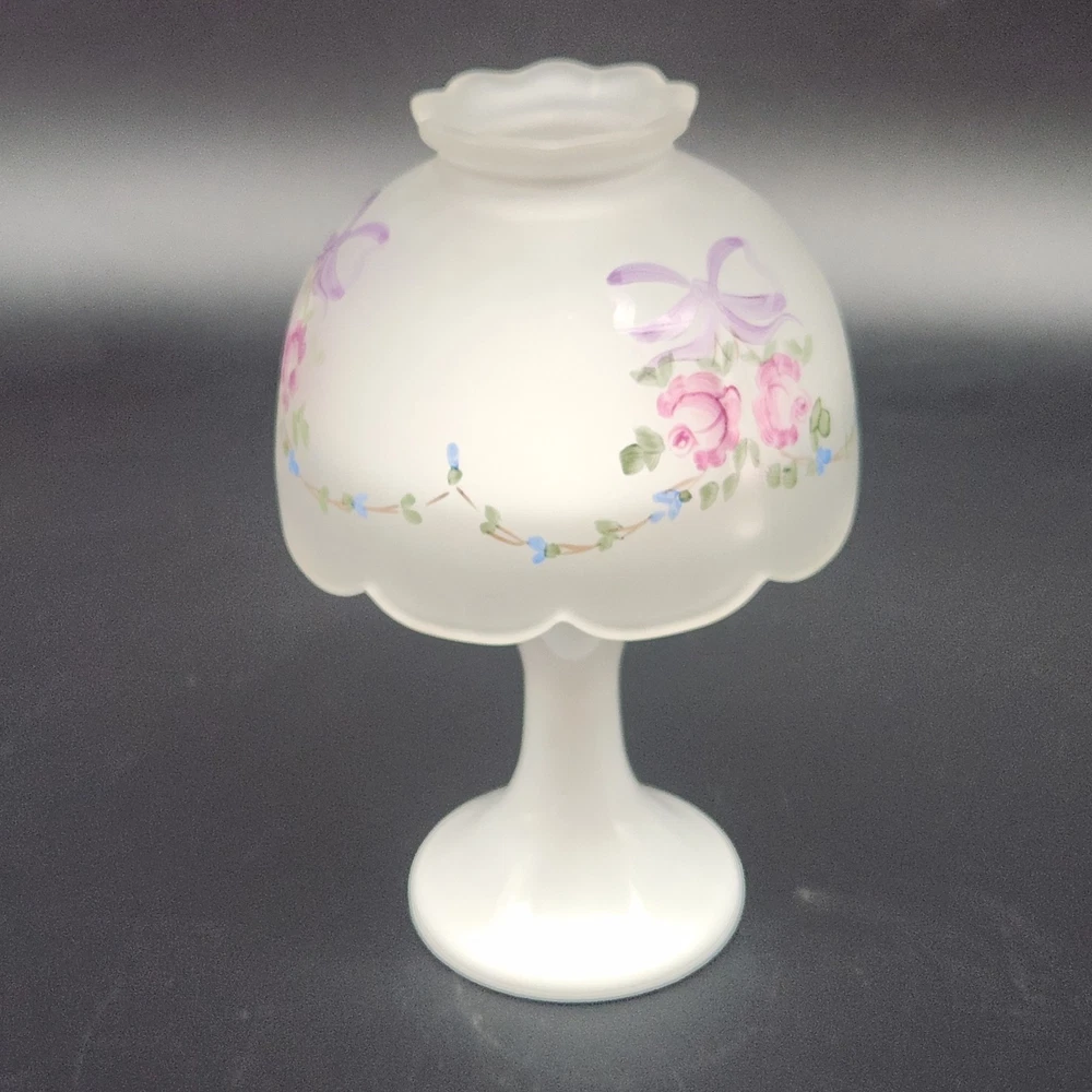 A vintage Westmoreland fairy light featuring hand-painted roses and bows on frosted milk glass. This elegant piece emits a warm, nostalgic glow when a votive or tea light is added. • Hand-painted floral and bow details • Frosted milk glass construction • Measures approximately 7.5 inches tall • Vintage collectible piece Used but in very good condition for its age. A few tiny surface scratches on the frosted glass. See photos for details.