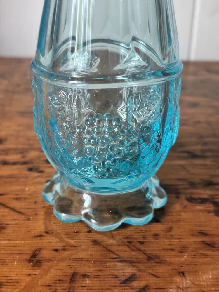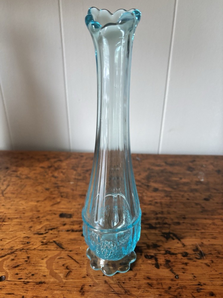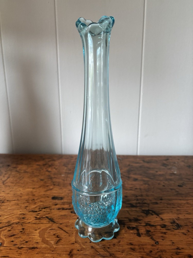 Westmoreland swung vase , paneled with grape leaves and bunches design Teal Aqua light blue 11.5” h base is 2.5” Perfect condition no glass sickness or chips Experienced packing and fast shipping