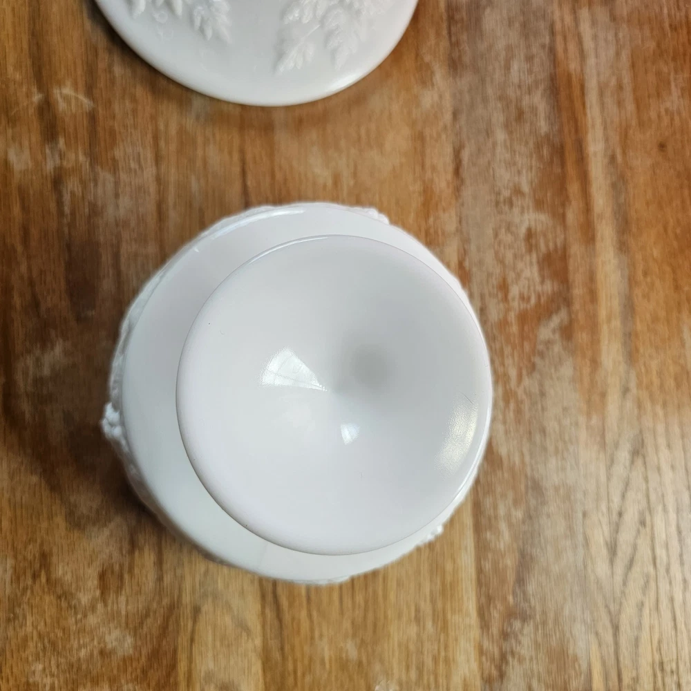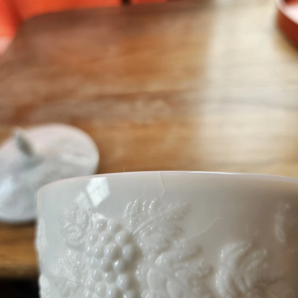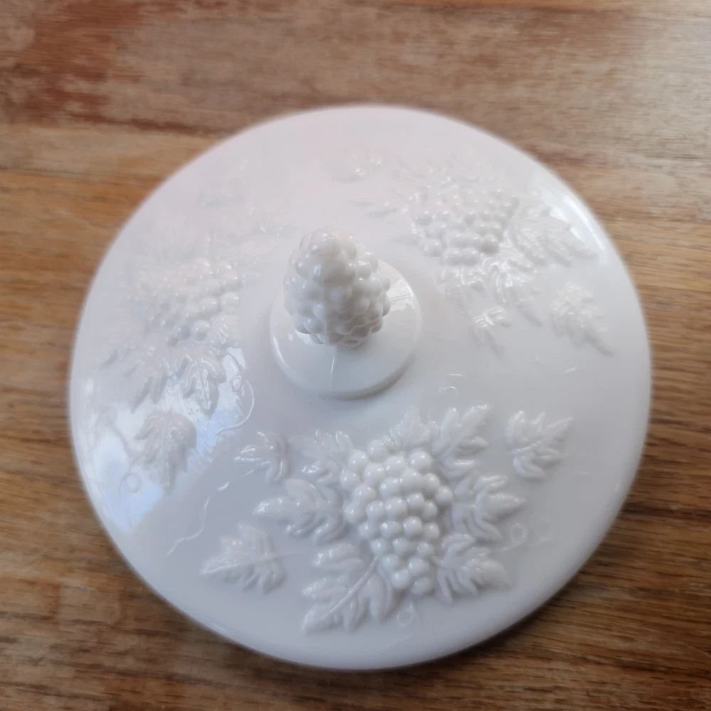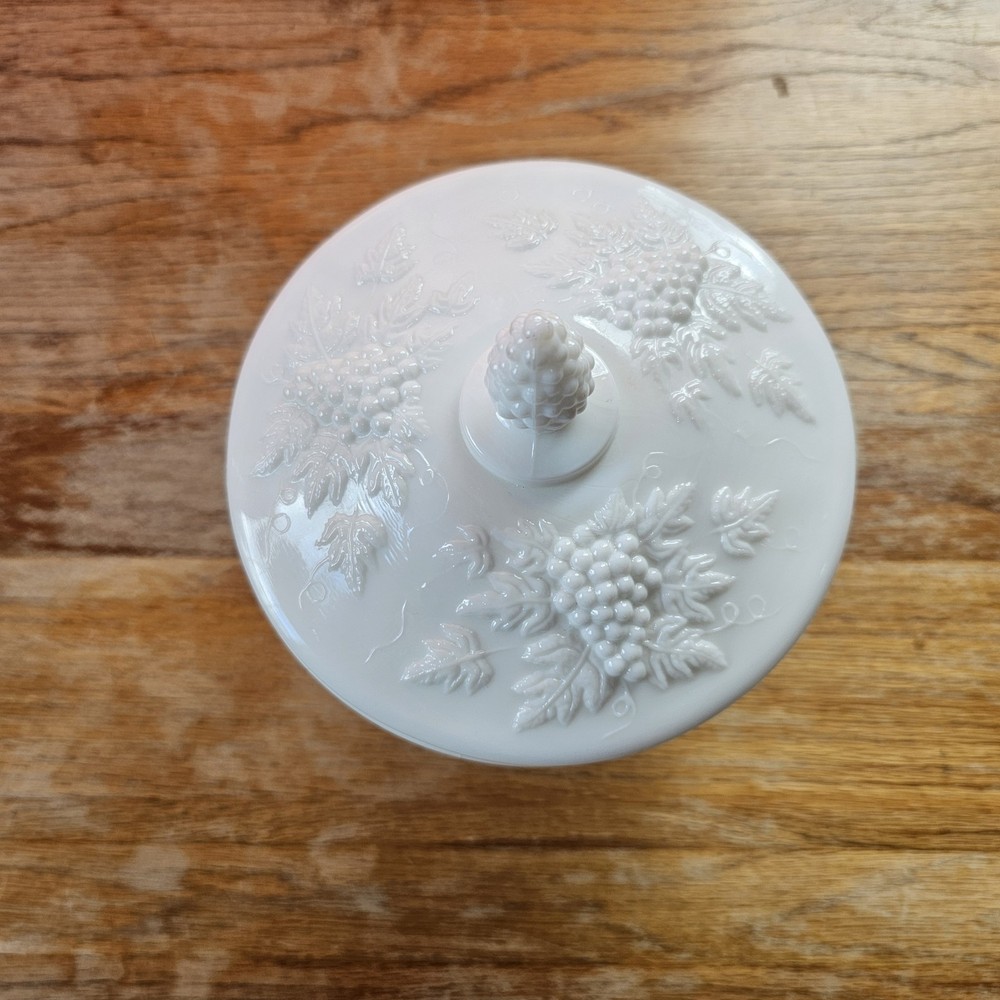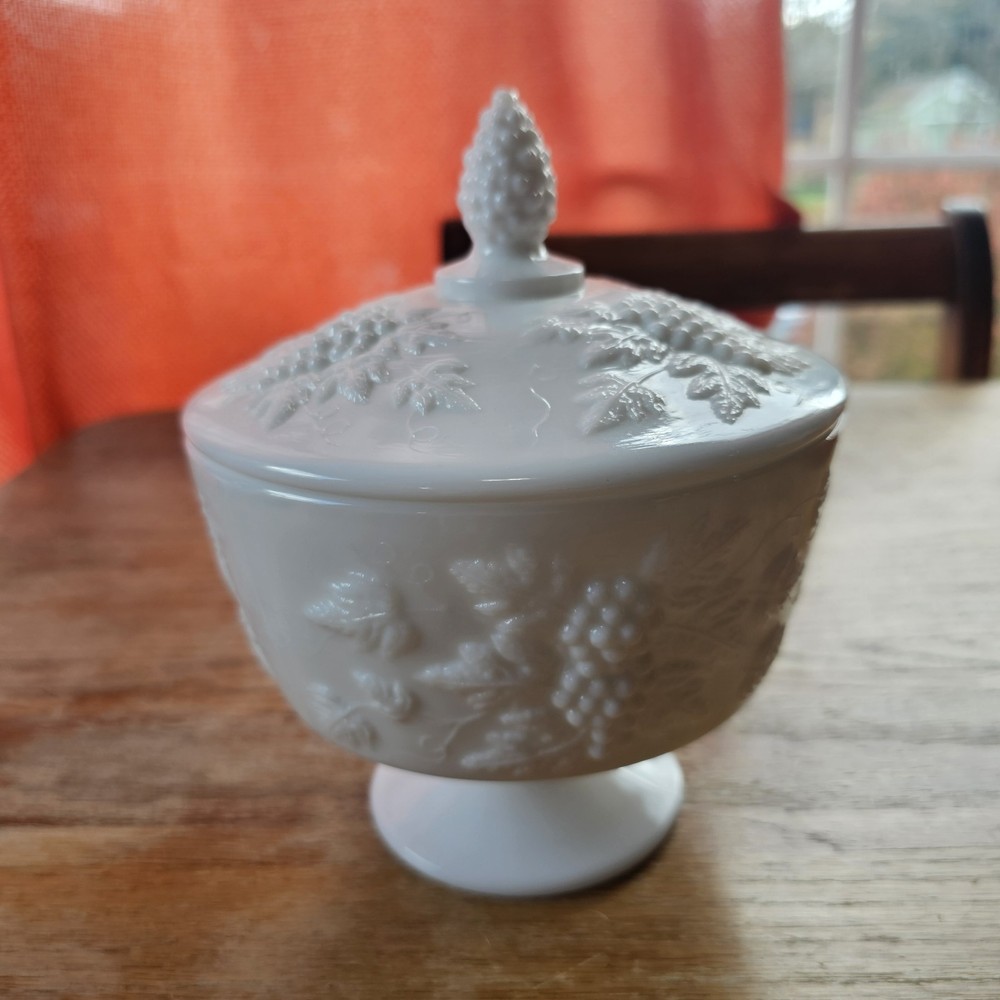 Vintage Westmoreland Milk Glass Grapes Candy Dish Milk Glass Compote Dish with Lid. Shorter Pedestal. Rounded. Grapes design. Beautiful for decor or a collection. No Chips. One small crack, not breaking through though. A couple tiny black marks. Excellent Condition.