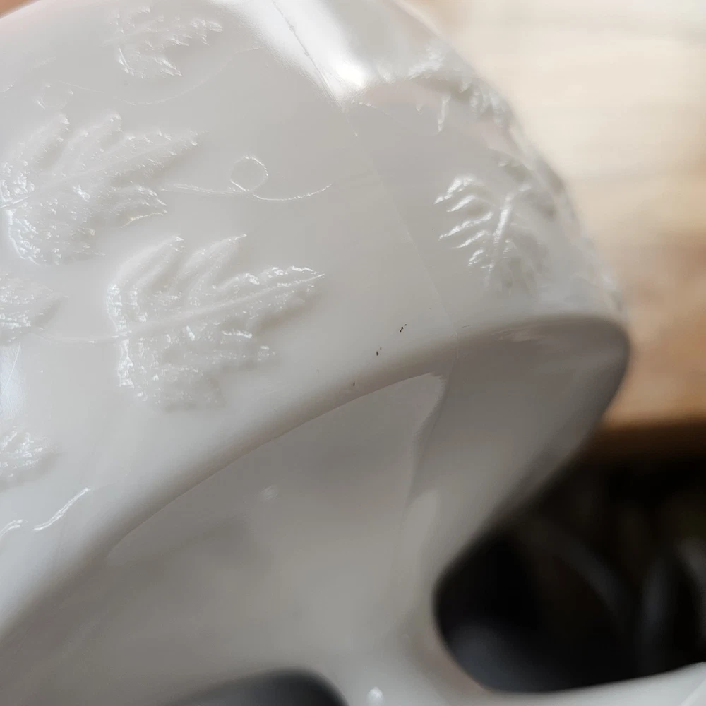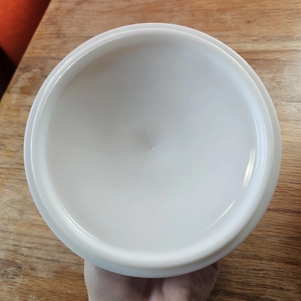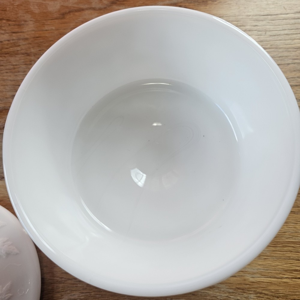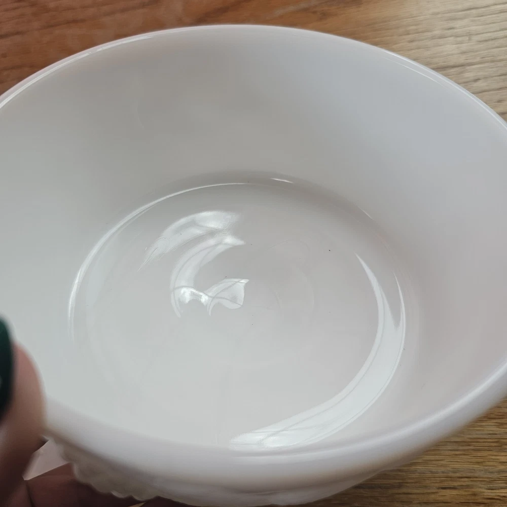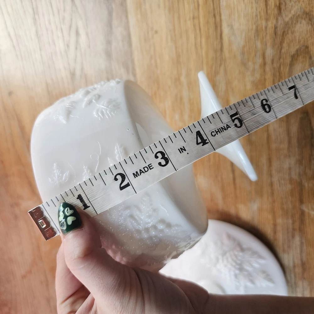 Vintage Westmoreland Milk Glass Grapes Candy Dish Milk Glass Compote Dish with Lid. Shorter Pedestal. Rounded. Grapes design. Beautiful for decor or a collection. No Chips. One small crack, not breaking through though. A couple tiny black marks. Excellent Condition.