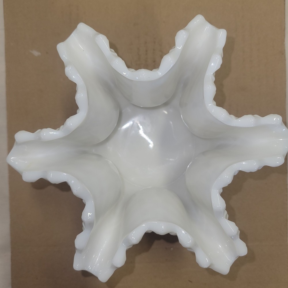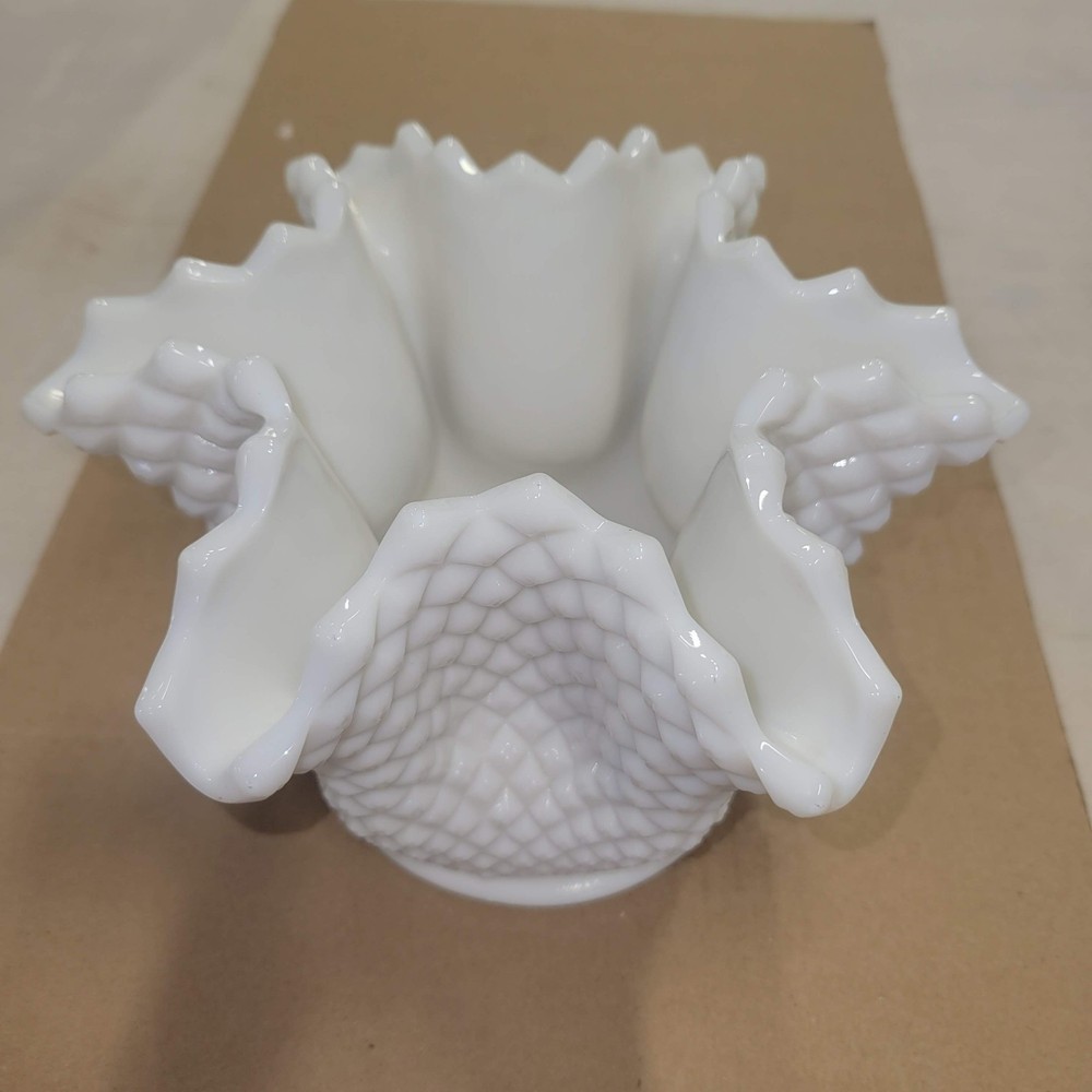 Vintage Westmoreland Milk Glass English Hobnail Diamond Deep Crimp Pinched Vase is a classic piece made of milk glass with an English Hobnail pattern. The vase features a deep crimp pinched design, adding a touch of elegance to any space. Made by Westmoreland, known for their high-quality glassware, this vintage piece is a beautiful and timeless addition to any collection. Very clean and in great condition.