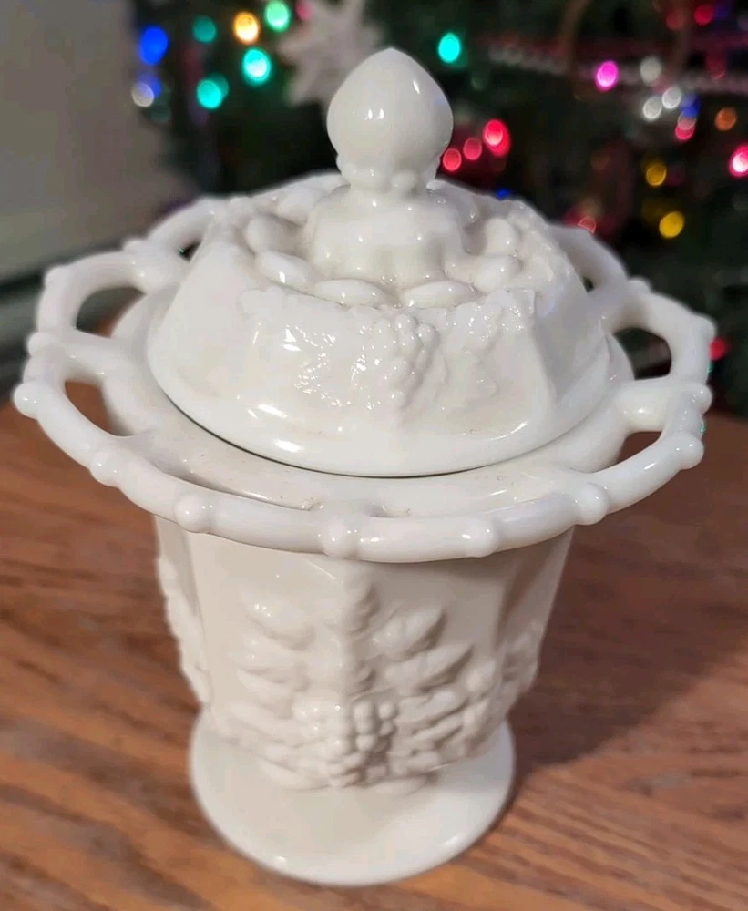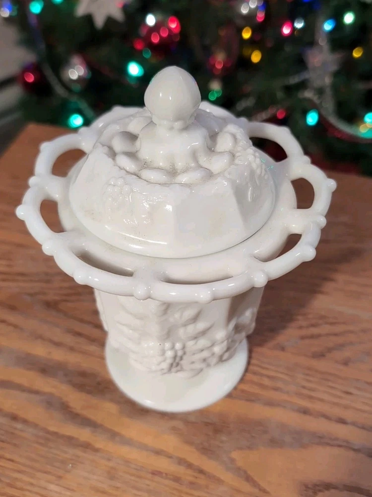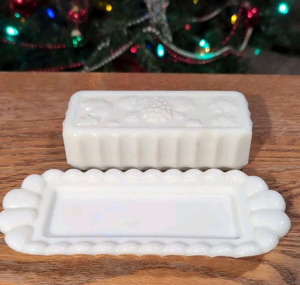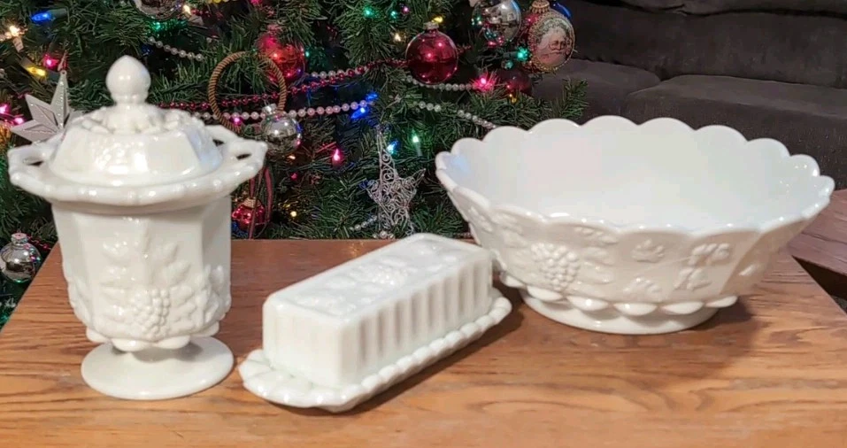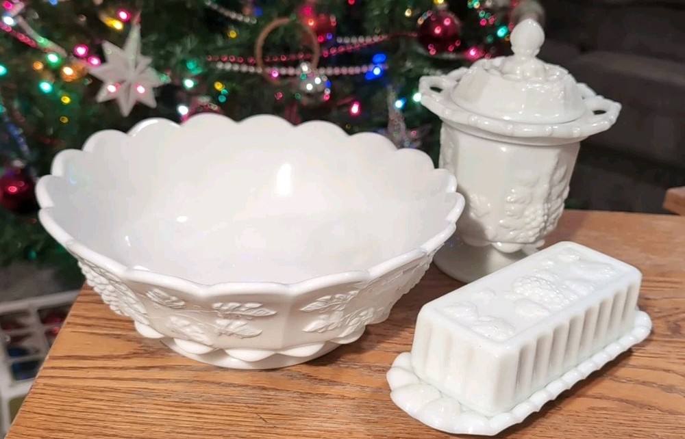 Vintage Westmoreland Paneled Grape Milk Glass pieces. Bowl, Candy Dish, And Butter Dish. No cracks or breaks. Beautiful condition! Would look wonderful with any decor.