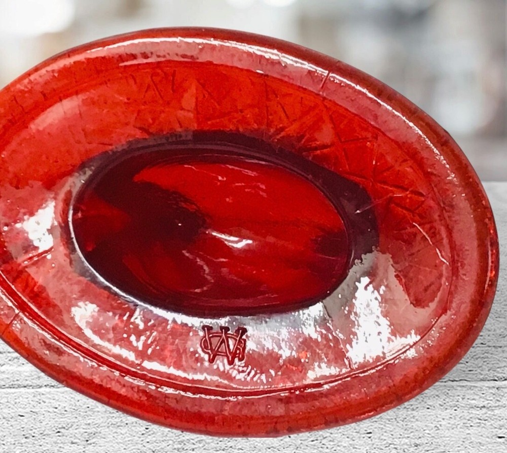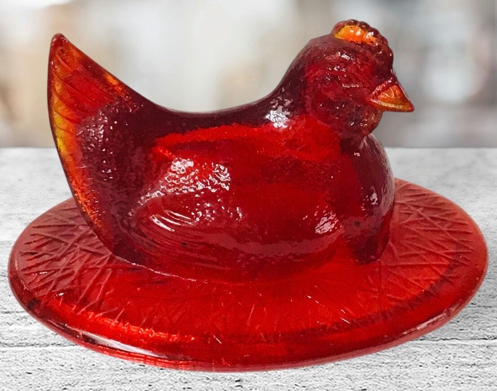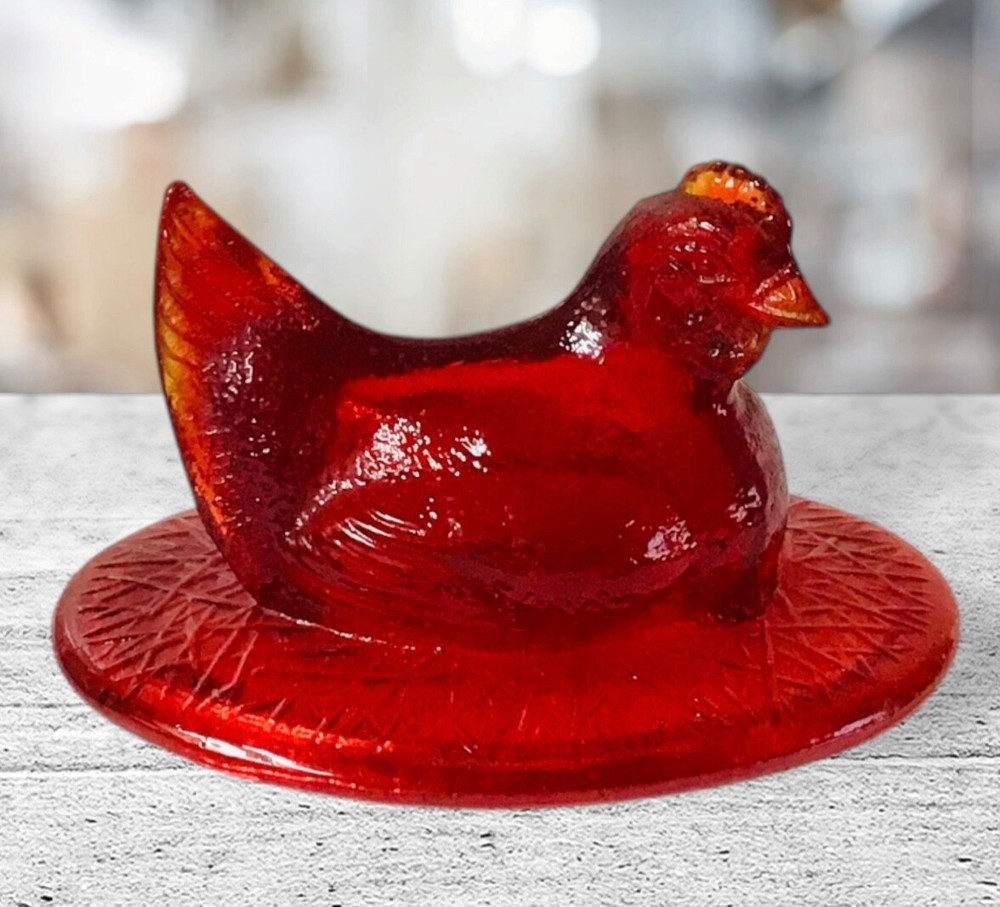 Pattern: Hen On A Nest Type: candy dish lid Shape: Oval Original/Licensed Reproduction: Original Color: Red Country/Region of Manufacture: United States Vintage: Yes Material: Glass Origin: Indiana Production Style: Ruby Glass Brand: Westmoreland Finish: Ruby Stained Glass