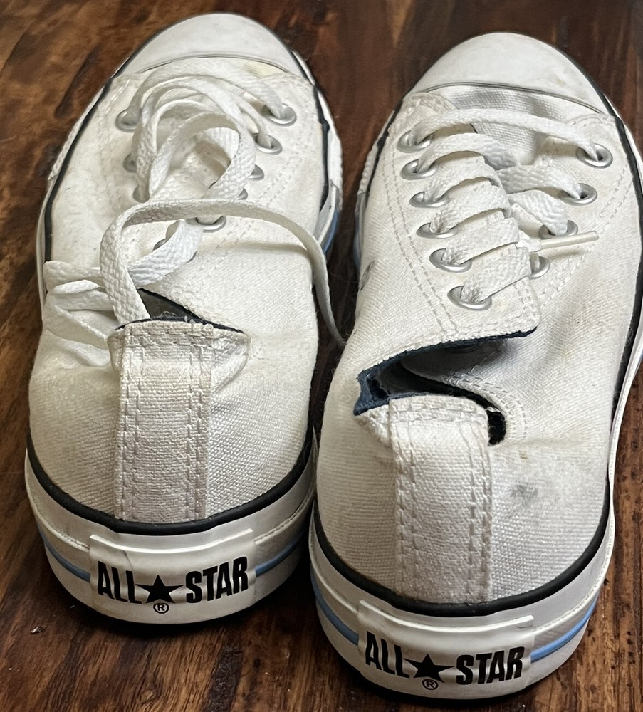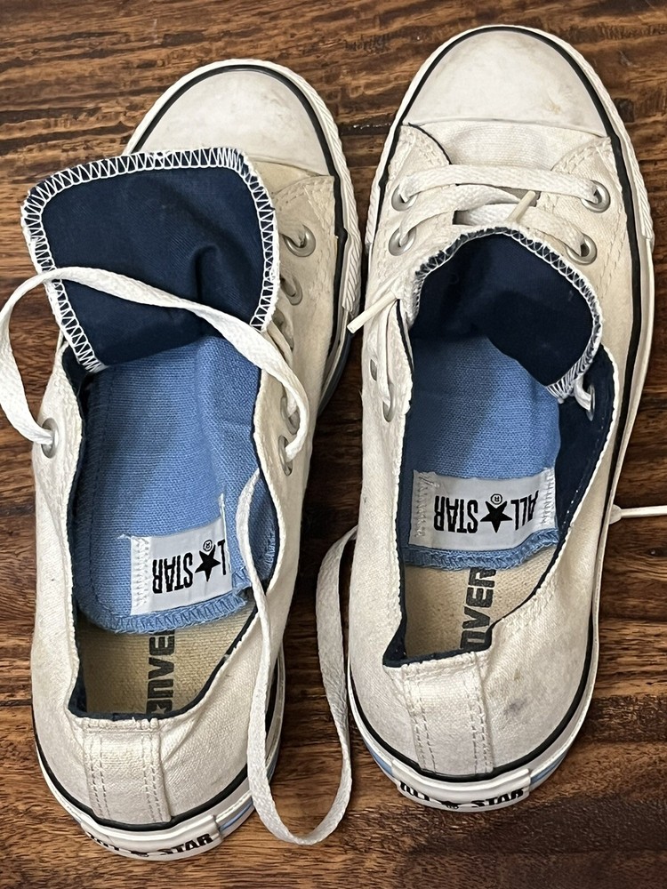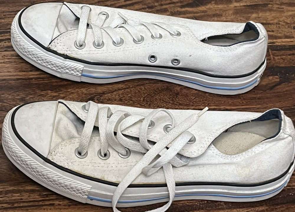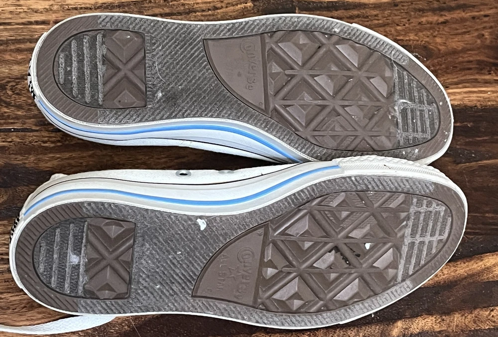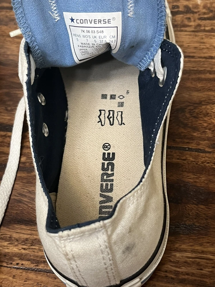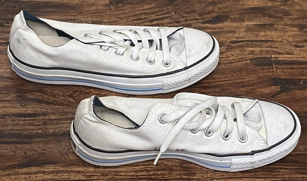 Converse All Star White Shoes Low Top Women’s 7 Blue Tennis Canvas Sneaker Men 5. Please view images. Overall the shoes have lighter wear (soles, interior, rubber) but have marks and storage dust on canvas