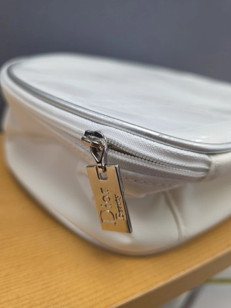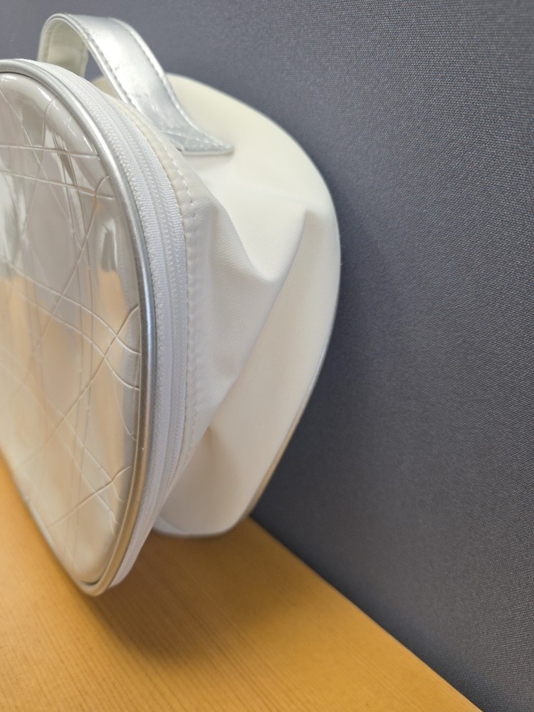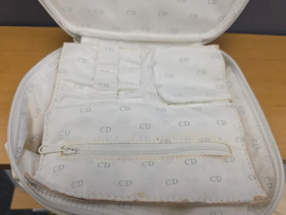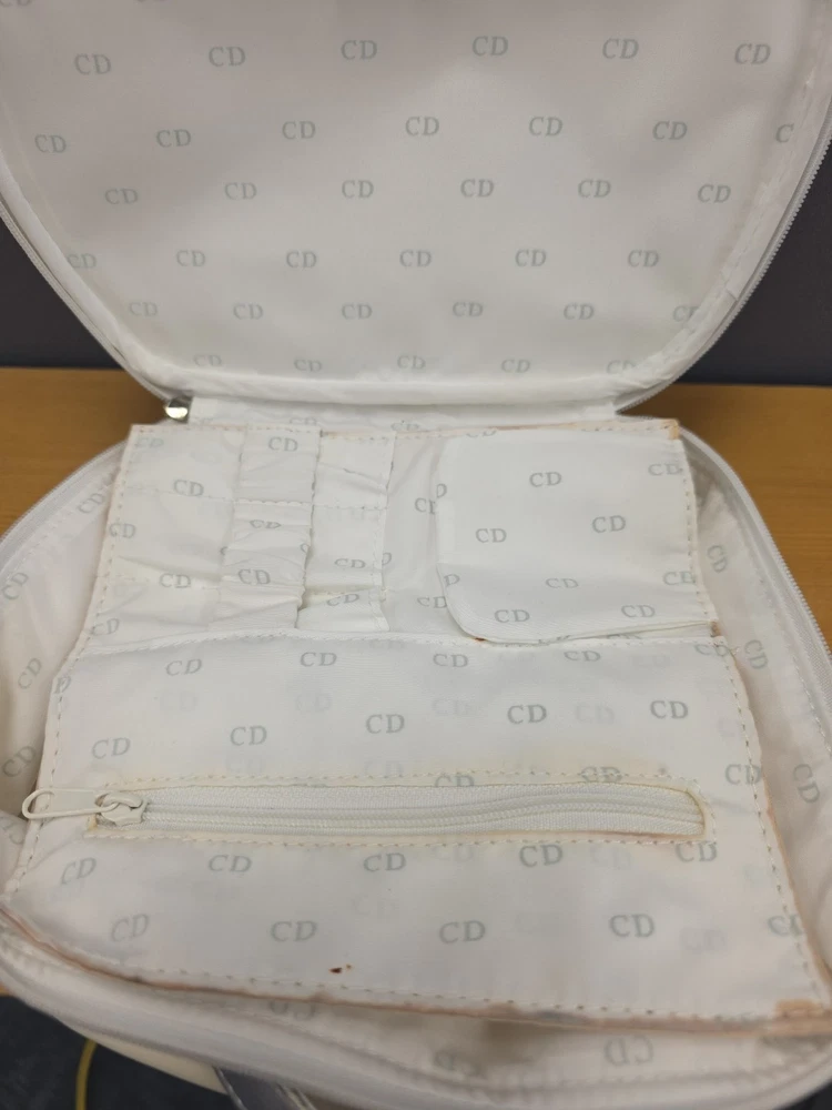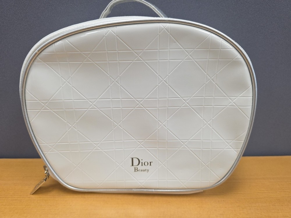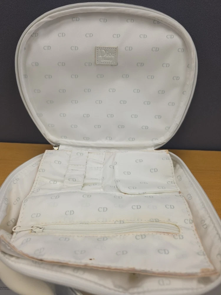 Vintage White Dior Beauty Makeup Bag/Cosmetic Pouch Travel Bag. There is a bit of discoloration on the top outside and the inside. Vintage used condition. Please examine pictures carefully prior to purchase and ask questions if you have any. : )
