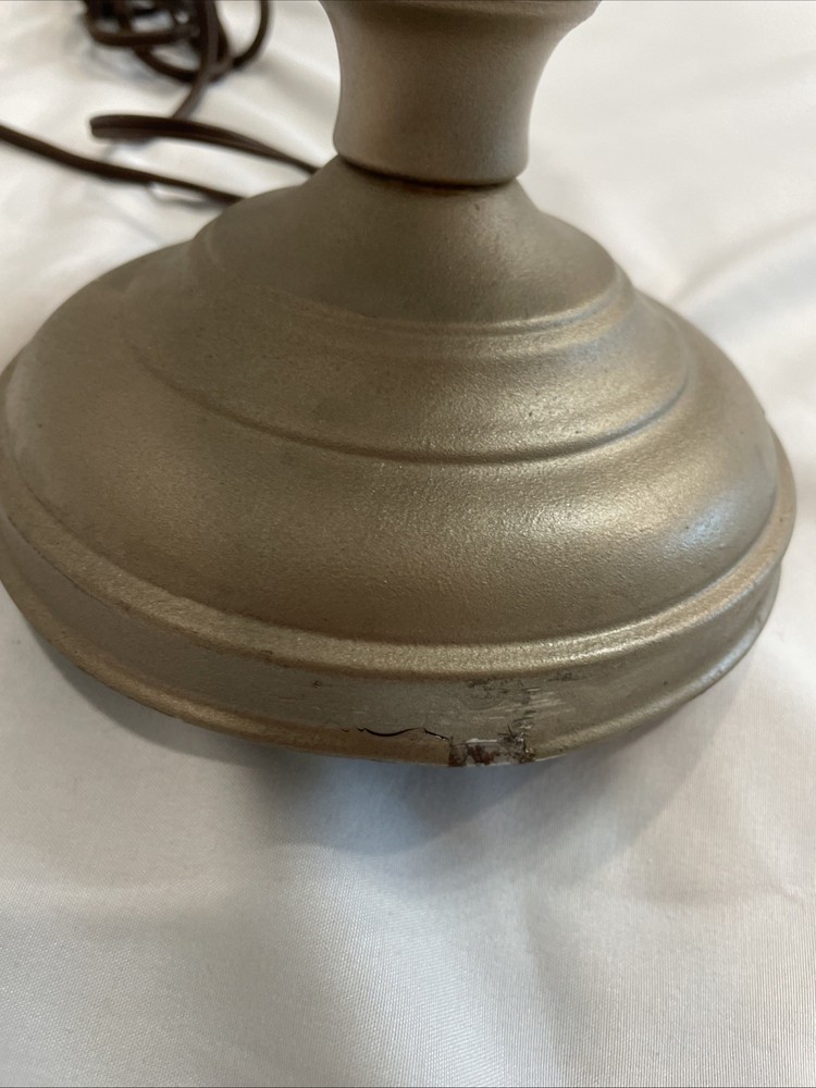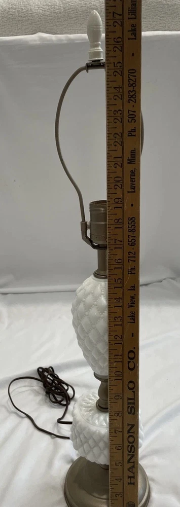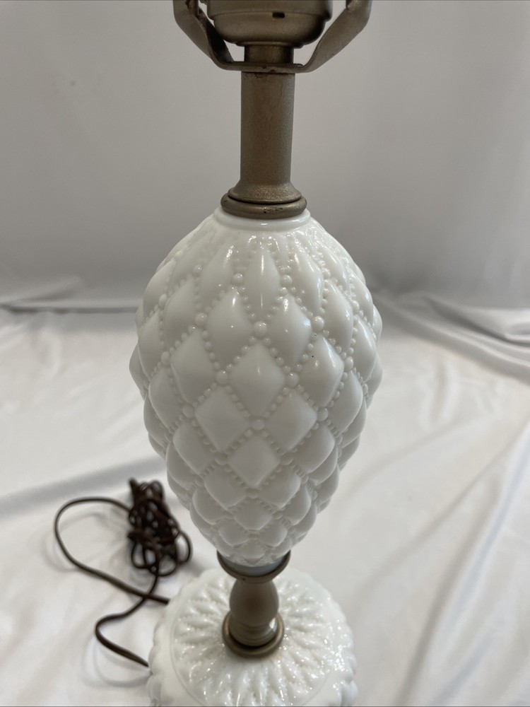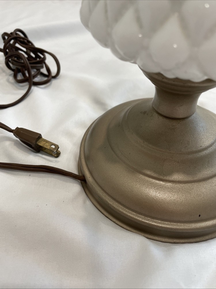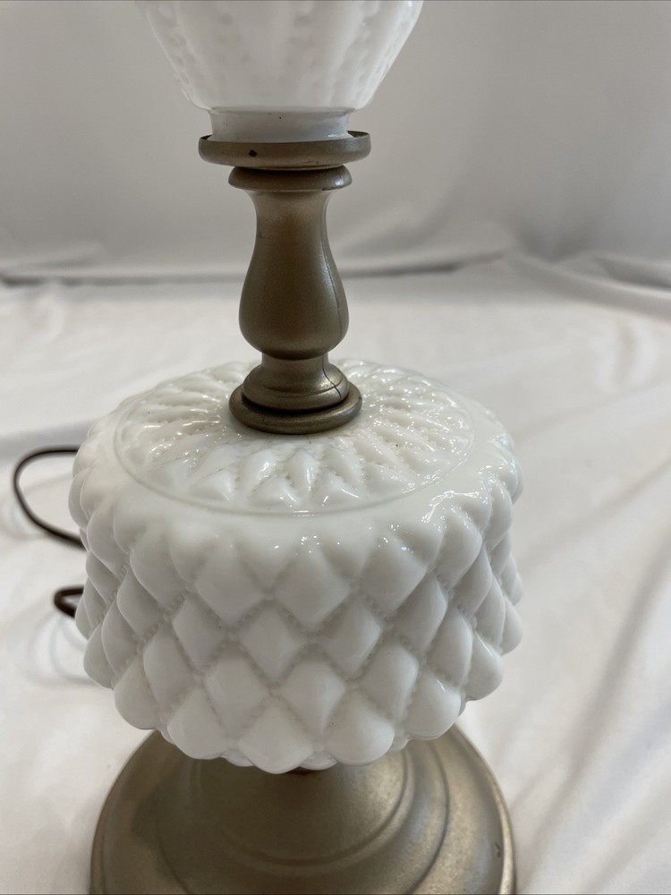 This vintage white hobnail milk glass table, desk, night, or office lamp is a charming and unique piece to add to any space. The elegant design of the lamp, featuring milk glass detailing, adds a touch of retro charm to any room. Perfect for lighting up a workspace or as a functional art piece in a bedroom, this lamp combines style and functionality in a timeless design. Tested and works chipping at the base as shown in pictures