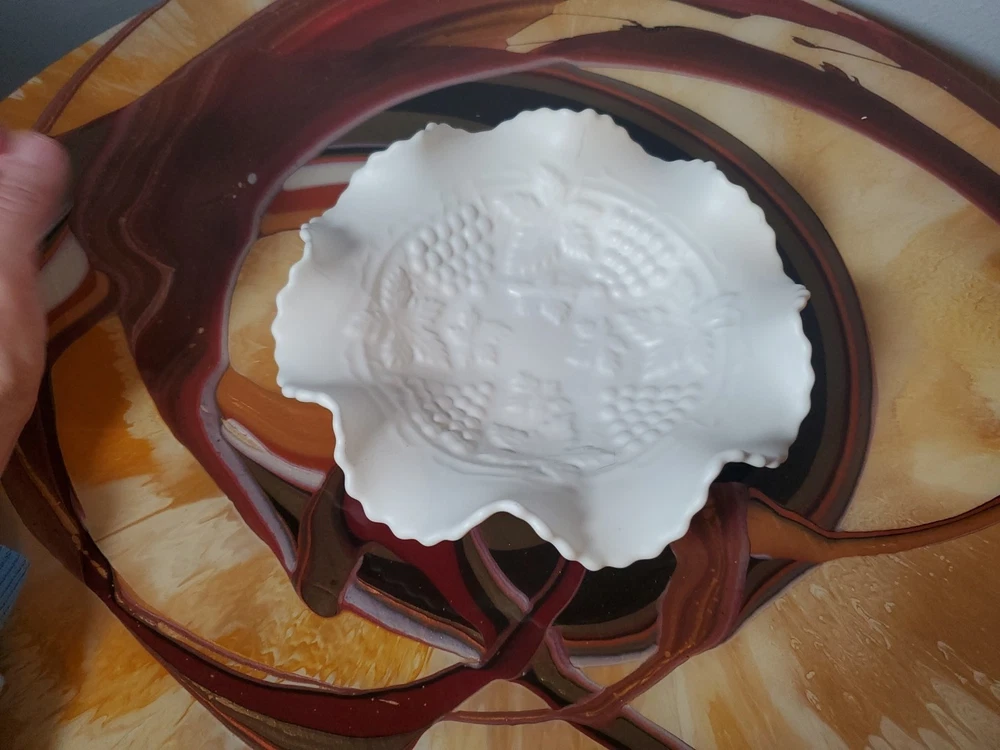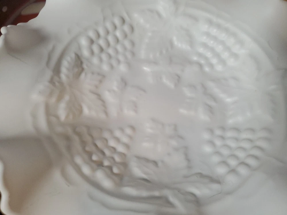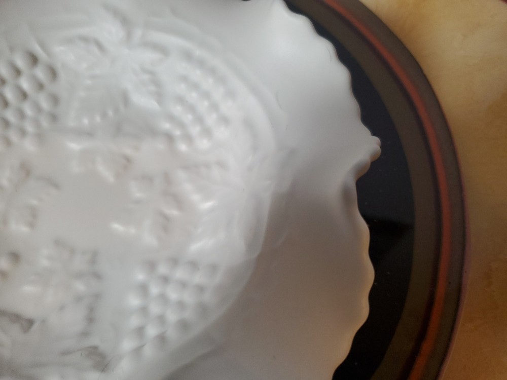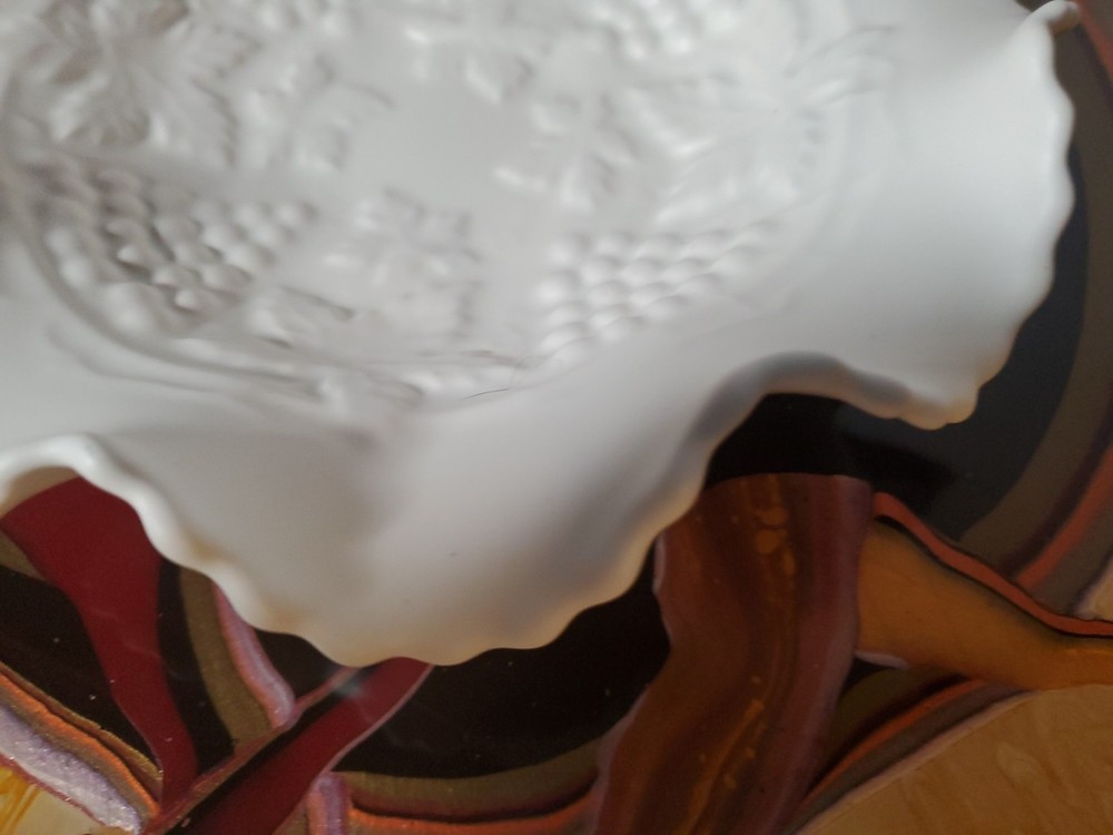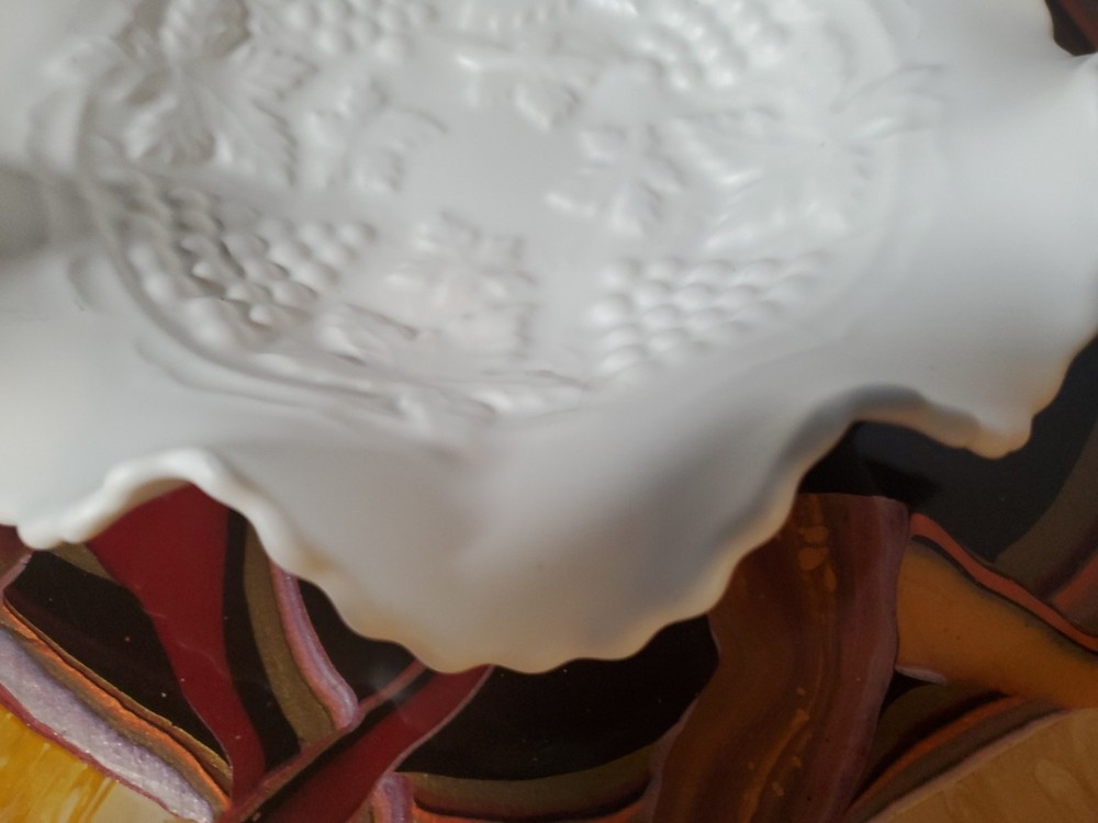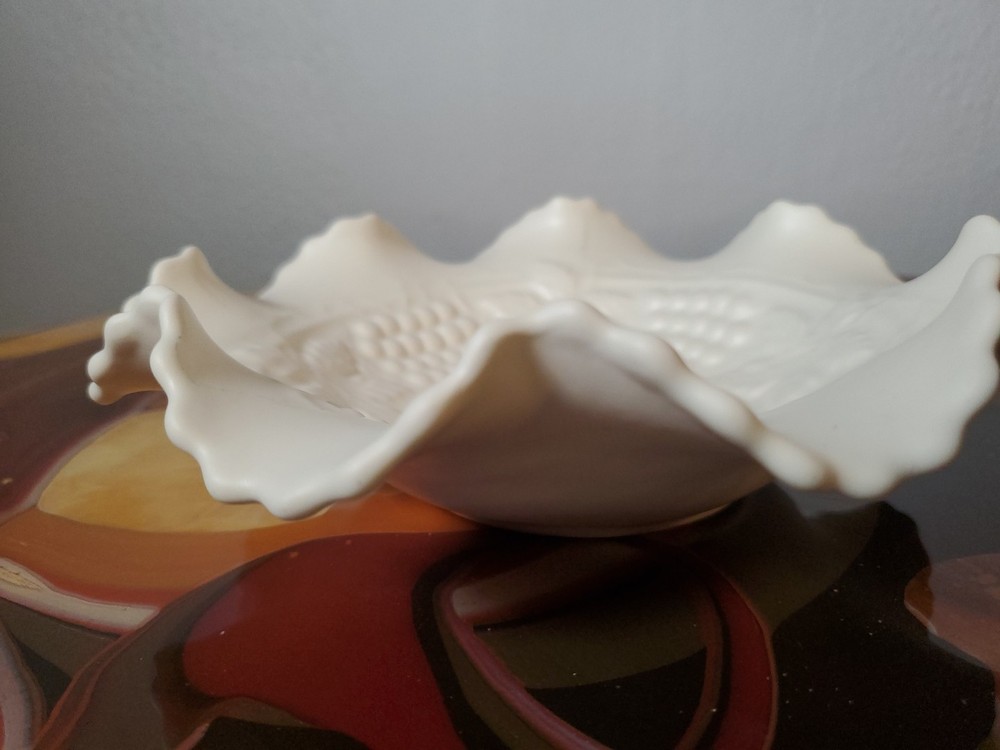 Shape:RoundNumber of Items in Set:1Type:Candy DishVintage:YesMaterial:GlassFeatures:DecorativeNumber of Compartments:1Brand:UnmarkedColor:WhiteTheme:leavesPattern:FloralOriginal/Licensed Reproduction:Original