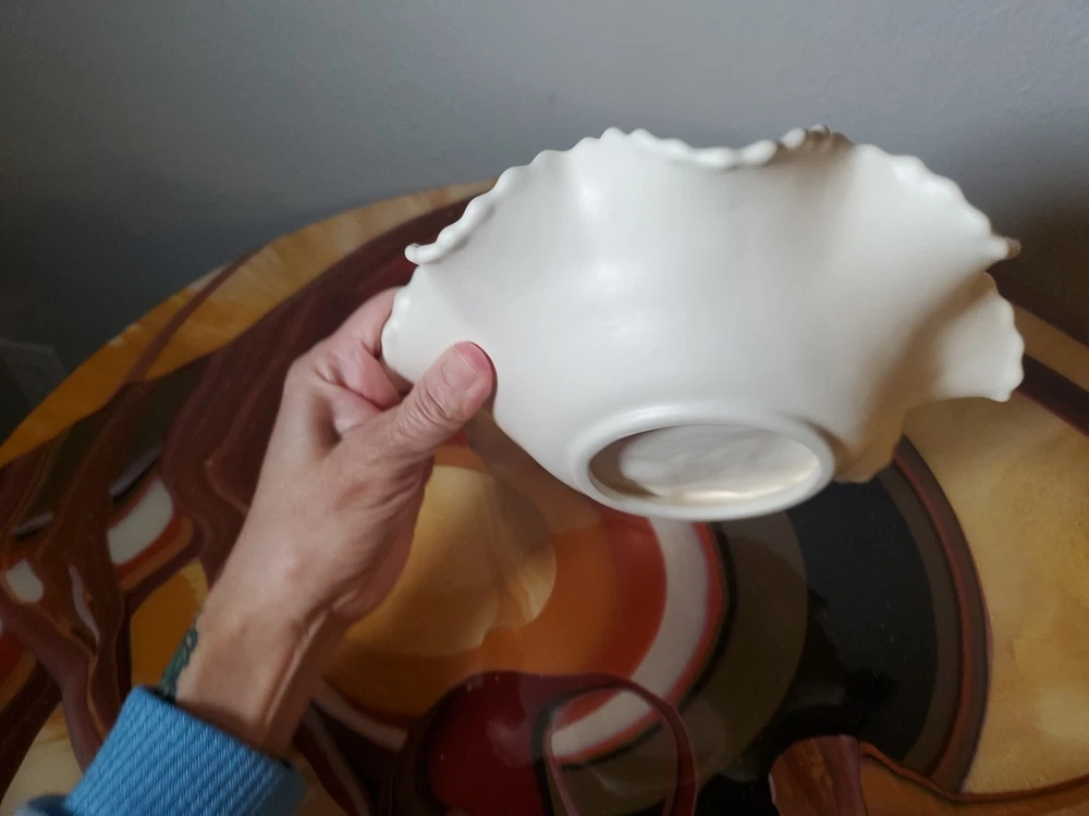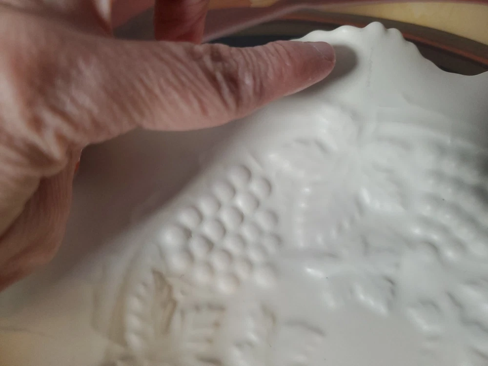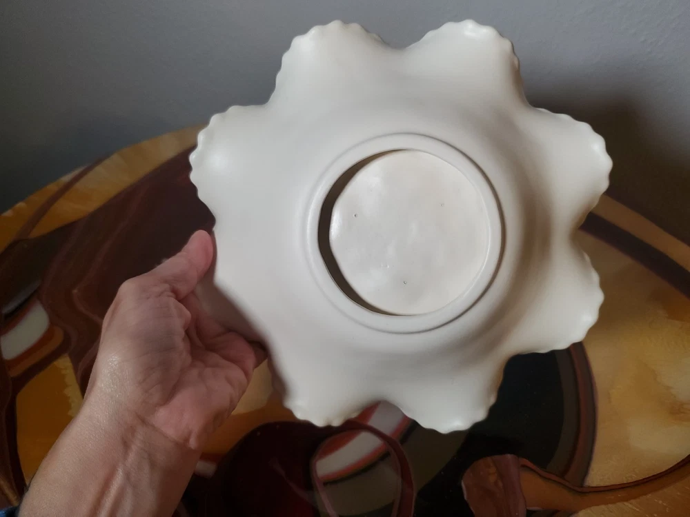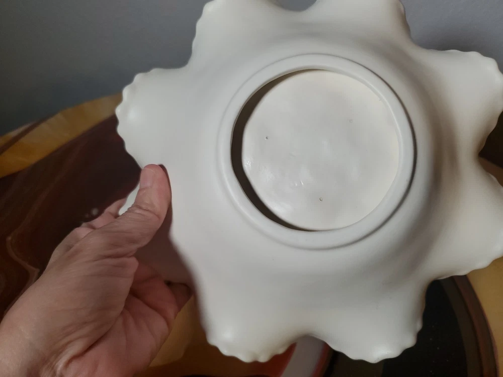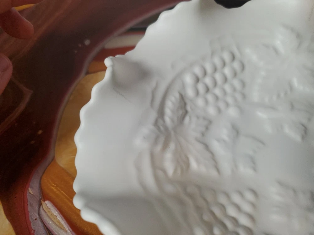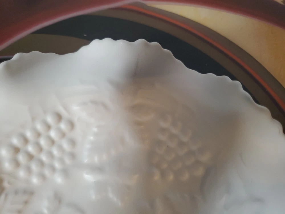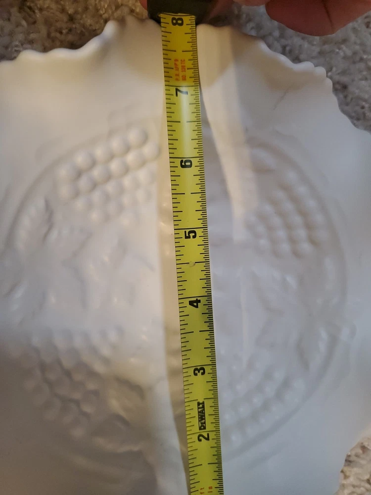 Shape:RoundNumber of Items in Set:1Type:Candy DishVintage:YesMaterial:GlassFeatures:DecorativeNumber of Compartments:1Brand:UnmarkedColor:WhiteTheme:leavesPattern:FloralOriginal/Licensed Reproduction:Original