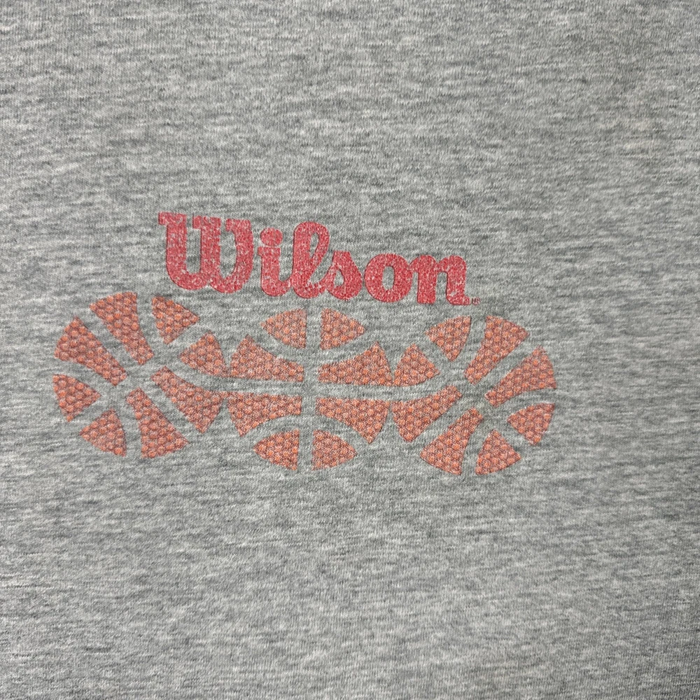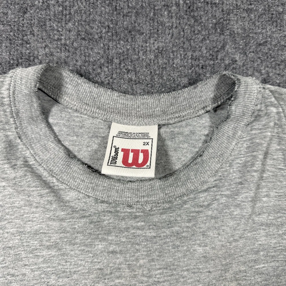 Show off your love for the USA and outdoor activities with this vintage Wilson tank top shirt. Made from lightweight and breathable cotton knit fabric, this shirt is perfect for gym and training, track and field, walking, weightlifting, cycling, school, cross training, CrossFit, basketball, bodybuilding, running, and jogging. The crew neck and pullover closure make it easy to wear, while the gray solid pattern and Wilson logo accents add a touch of style. This shirt is machine washable with medium fabric wash and is available in size 2XL. Get your hands on this Wilson Athleticwear top and show your support for sports and outdoor activities.