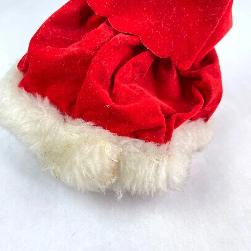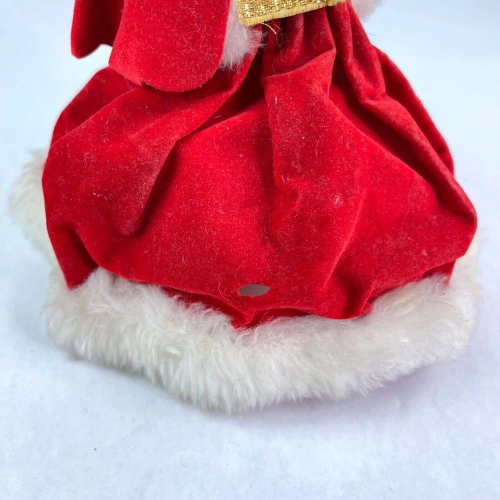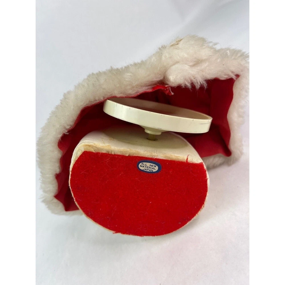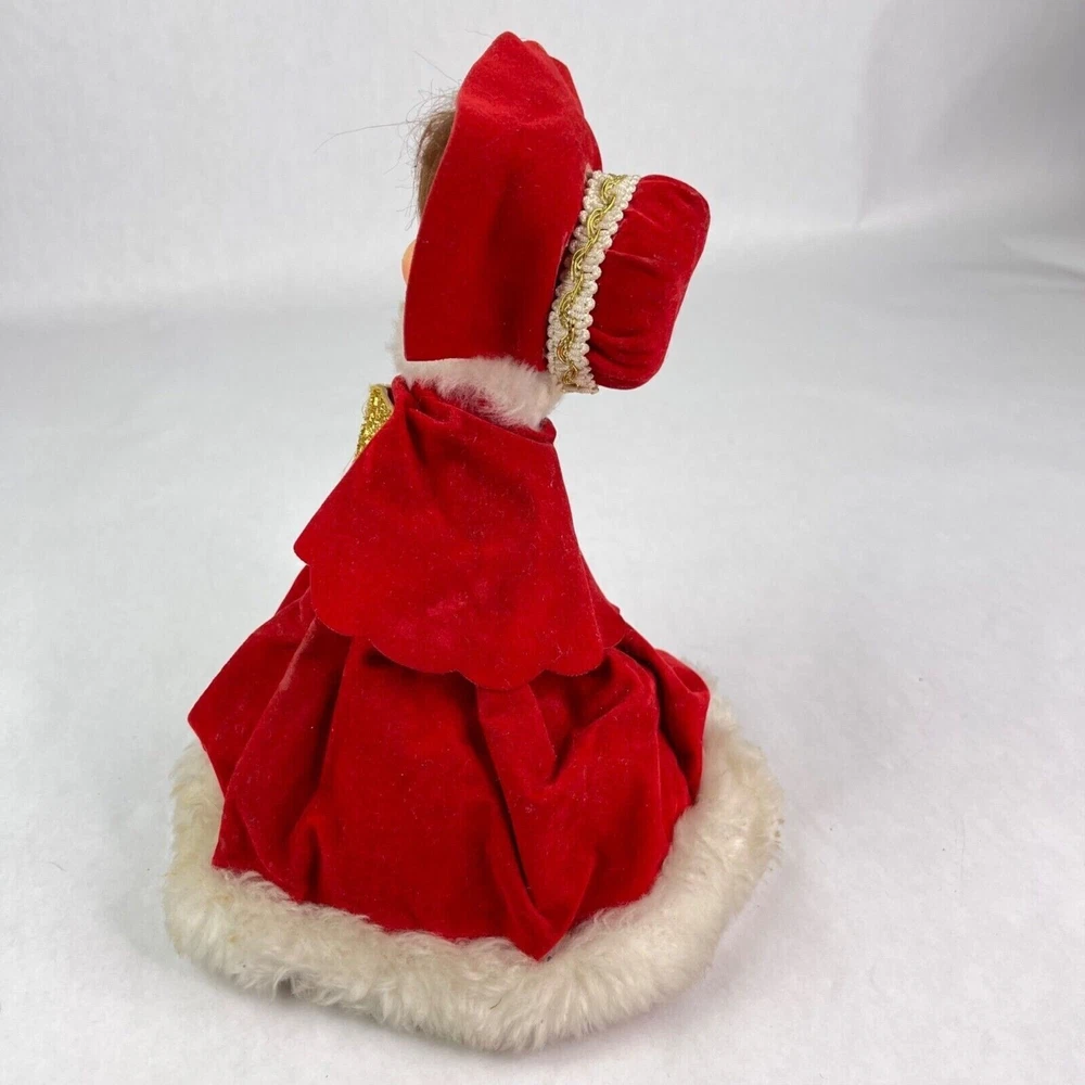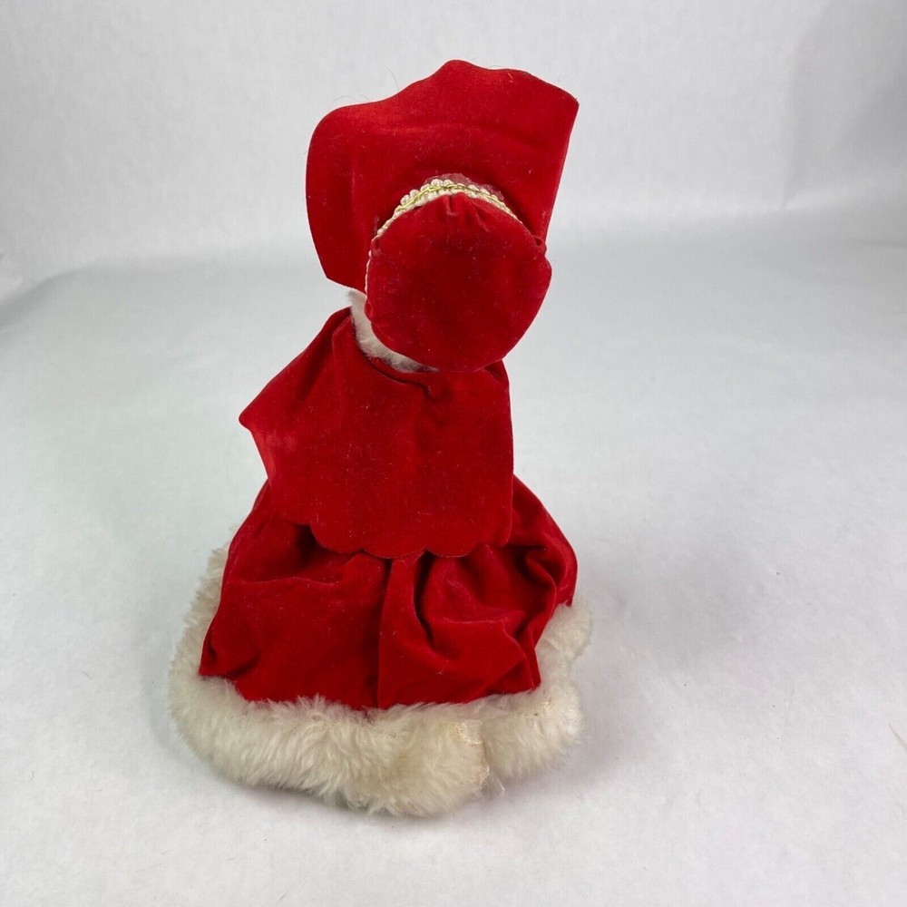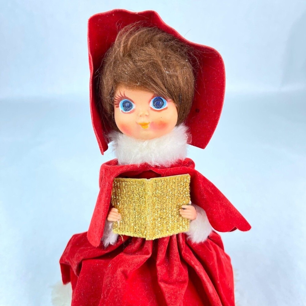 Here is a vintage Christmas Caroler. Made in Japan. She measures a little over 9" tall (measuring to the top of her head and not the top rim of the hat) Music plays and she moves around. There is a wind up knob in the back. I'm not sure what the song is. The velvet dress has a hole in it, shown in the last photo. There are folds on the velvet dress front that have velvet worn off. Yellow/Browning on the white fur. There is a spot on her hat that you can see in the second photo. This is a nice piece to add to your Christmas collection!