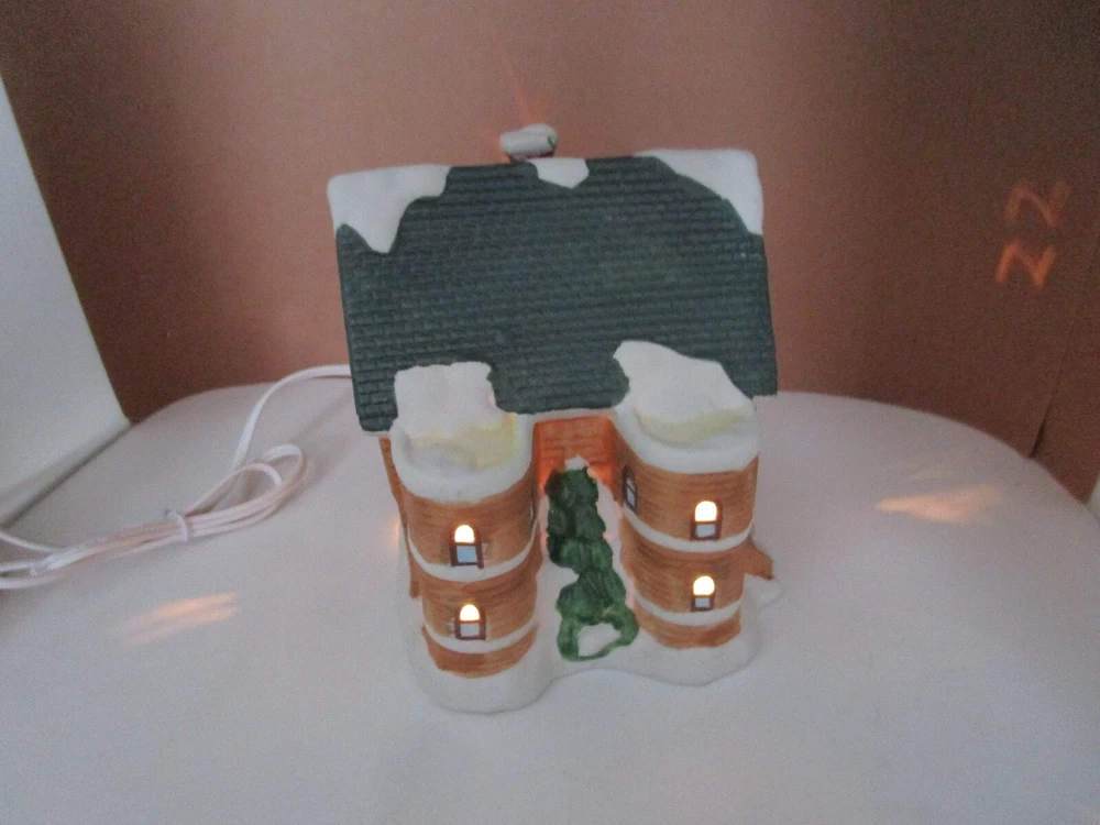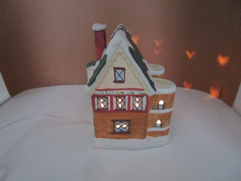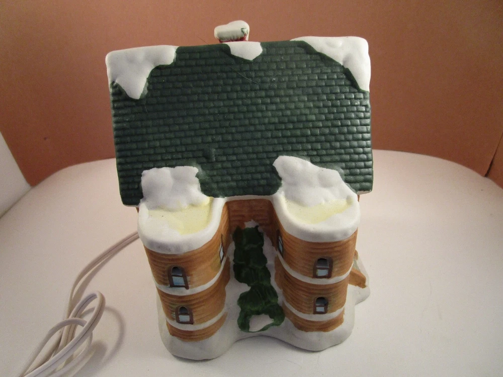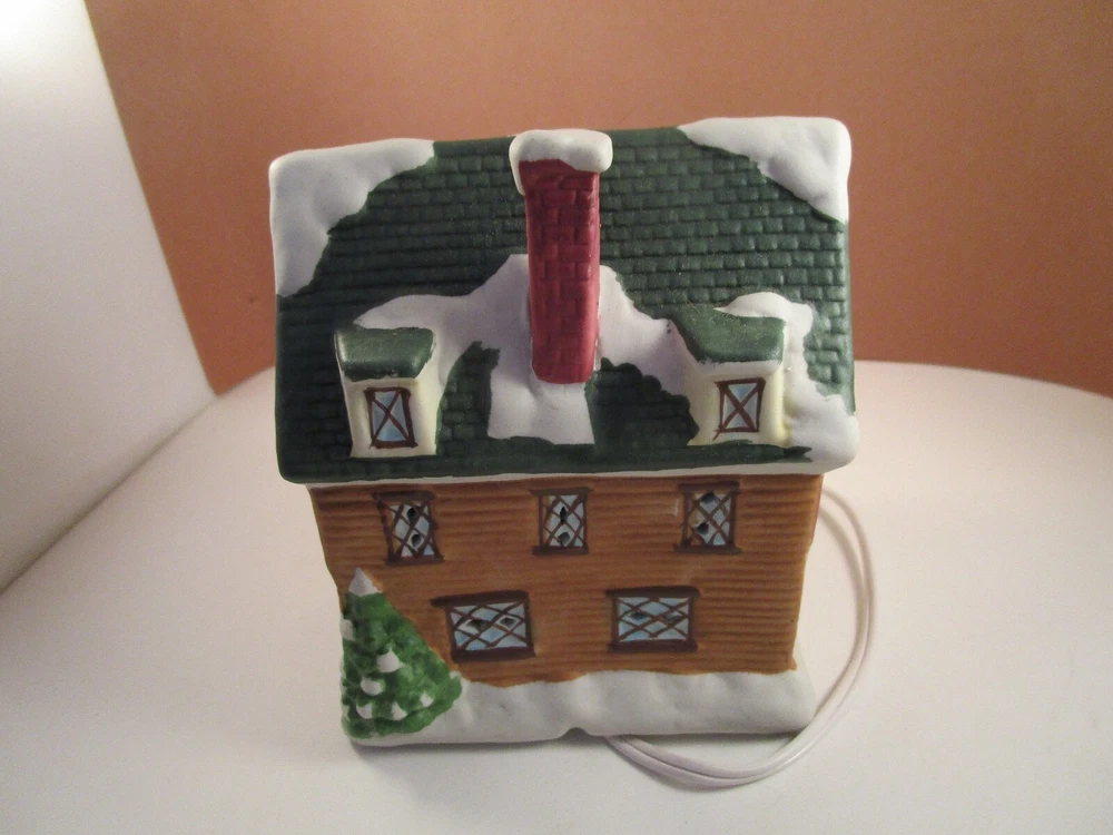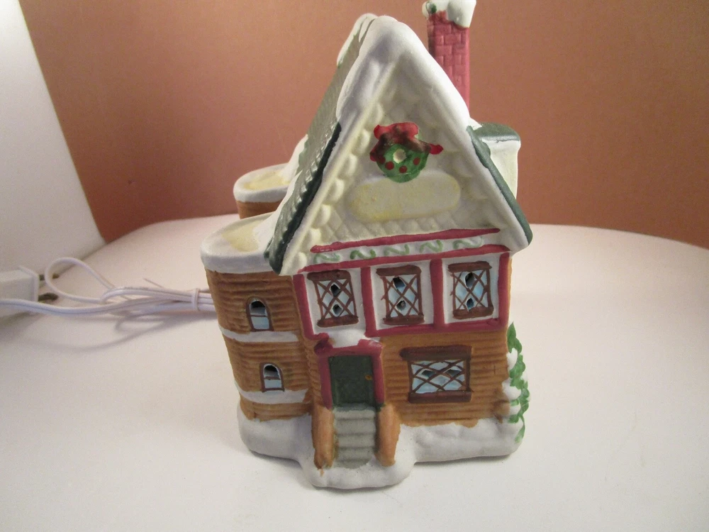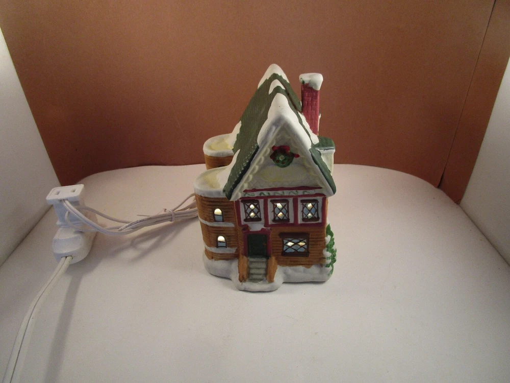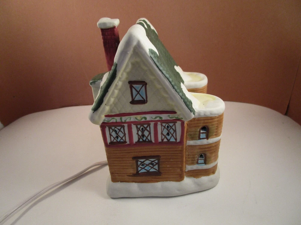 A Vintage Porcelain Christmas Village House. Measures about 5 3/8" in height. Includes the cord and bulb, and it works. CONDITION: In nice shape. Some surface scratches, and some scuffing and discoloration on the bottom rim from display. The box is in okay shape, with some general wear and tear. I purchase all of my items at auctions, estate sales and flea markets so cannot be sure of their history or whether they've come from smoke-free or pet-free homes. I do my best to list any damage or use, but I'm not an expert. So if there's something specific you need to know before bidding, please ask. Payment is due within three days. Thank you!