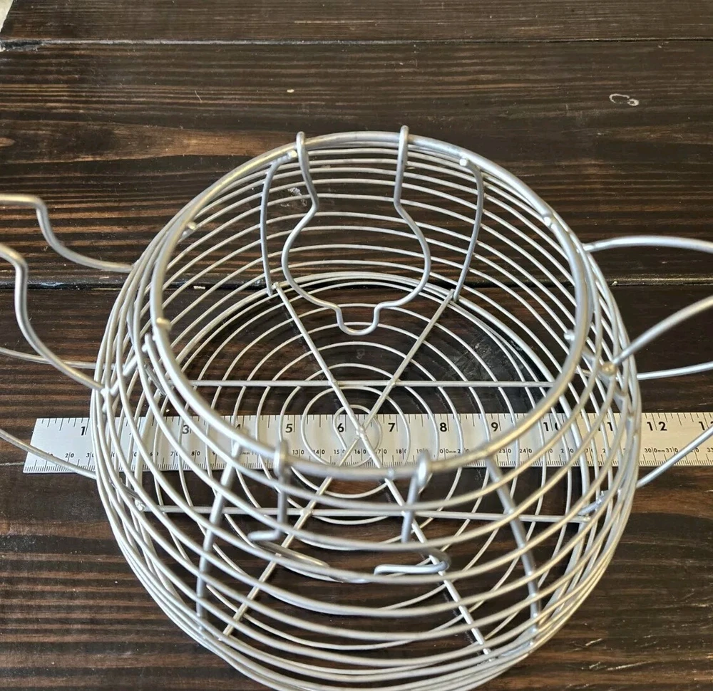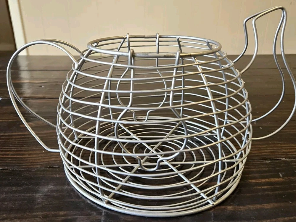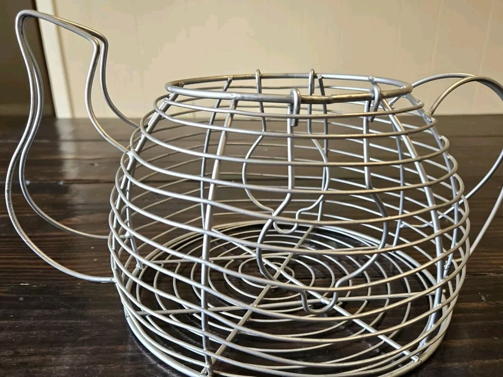 Add a touch of vintage charm to your farmhouse kitchen with this wire egg basket teapot. The kettle-shaped design with folding handles is perfect for everyday use and adds a unique touch to your collection. Made of sturdy metal, this teapot is built to last and features a silver color that complements any decor. Measuring 12 inches in length, 9.5 inches in width, and 5.5 inches in height, this medium-sized teapot is perfect for serving tea or coffee. With its country-style design and farmhouse theme, it is a great addition to any kitchen or dining room. Whether you are an avid collector or just looking for a unique piece, this wire egg basket teapot is sure to impress.