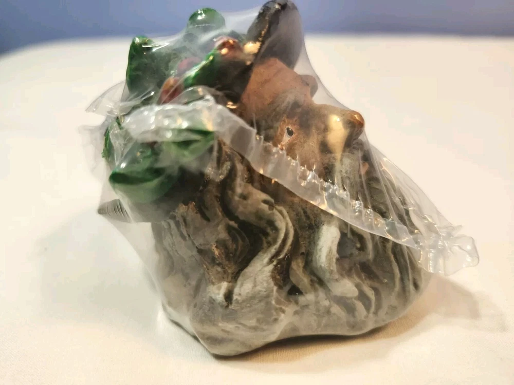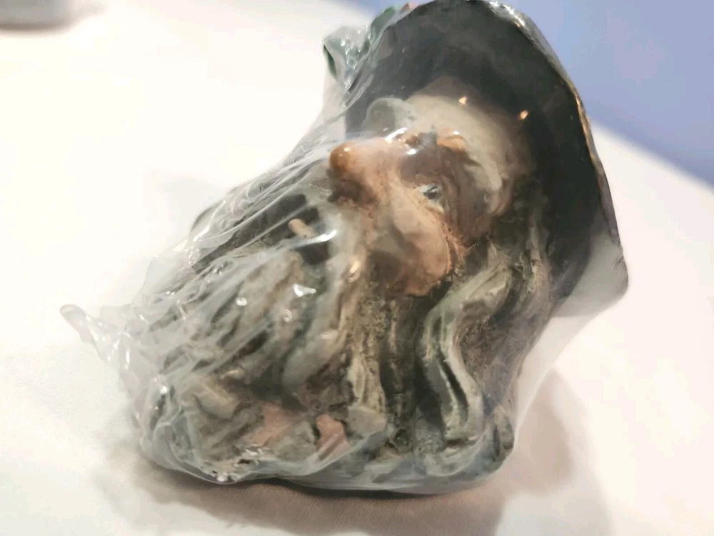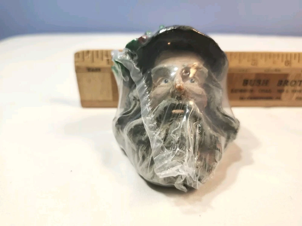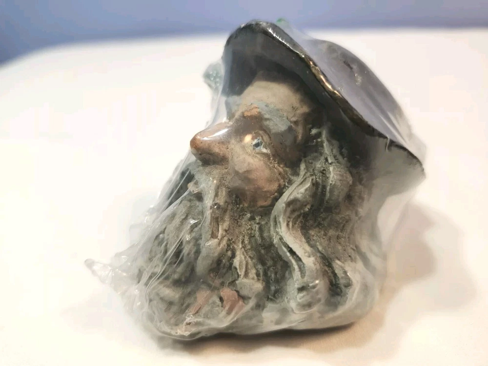 This vintage wizard head figurine is a must-have for collectors and fans of all ages. Crafted from resin, this 2 1/4 inch gray figurine is perfect for displaying during Christmas or any other occasion. The intricate details of the wizard's head and the unique design make it a one-of-a-kind piece that is sure to impress. It is still originally wrapped. But there is a chips at the left side of the beard. Plesase see all photos before purchase. Photos are part of description.