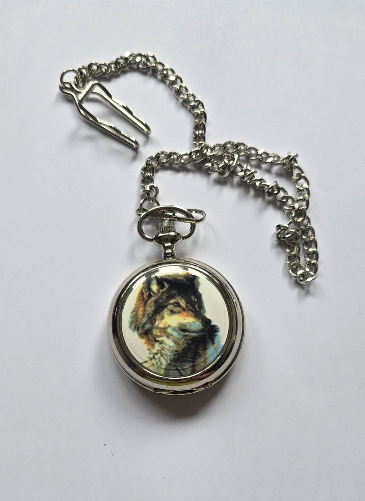 The Quartz Wolf Pocket Watch features a quartz movement for accurate timekeeping.