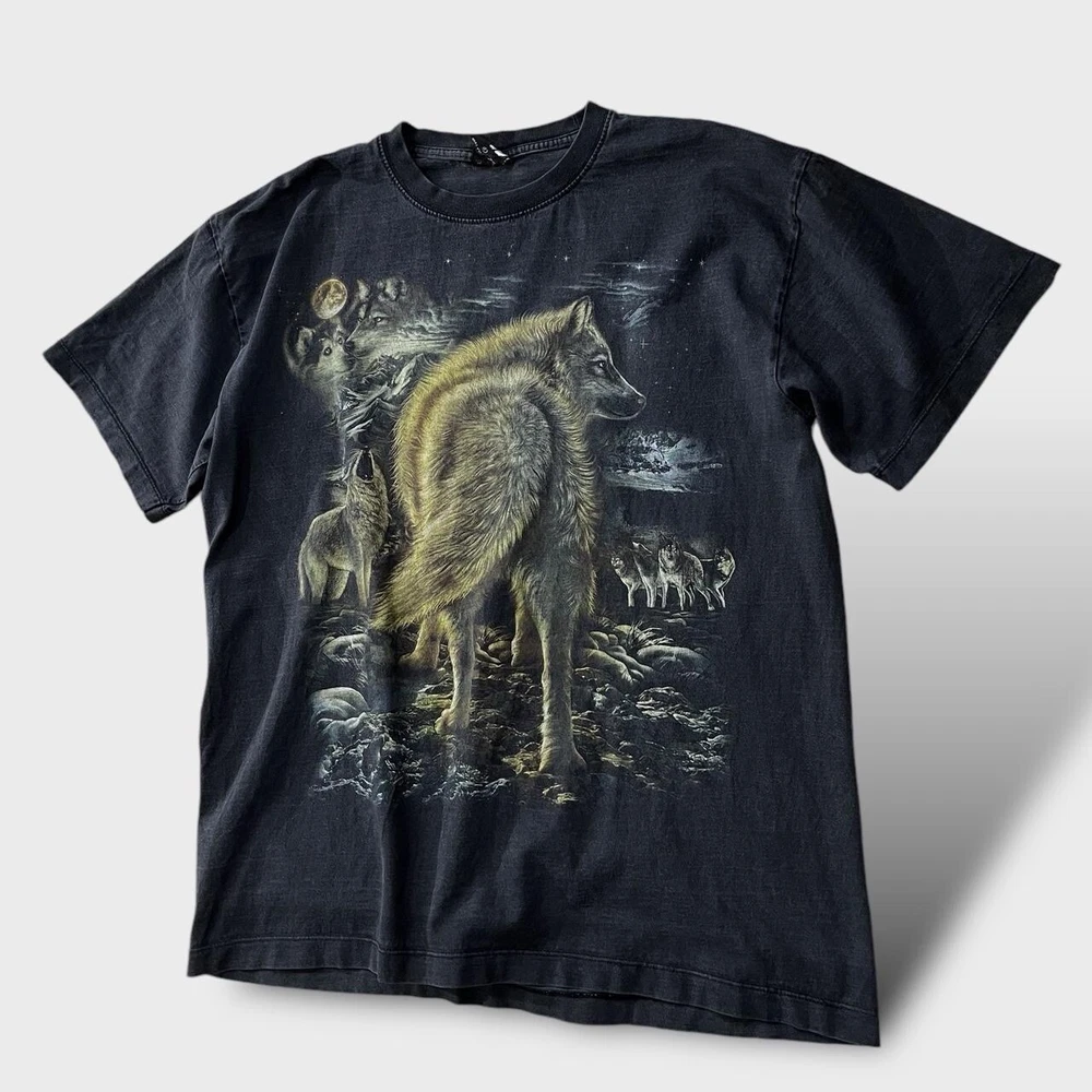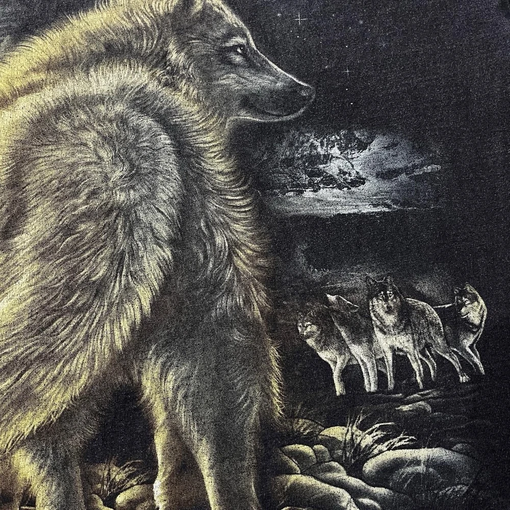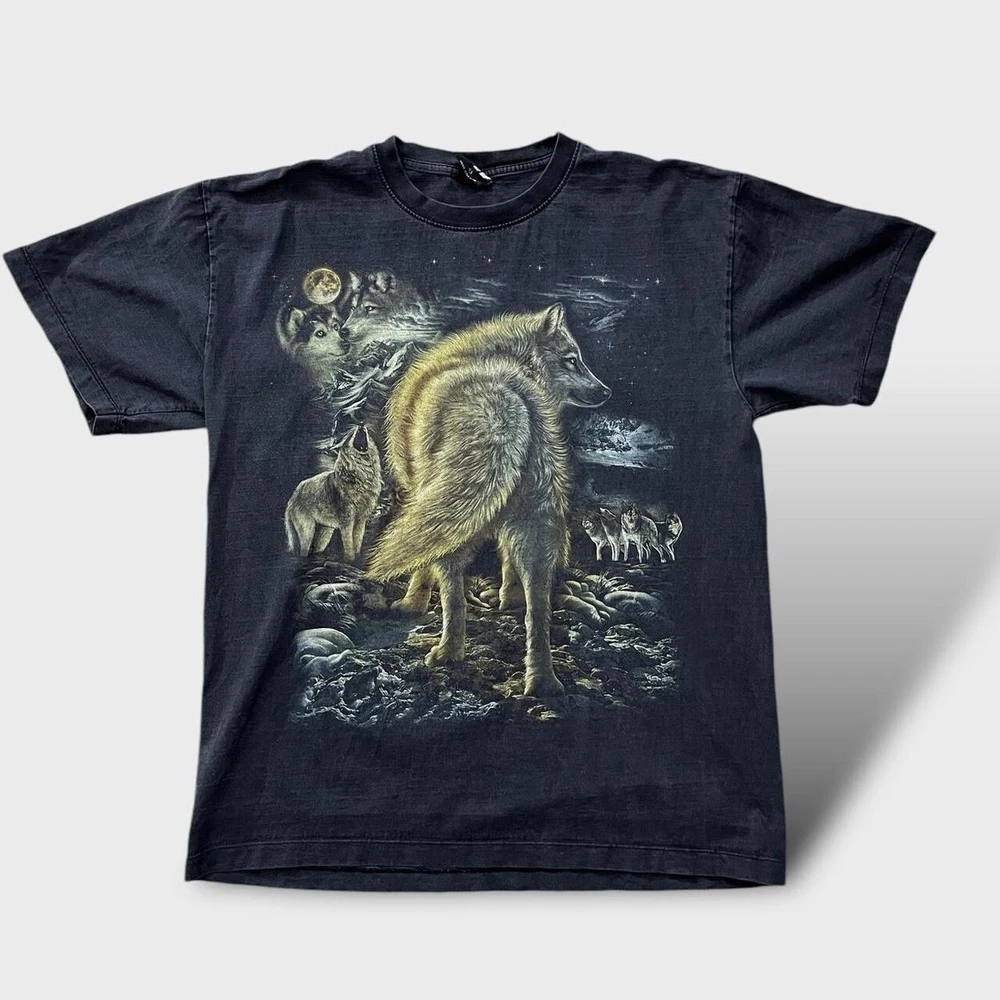 Vintage wolves graphic t shirt | faded washed black πŸ’‘ good condition- nice vintage sun/wash fade, no faults πŸ’‘ printed at front and back πŸ’‘ 100% cotton, decent weight, generally the WILD brand t shirts are good quality and don't bobble πŸ“ size L p2p 22" l27"