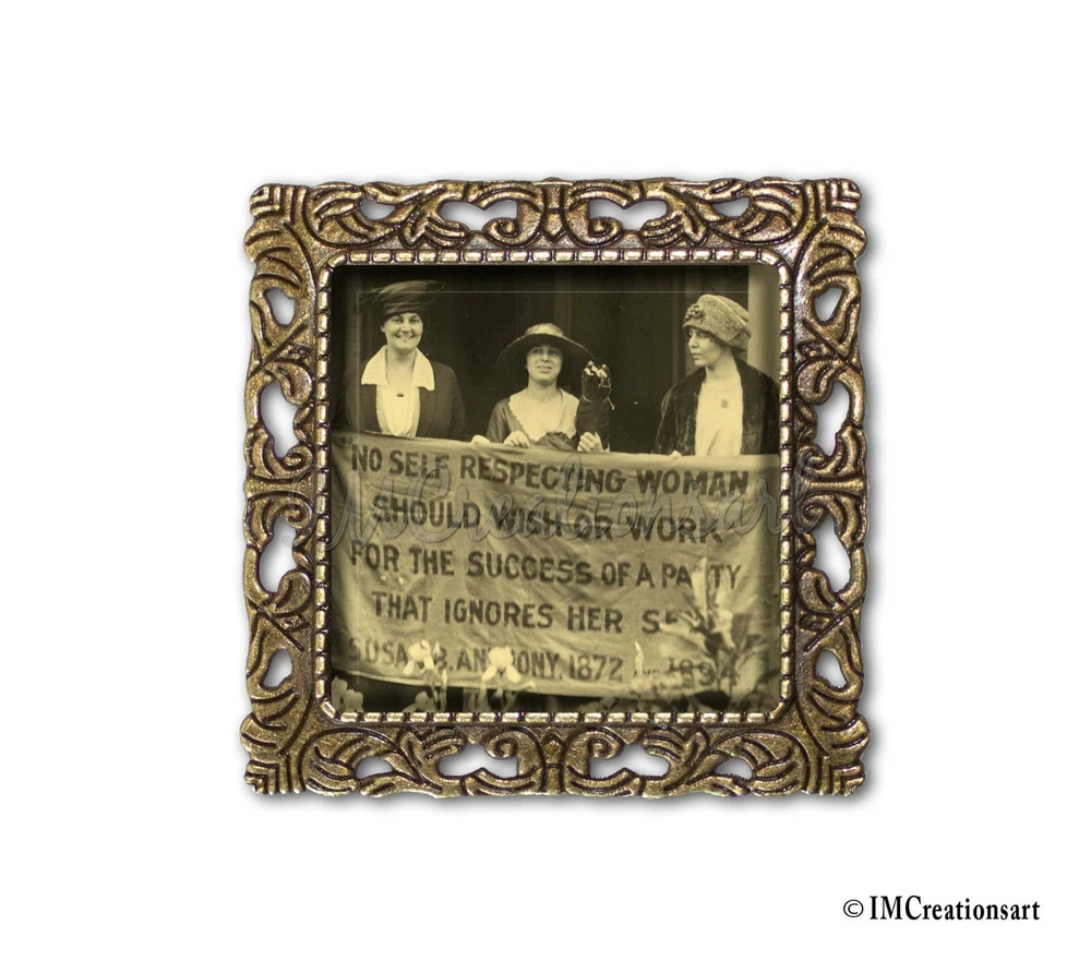 Description SQUARE BROOCH / PIN Vintage Woman Suffrage Design (BWD101) This lovely bronze brooch/pin jewelry make a unique find gift for your girlfriends, Mother's Day, bridesmaids, shower favors, hostess gifts, holiday gifts, etc. Measurement: 1.5" x 1.5 You can select from two different metal tone finish: Antique Bronze or Antique Silver A lovely graphic image adhered between crystal, clear square glass and bezel tray. Glass insert is 1" square The photo in listing is a representation. All images printed on high quality matte photo paper using a high end photo printer. A gift bag will be included so can be ready to give it as a gift. PLEASE NOTE Since monitor settings and color may vary, the colors you see on your screen may slightly vary from printed product you receive. WATERMARK will NOT appear on final product sent to you! Payment In order to get the correct combined shipping cost for a variety of different designs/product, PLEASE make sure you click "ADD TO CART" button in the listing for each item. Once you completed adding all the items into your shopping cart you can proceed to payment. The combined shipping is automated, so you will see the correct combined shipping cost. Please make your payment within 24 hours of receiving your invoice. If payment is an e-check via PayPal, e-check must clear before the items are shipped. Payment MUST be received prior to shipment. Shipping Shipping is usually done via USPS Priority Mail for packages and First Class Mail for letter or large envelope sizes. Please make sure your shipping address is up to date because this is the address where the package will be sent. Clear PayPal paid item(s) are shipped out after 1 business day. Exception would be personalized items; these ship out 2-3 business days. Confirmation, shipping and handling is included in shipping price. Terms of Sale I want you to be very satisfied with your purchase. If you are not happy with your item(s), you may send the item(s) back within 30 days after receiving purchased item(s). Please contact seller with details PRIOR to return letting the seller know the reason for returning. Returned shipping cost is paid by buyer, and must include package tracking. Item must be returned in same condition as received. Seller MUST FIRST receive the returned product from buyer before any refund or equal exchange is given. Thank you for your cooperation. About Us At imcreations-eshop, you will find an abundance of designs and products all handmade by me, Irene. All products are well crafted to ensure the best quality. With so many items to choose from, you can make this your one stop shopping for that next unique gift! Contact Us Store | Feedback | Contact