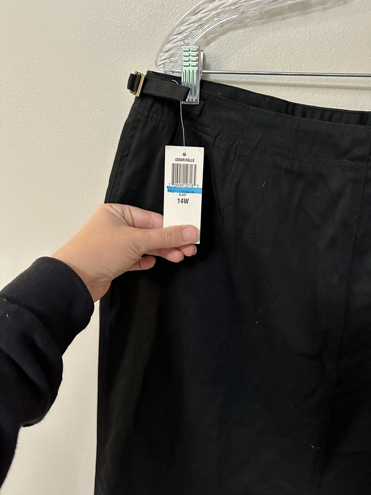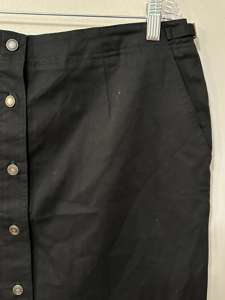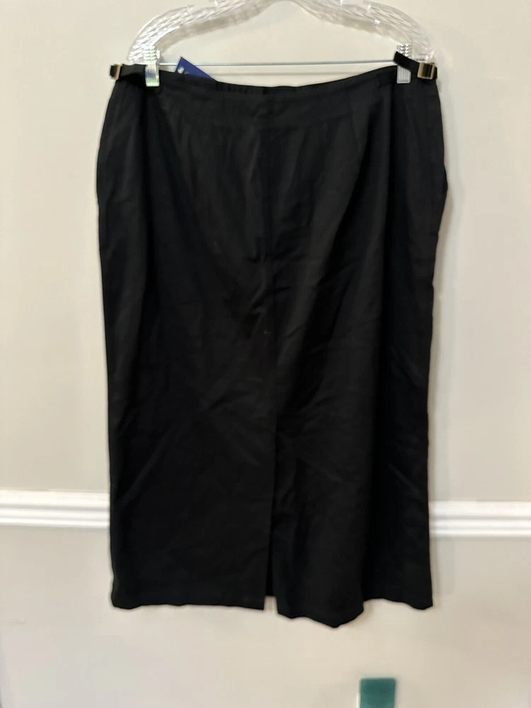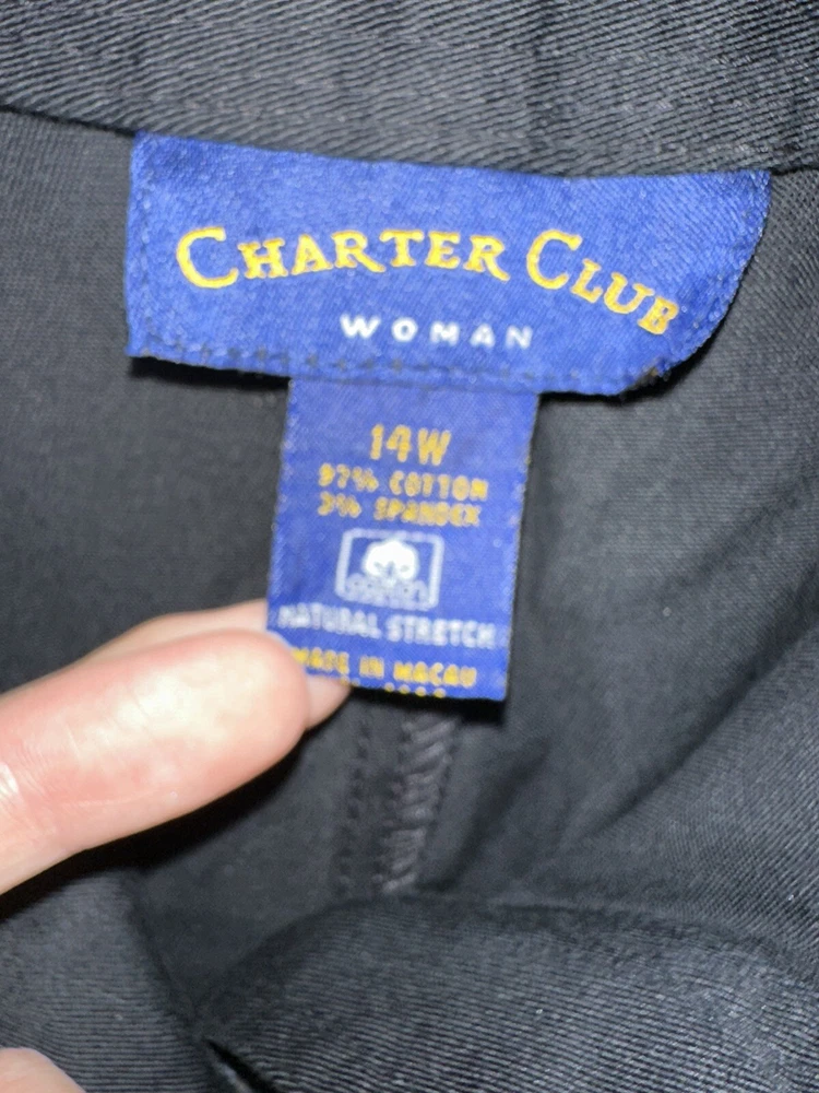 This vintage Charter Club skirt is a must-have for any fashion-forward woman. The black twill fabric, combined with spandex and cotton, makes it lightweight and comfortable to wear in any season. The A-line style and midi length create a flattering silhouette, while the high rise and button closure add a touch of sophistication. Perfect for travel, business, or casual occasions, this skirt is versatile and stylish. The solid pattern and 90s American theme make it a unique addition to any wardrobe. Plus, it's machine washable for easy care. Don't miss out on this rare find in plus size 14W.