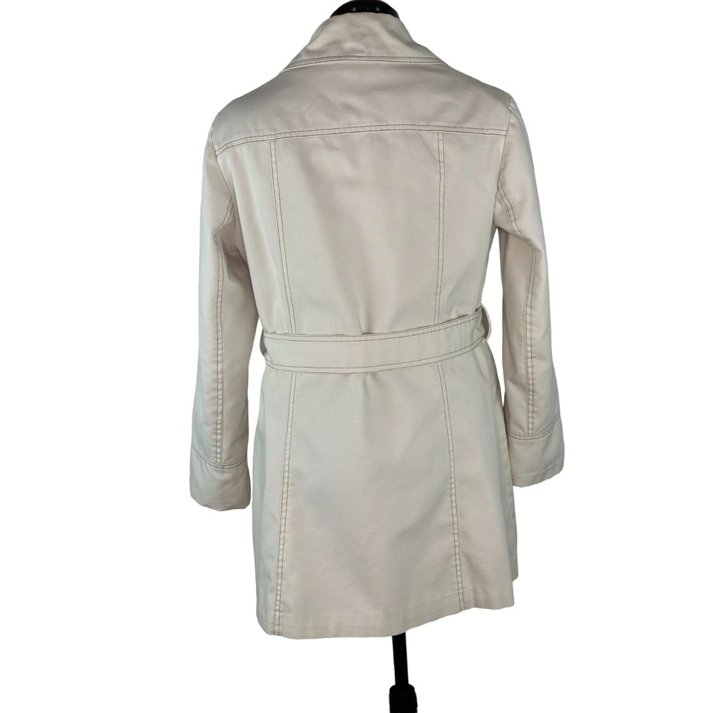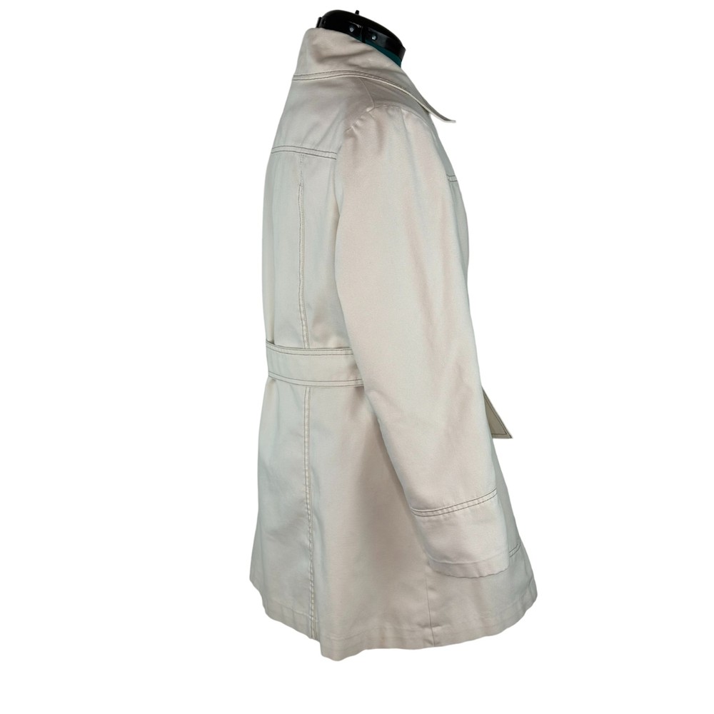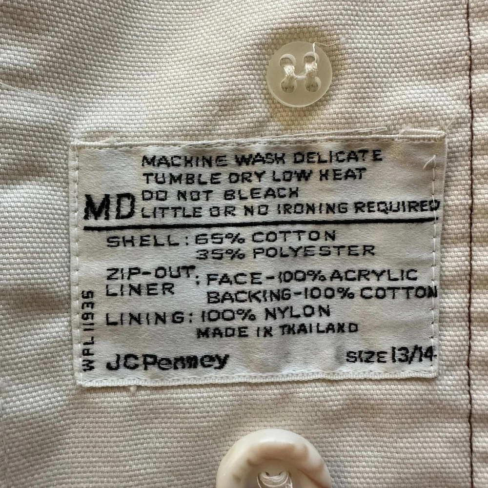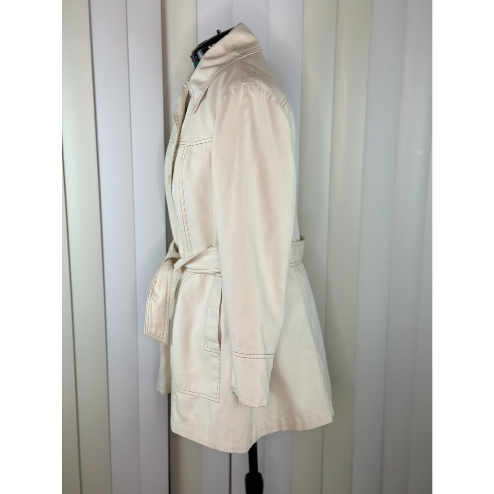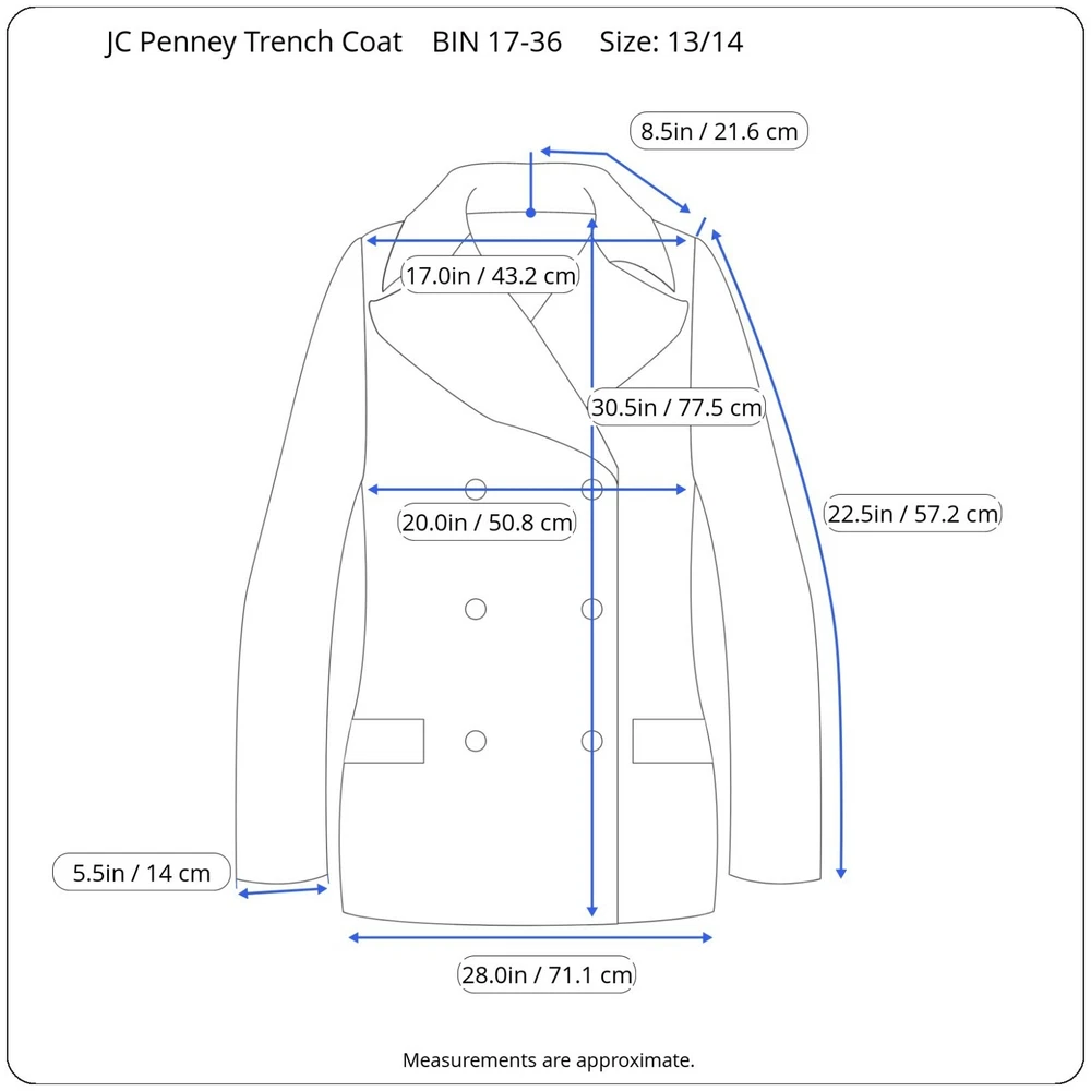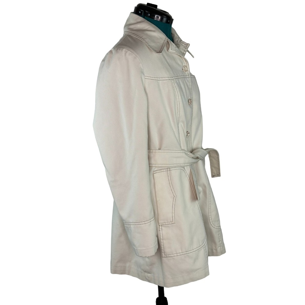 Vintage Womens JC Penney Trench Coat Beige Long Sleeve Liner Button Up 12/14 Condition: Pre-Owned There is a place on the liner that zips in that appears to have been repaired along the seam on the arm. Other then that I don't see any rips, stains, holes, or tears. Size: 13/14 See last photo for detailed measurements. BIN 17-36