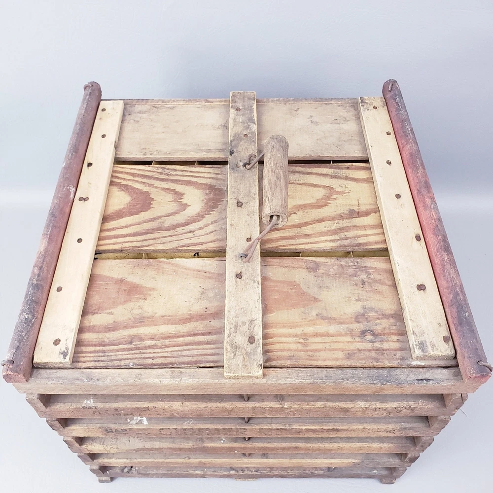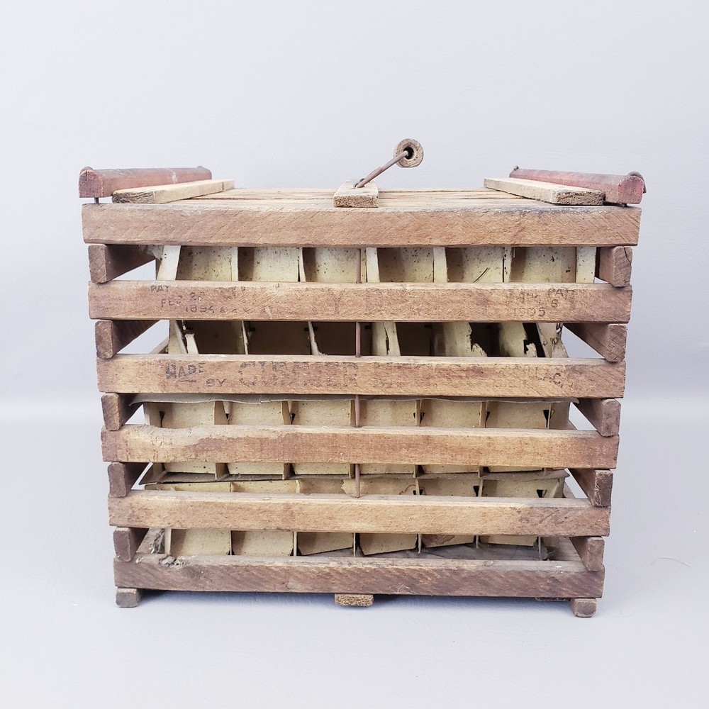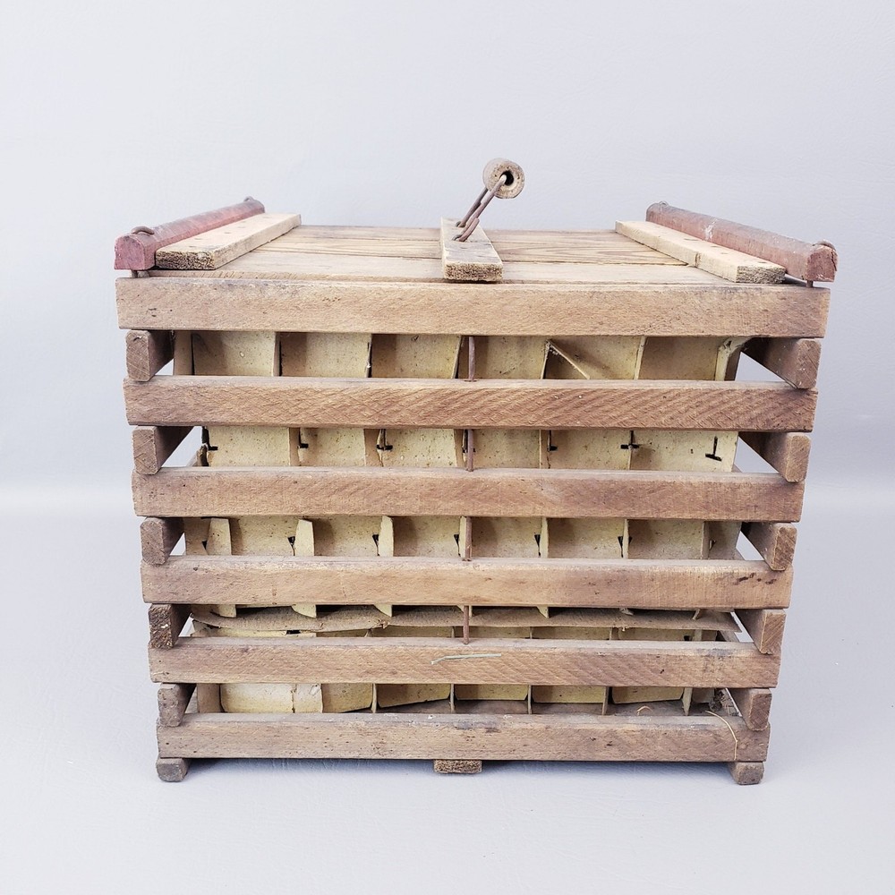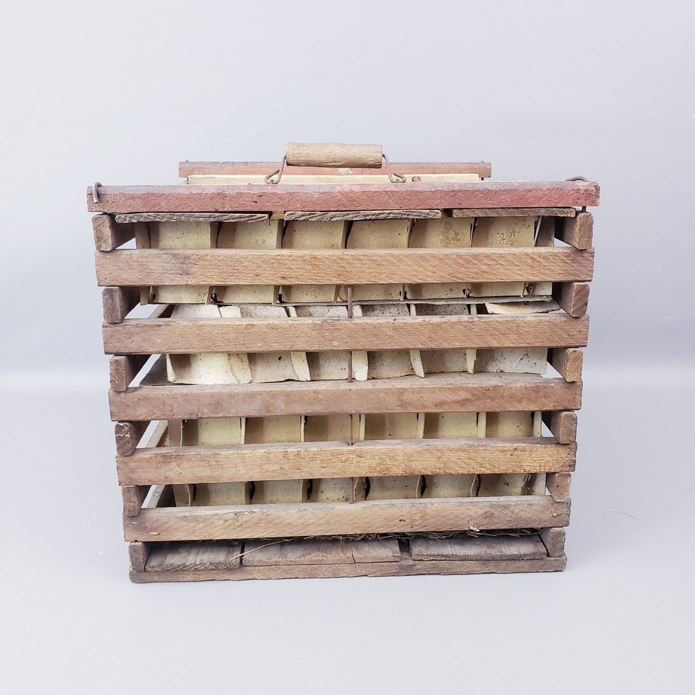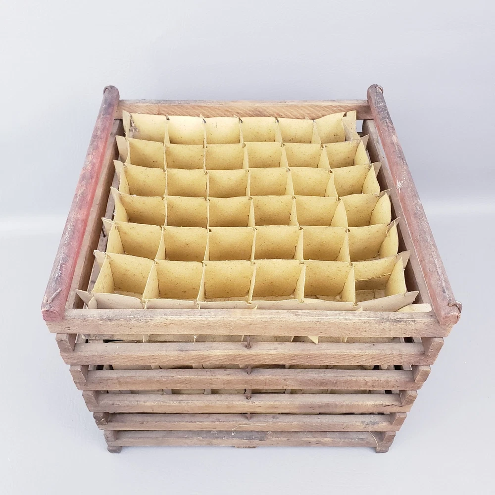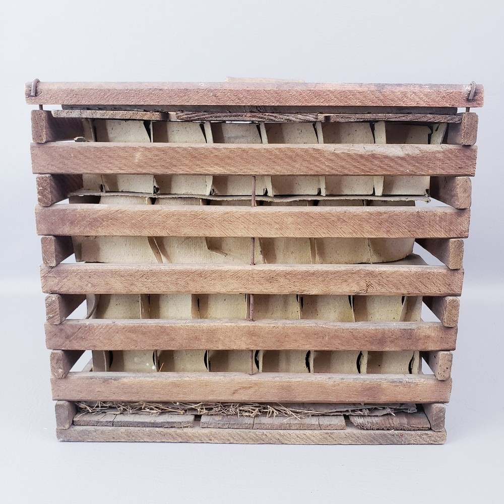 Vintage Wood Egg crate Humpty Dumpty Cummer Mfg. Cadillac Michigan Wooden crate is in great structural condition. Lid is secure and unit carries well. Paper egg grids show their age with rips, stains, dirt, dust, and one missing row. Original Humpty Dumpty logo is very faded. Over all very nice condition for its age. Please see the examples provided in the listing photos. Holds 12 dozen eggs. Measures approximately 13"x13"x11". Thank you for looking!