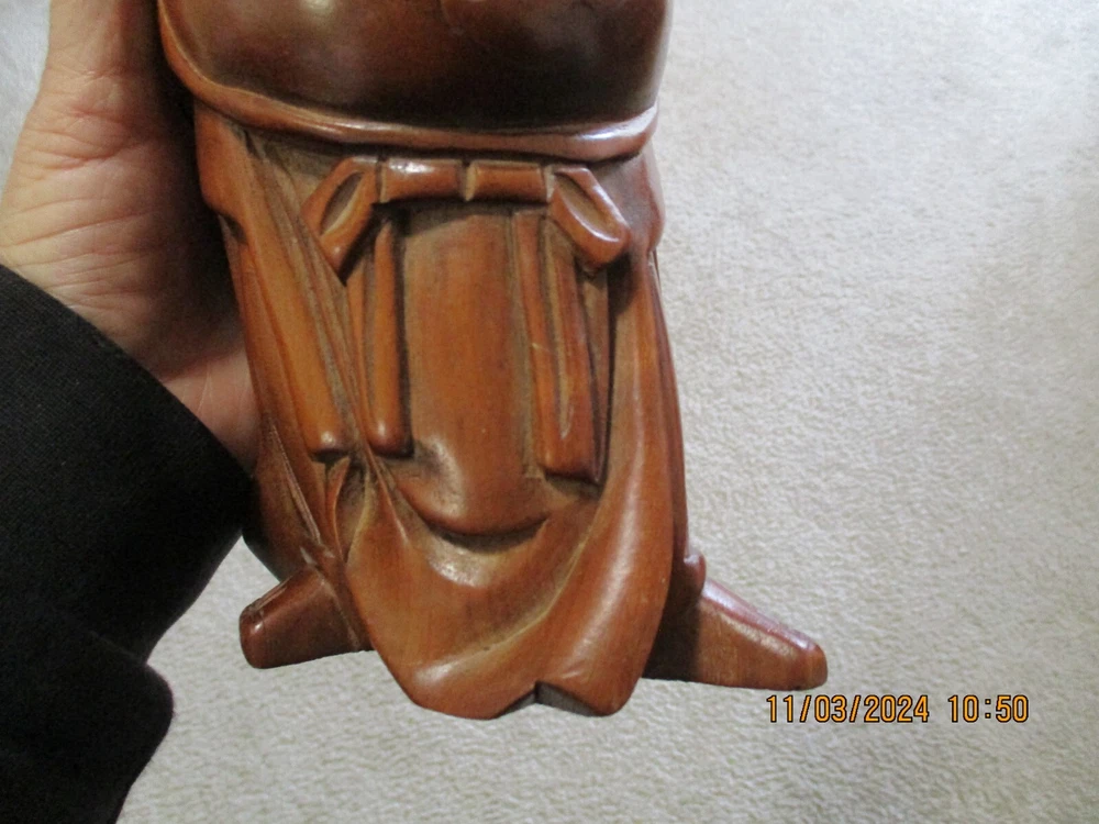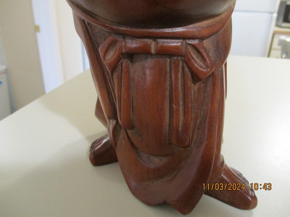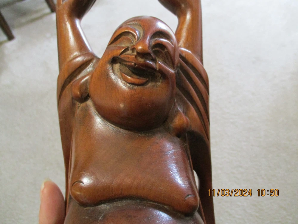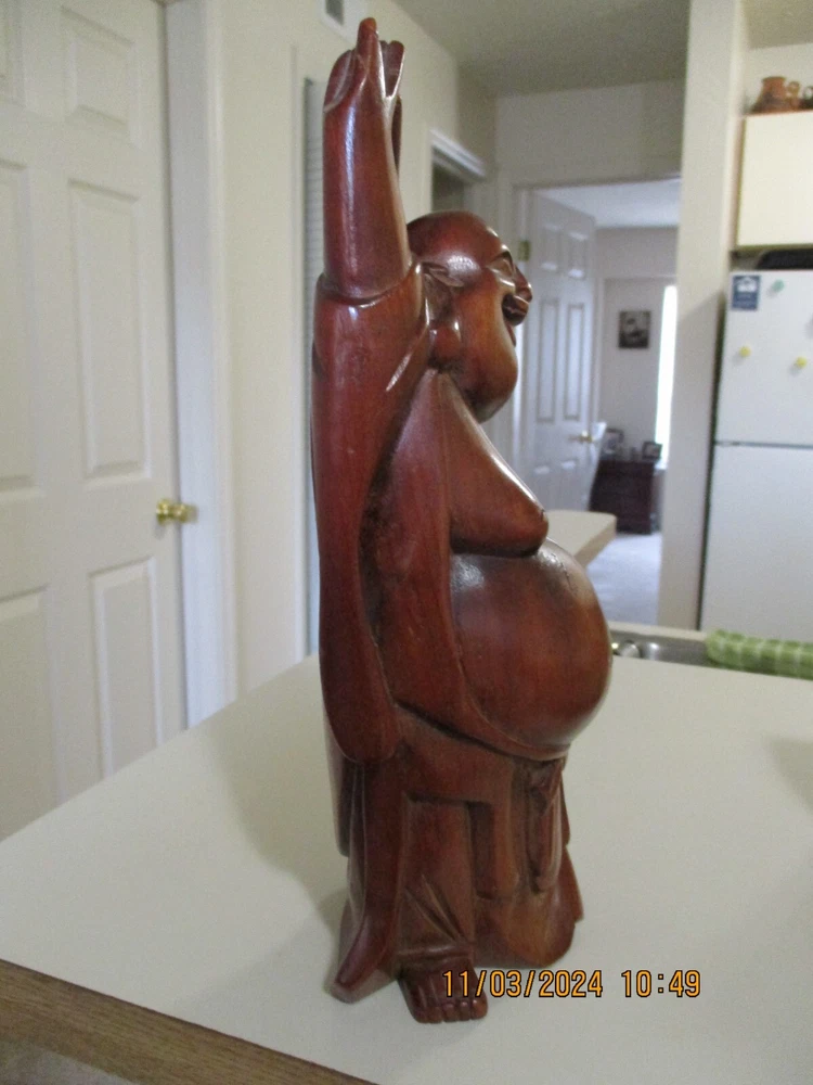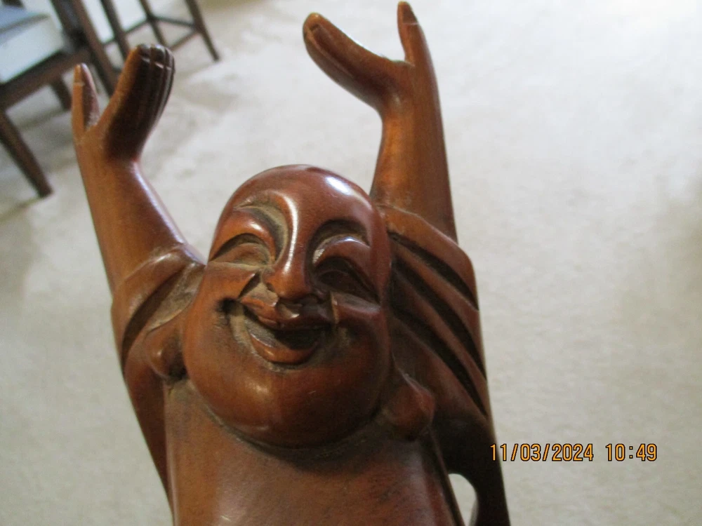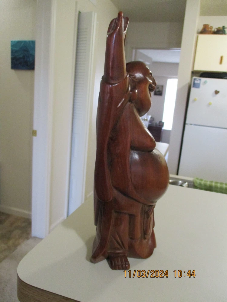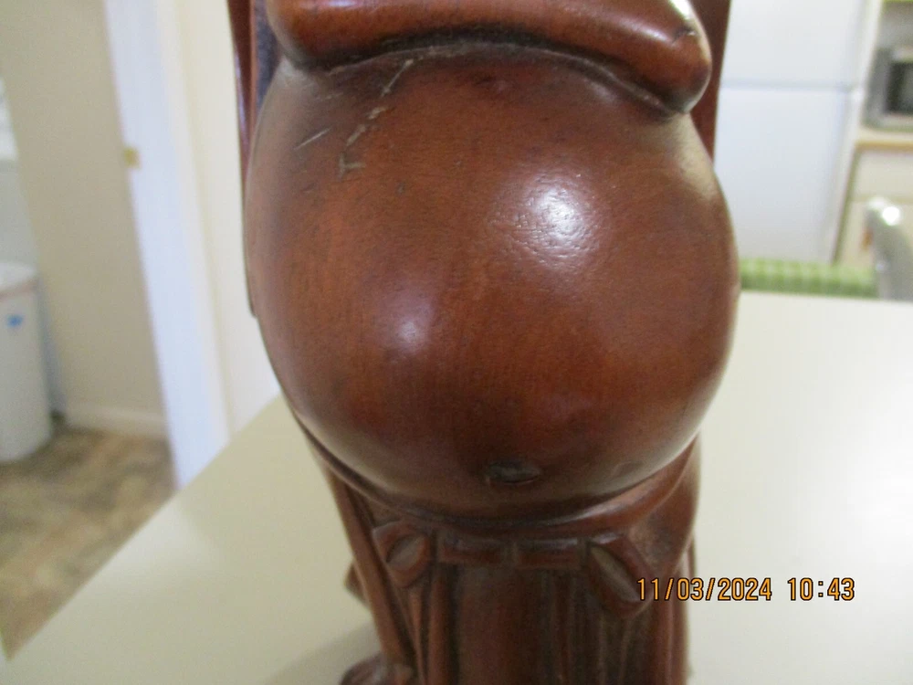 Up for sale is this Happy Buddha wood statue. It is about 11 1/2 inches tall. I was told that the previous owner traveled to many places in the world while in the military and acquired items along the way. I am not sure the age of this piece. It does have a partial tag on the bottom, but I can't make out where it came from. It looks to be in good vintage condition. It has a couple of marks on it (see pics). The right thumb does have a mark on it. I don't know if it is a crack or what. It's not loose at all. So it may just be on the surface.