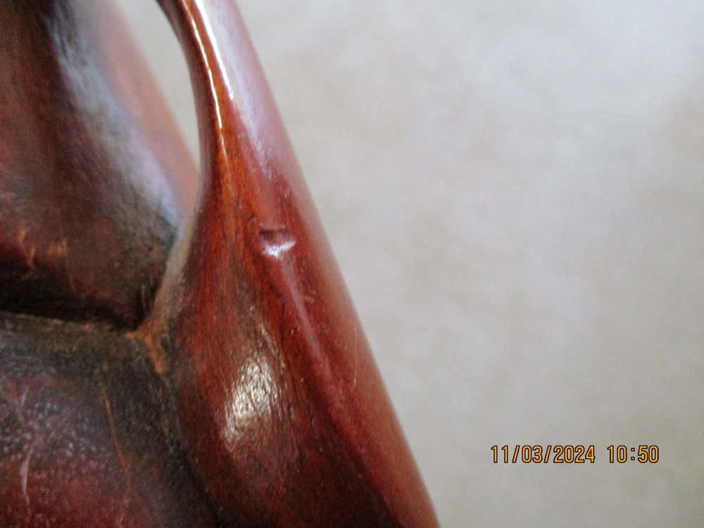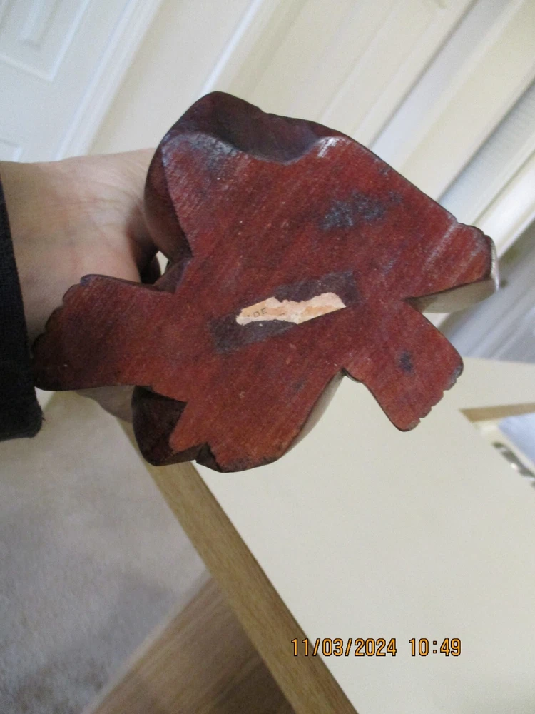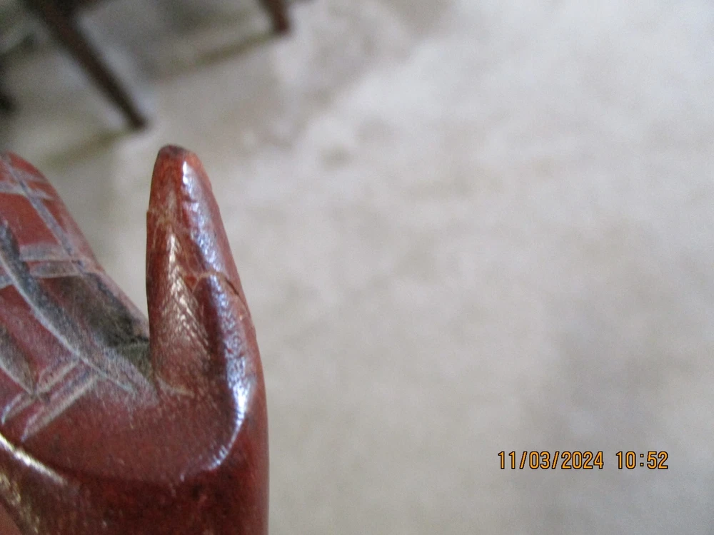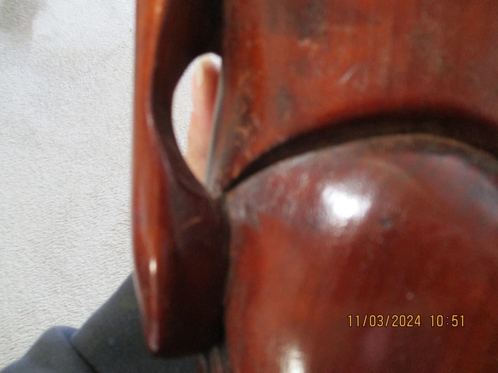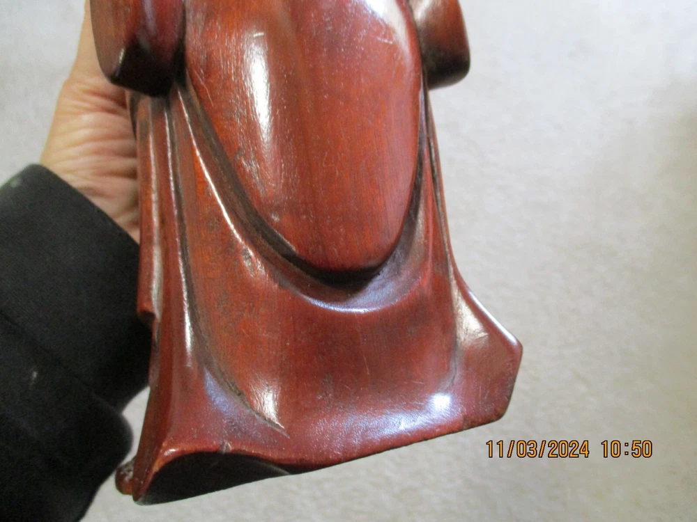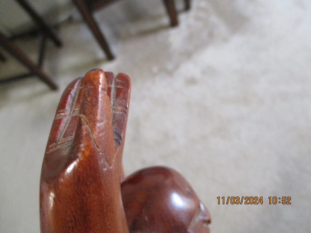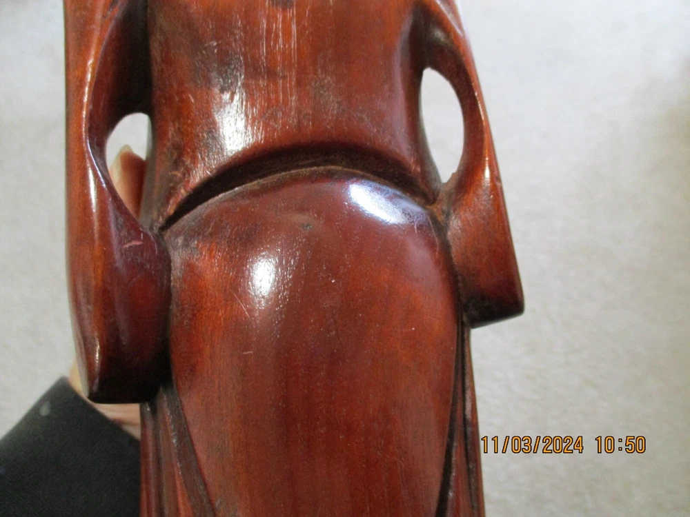 Up for sale is this Happy Buddha wood statue. It is about 11 1/2 inches tall. I was told that the previous owner traveled to many places in the world while in the military and acquired items along the way. I am not sure the age of this piece. It does have a partial tag on the bottom, but I can't make out where it came from. It looks to be in good vintage condition. It has a couple of marks on it (see pics). The right thumb does have a mark on it. I don't know if it is a crack or what. It's not loose at all. So it may just be on the surface.