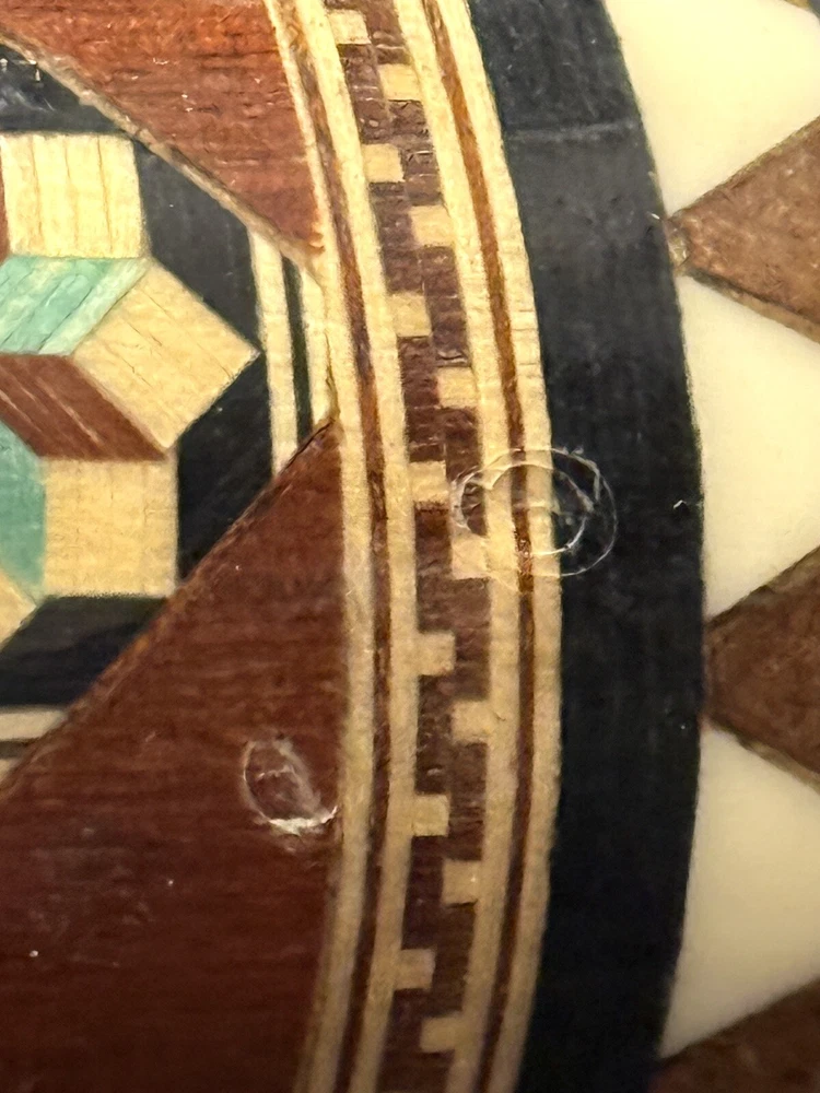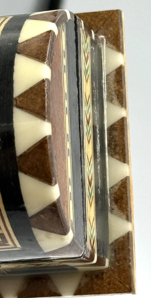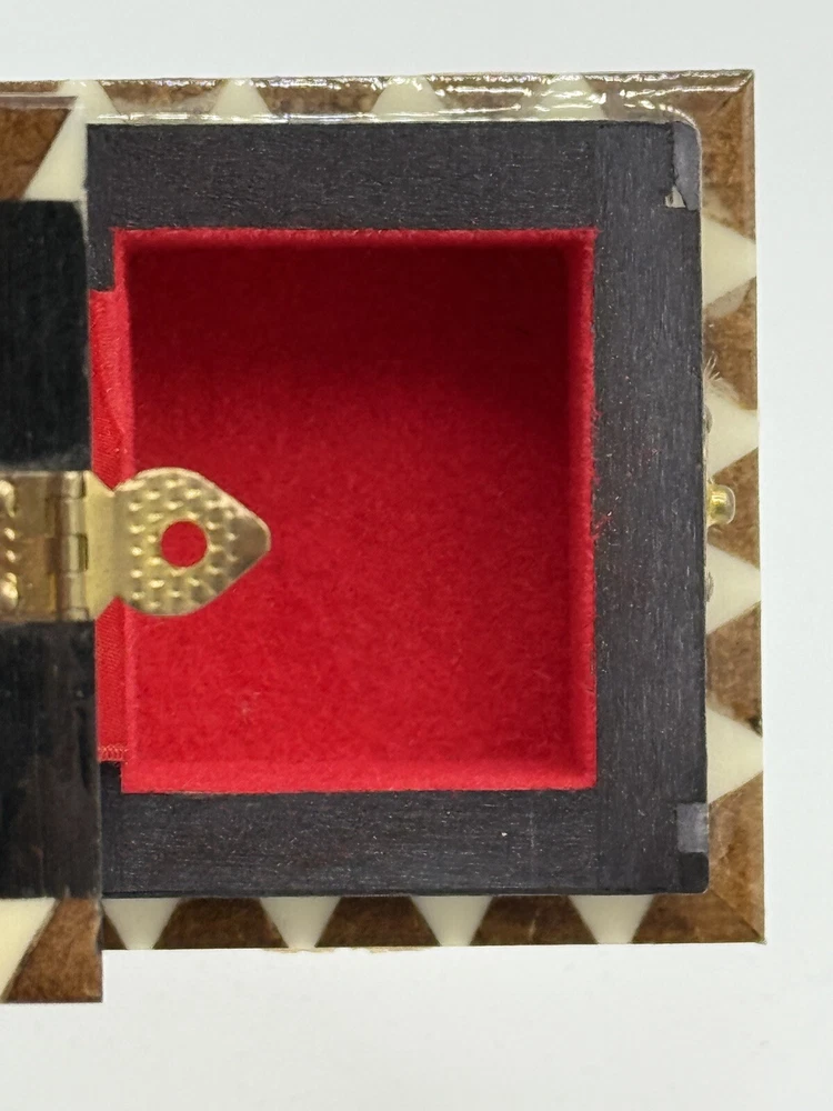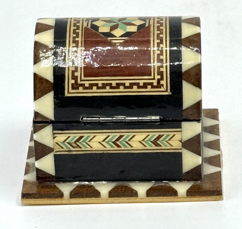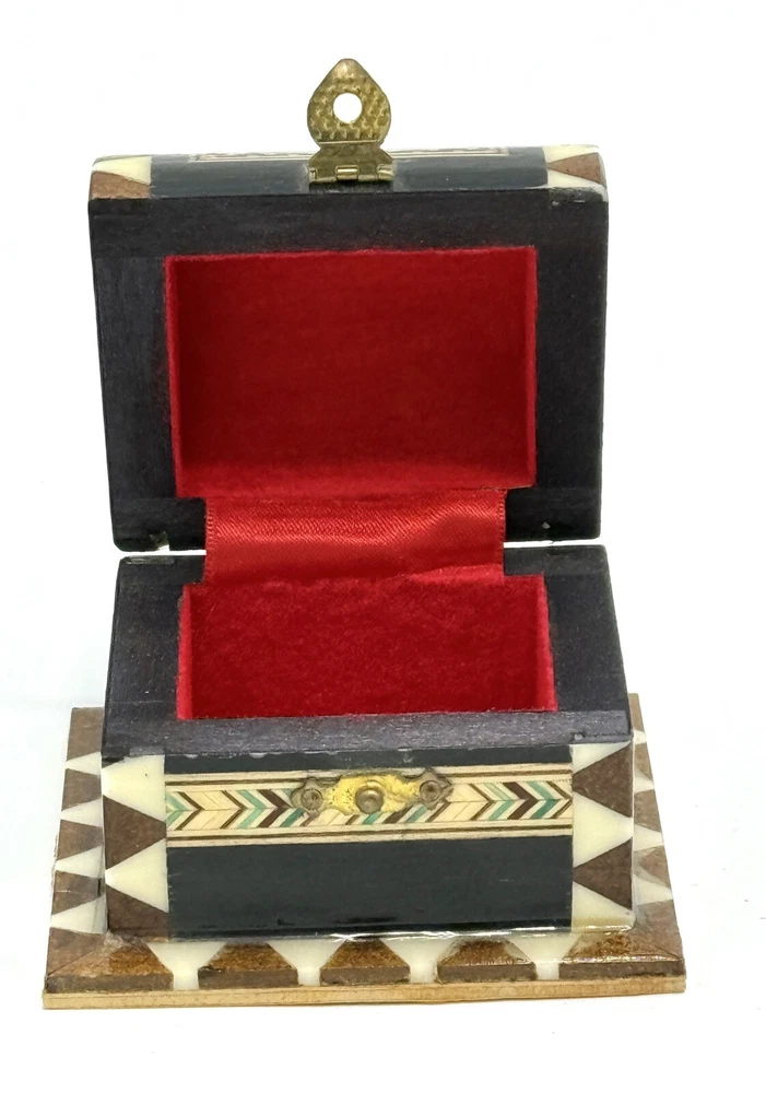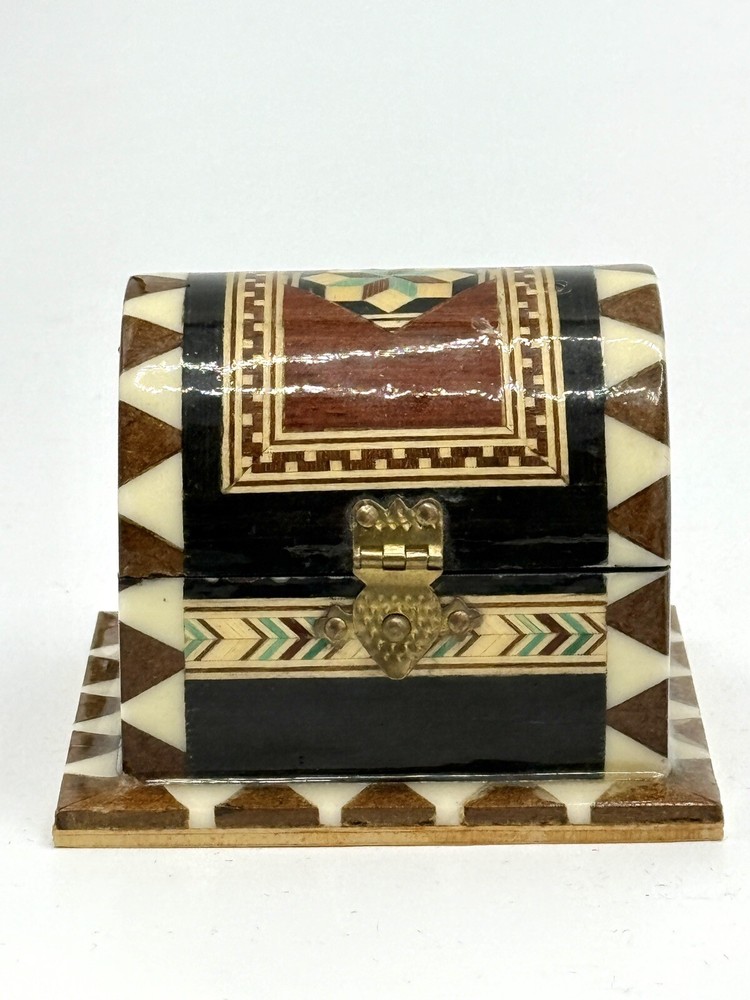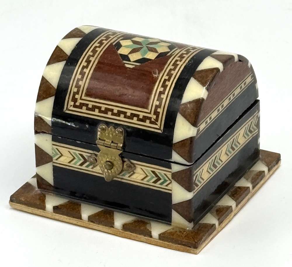 Vintage Inlaid Wood & Mother of Pearl Domed Trinket Box Jewelry Chest Trunk. Intricately crafted multi color inlaid wood designs with mother of pearl accents lined in red cloth. There are 2 places on the top of the lids where it has had something press into the wood. There are also tiny chips on the top of the bottom front lip as shown in pics. On the right side the finish appears a bit thick/ cloudy. Made measures 8 cm x 7.5 cm. It is 6 cm high. Brass clasp on front. No telling how many hours of work went into this! Lot # 2058