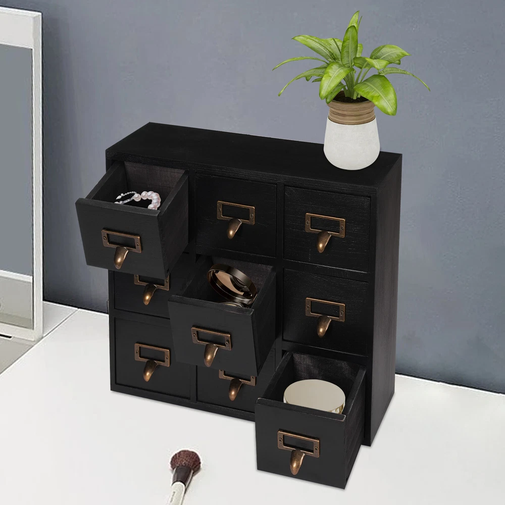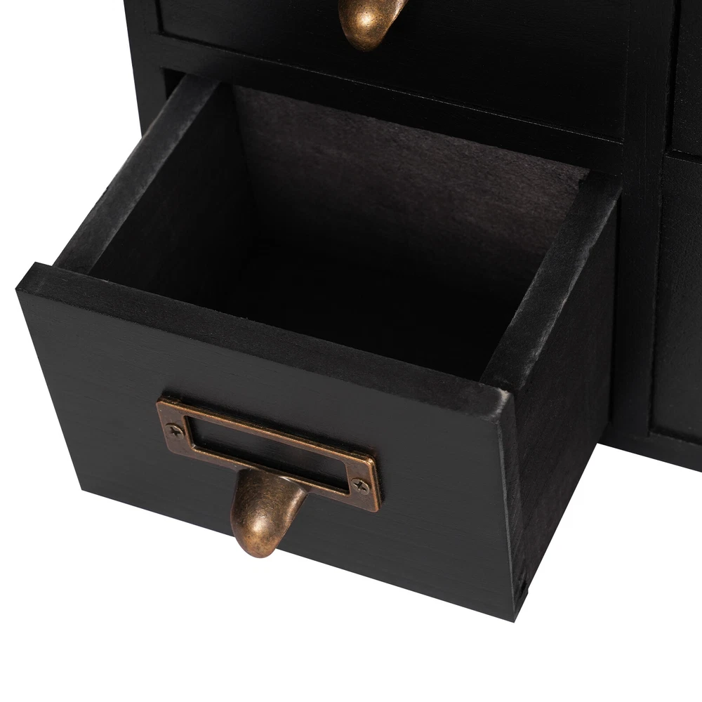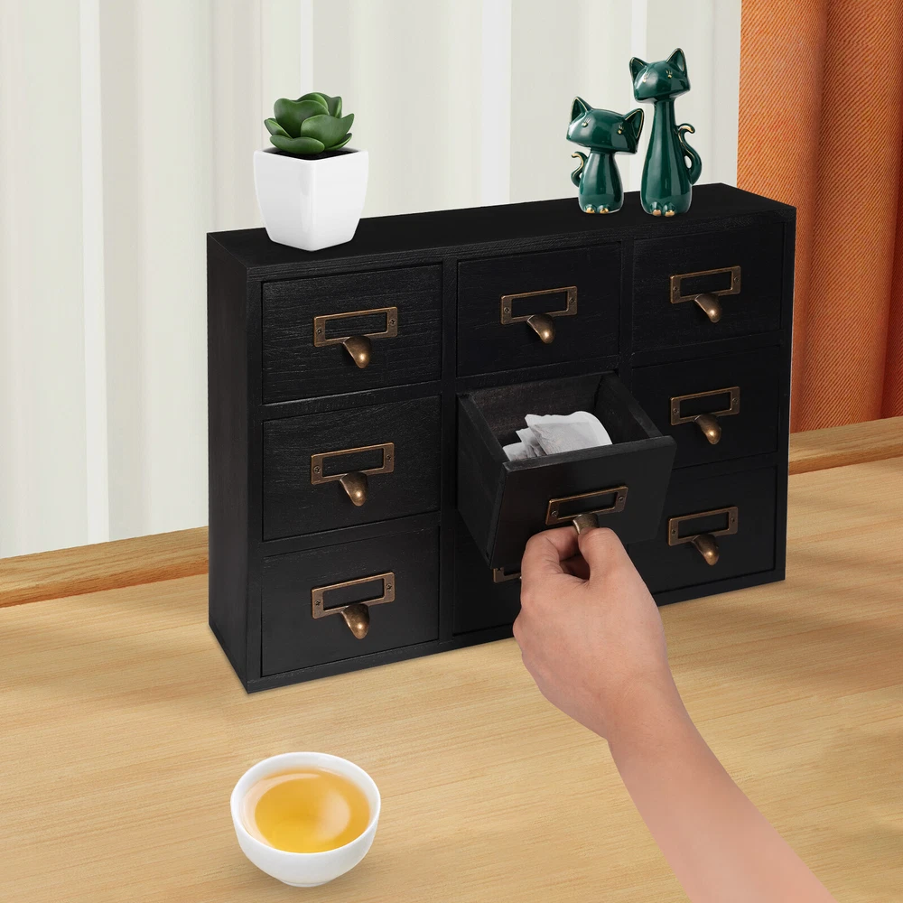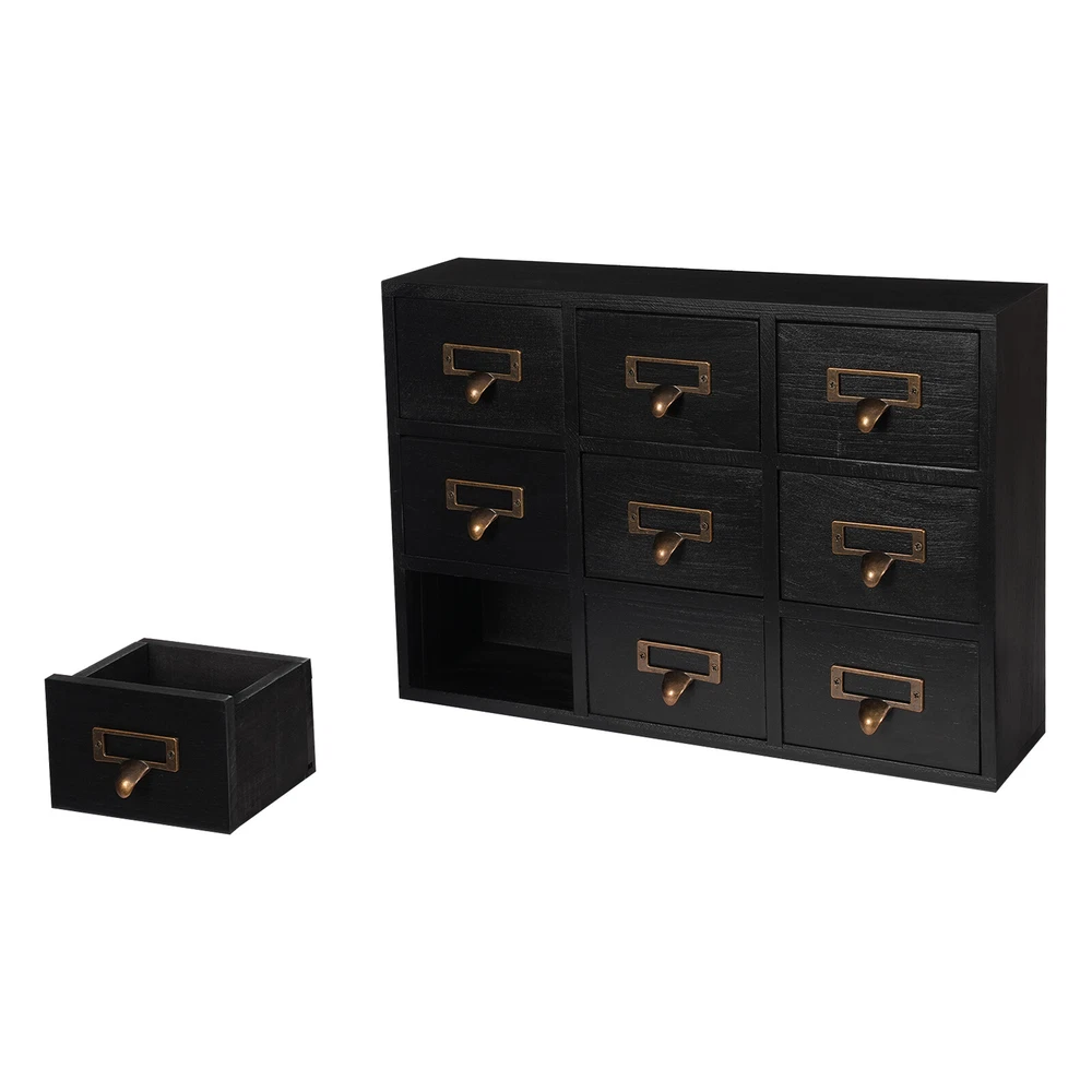 Apothecary Chest Cabinet, Wooden Medicine Drawer Organizer Box With 9 Drawer Description Cleanness and tidiness are a good attitude towards life and will put you and your family in a good mood, our 9-drawer storage cabinet is made of high-quality material, has sufficient storage space, has a beautiful and practical design, and allows you to neatly and efficiently organize your belongings, and makes you feel organized and relaxed. Say goodbye to a cluttered desk and enjoy a neater, more efficient life! Key Features Sturdy and Durable: It is made of high-quality wood and metal with a painting treatment, which is eco-friendly, odorless, anti-corrosion and rust-resistant , ensuring its beauty and a long time use. Excellent Organizer: This set of 9 drawers can sort and store data cables, kinds of medicinal herbs, and other daily essentials to create a cleaner, tidier office and home environment. Meanwhile, the top platform allows you to place some keys, and chargers to make full use of your space. Exquisite and Rustic: The black color scheme combines a minimalist design with clear wood grains to create a minimalist aesthetic and reveal a strong retro charm permeated with the flavor of time precipitation. Stable Construction: The thickened material and rectangular structure give it excellent stability, meeting your needs for storing various items without tipping o ver. Effortless Clean: Thanks to its smooth surface, simple construction, and closed dustproof design, you can wipe it clean with a damp rag. Installation-free : What you receive will be an already assembled product, so you can use it directly, which is very convenient and time-saving. Protective Package: We use bubble bags to package our product, designed to maximize protection from damage during shipping. Ideal Gift: Thanks to its practicality, it will make a fine gift for family, friends, and loved ones on Christmas, Father's Day, Mother's Day, birthdays, anniversaries, and holidays. Details Rounded Corners: The rounded edges are burr-free , which is comfortable to touch a nd can care for your skin. Metal Handles: Ergonomically designed metal handles allow you to pull drawer doors open or close with ease. Tag Slot: It allows you to place labels for the items, making it easier to reach items, and saving you time rummaging. Application It is suitable for placing in your living room, dresser, kitchen, office, etc., to store necklaces, earrings, bracelets, rings, crystals, cosmetics, perfumes, lipsticks, tea bags, espresso packets, sugar packets, keys, watches, receipts, credit cards, electronics, small cords, chargers, batteries, pens, letters, staples, tape holders, sewing needles, buttons, tool bits, small precision tools, herbal remedies, nutrition-related capsule/tablet bottles, apothecary jars, household medications and general small items. Specification Material: Wood and Metal Color: Black Style: Rustic Process: Painting Shape: Rectangular Assembly Required: No Mounting Type: Tabletop Number of Drawers: 9 Each Drawer Size: 11.4*9.5*6.3cm/4.5*3.7*2.5in Drawer Door Height: 7.4cm/2.9in Product Size: 38*9.5*26cm/15*3.7*10.2in Package Size: 40*12*28cm/15.75*4.72*11.02in Net Weight: 2.5kg/5.5lbs Gross Weight: 3kg/6.6lbs Package Included 1* 9-Drawer Storage Cabinet Notes Please check the product size before purchasing. Please note that the log product is subject to wood knots, scabs, mineral threads, etc., but it's normal. Please make sure that you do not mind before purchasing. Please note that this product does not include keys and other storage items. Please allow the slight color difference caused by the shooting light and 1-3cm error due to manual measurement and make sure you do not mind before ordering. Payment Delivery details Terms of sales About us Contact us Payment We accept ebay payment 。 Fees such as import duties, taxes are not included in the item price or shipping costs. These charges are the buyer's responsibility. Delivery details Shipping: 2-9 working days to: USA Terms of sales We maintain high standards of excellence and strive for hundred percent customer satisfaction. Feedback is very important to us. We hope that you contact us immediately before you give neutral or negative feedback, so that we can address your concerns. It is impossible to address issues if we do not know about them! About us Your satis faction is our ultimate goal. We work hard to earn your trust and future business. Our certified technicians have tested each item before shipping. The unit comes with 1 year limited warranty on all manufacturing defects. a) If you receive a defective item, you may return it or ask for a discount. Please contact us within 14 days after you receive the package. b) What you returned must be intact and in its original packaging as re? u. Customer is responsible for shipping costs of the returned item. c) We will cover the cost of shipping back t with the shipping rate indicated in the registration page. We will send you a new unit or refund the full payment you paid. Thank you. Contact us Business Hour Business Hour: Monday To Friday: 8:30 AM to 5:00 PM (Beijing China time) Due to time zones, our reply to your questions may not be immediately. But within above working time, we will reply your email within 24 hours. If it's non-workdays, please kindly be patient and wait till Monday. Please contact us with ebay message. Please feel free to contact us if you have any questions. Monday To Friday: 8:30 AM to 5:00 PM (Beijing China time) Due to time zones, our reply to your questions may not be immediately. But within above working time, we will reply your email within 24 hours. If it's non-workdays, please kindly be patient and wait till Monday. Please contact us with ebay message. Please feel free to contact us if you have any questions.