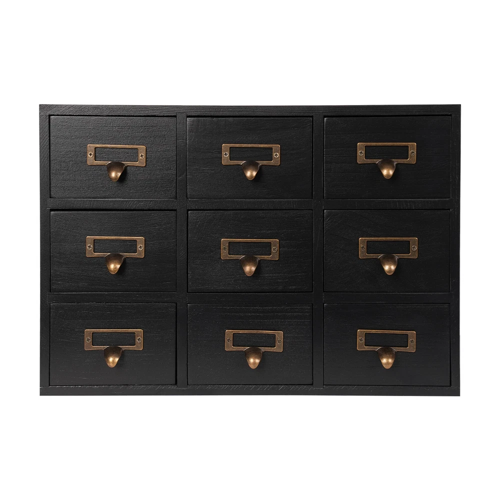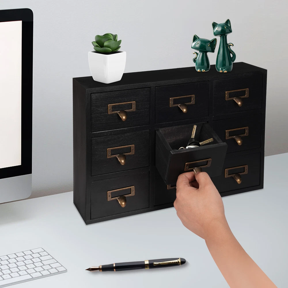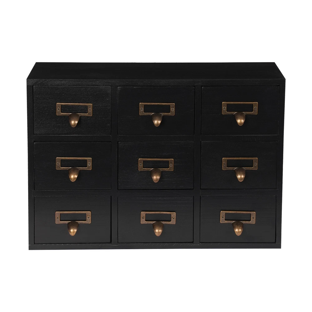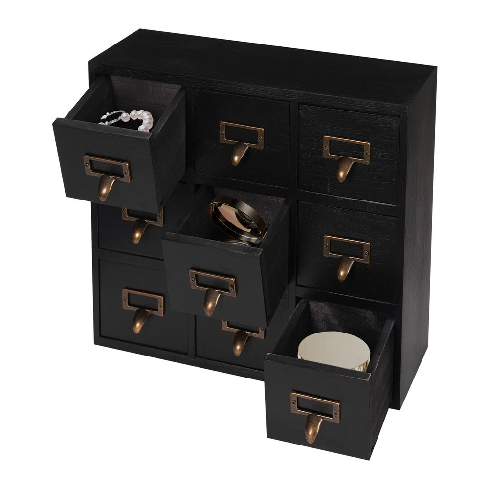 Apothecary Chest Cabinet, Wooden Medicine Drawer Organizer Box With 9 Drawer Description Cleanness and tidiness are a good attitude towards life and will put you and your family in a good mood, our 9-drawer storage cabinet is made of high-quality material, has sufficient storage space, has a beautiful and practical design, and allows you to neatly and efficiently organize your belongings, and makes you feel organized and relaxed. Say goodbye to a cluttered desk and enjoy a neater, more efficient life! Key Features Sturdy and Durable: It is made of high-quality wood and metal with a painting treatment, which is eco-friendly, odorless, anti-corrosion and rust-resistant , ensuring its beauty and a long time use. Excellent Organizer: This set of 9 drawers can sort and store data cables, kinds of medicinal herbs, and other daily essentials to create a cleaner, tidier office and home environment. Meanwhile, the top platform allows you to place some keys, and chargers to make full use of your space. Exquisite and Rustic: The black color scheme combines a minimalist design with clear wood grains to create a minimalist aesthetic and reveal a strong retro charm permeated with the flavor of time precipitation. Stable Construction: The thickened material and rectangular structure give it excellent stability, meeting your needs for storing various items without tipping o ver. Effortless Clean: Thanks to its smooth surface, simple construction, and closed dustproof design, you can wipe it clean with a damp rag. Installation-free : What you receive will be an already assembled product, so you can use it directly, which is very convenient and time-saving. Protective Package: We use bubble bags to package our product, designed to maximize protection from damage during shipping. Ideal Gift: Thanks to its practicality, it will make a fine gift for family, friends, and loved ones on Christmas, Father's Day, Mother's Day, birthdays, anniversaries, and holidays. Details Rounded Corners: The rounded edges are burr-free , which is comfortable to touch a nd can care for your skin. Metal Handles: Ergonomically designed metal handles allow you to pull drawer doors open or close with ease. Tag Slot: It allows you to place labels for the items, making it easier to reach items, and saving you time rummaging. Application It is suitable for placing in your living room, dresser, kitchen, office, etc., to store necklaces, earrings, bracelets, rings, crystals, cosmetics, perfumes, lipsticks, tea bags, espresso packets, sugar packets, keys, watches, receipts, credit cards, electronics, small cords, chargers, batteries, pens, letters, staples, tape holders, sewing needles, buttons, tool bits, small precision tools, herbal remedies, nutrition-related capsule/tablet bottles, apothecary jars, household medications and general small items. Specification Material: Wood and Metal Color: Black Style: Rustic Process: Painting Shape: Rectangular Assembly Required: No Mounting Type: Tabletop Number of Drawers: 9 Each Drawer Size: 11.4*9.5*6.3cm/4.5*3.7*2.5in Drawer Door Height: 7.4cm/2.9in Product Size: 38*9.5*26cm/15*3.7*10.2in Package Size: 40*12*28cm/15.75*4.72*11.02in Net Weight: 2.5kg/5.5lbs Gross Weight: 3kg/6.6lbs Package Included 1* 9-Drawer Storage Cabinet Notes Please check the product size before purchasing. Please note that the log product is subject to wood knots, scabs, mineral threads, etc., but it's normal. Please make sure that you do not mind before purchasing. Please note that this product does not include keys and other storage items. Please allow the slight color difference caused by the shooting light and 1-3cm error due to manual measurement and make sure you do not mind before ordering. Payment Delivery details Terms of sales About us Contact us Payment We accept ebay payment 。 Fees such as import duties, taxes are not included in the item price or shipping costs. These charges are the buyer's responsibility. Delivery details Shipping: 2-9 working days to: USA Terms of sales We maintain high standards of excellence and strive for hundred percent customer satisfaction. Feedback is very important to us. We hope that you contact us immediately before you give neutral or negative feedback, so that we can address your concerns. It is impossible to address issues if we do not know about them! About us Your satis faction is our ultimate goal. We work hard to earn your trust and future business. Our certified technicians have tested each item before shipping. The unit comes with 1 year limited warranty on all manufacturing defects. a) If you receive a defective item, you may return it or ask for a discount. Please contact us within 14 days after you receive the package. b) What you returned must be intact and in its original packaging as re? u. Customer is responsible for shipping costs of the returned item. c) We will cover the cost of shipping back t with the shipping rate indicated in the registration page. We will send you a new unit or refund the full payment you paid. Thank you. Contact us Business Hour Business Hour: Monday To Friday: 8:30 AM to 5:00 PM (Beijing China time) Due to time zones, our reply to your questions may not be immediately. But within above working time, we will reply your email within 24 hours. If it's non-workdays, please kindly be patient and wait till Monday. Please contact us with ebay message. Please feel free to contact us if you have any questions. Monday To Friday: 8:30 AM to 5:00 PM (Beijing China time) Due to time zones, our reply to your questions may not be immediately. But within above working time, we will reply your email within 24 hours. If it's non-workdays, please kindly be patient and wait till Monday. Please contact us with ebay message. Please feel free to contact us if you have any questions.