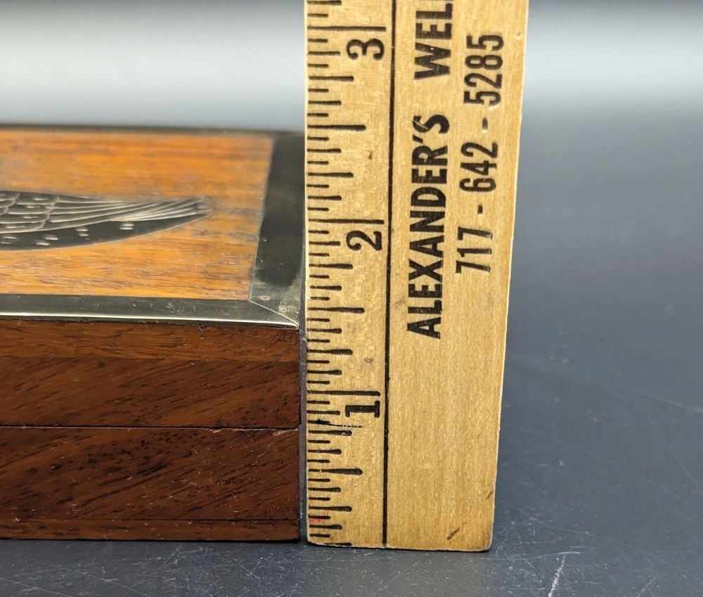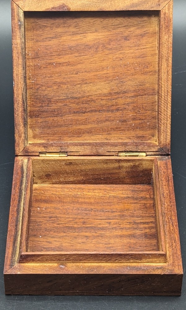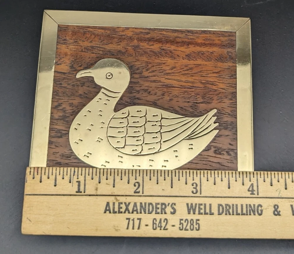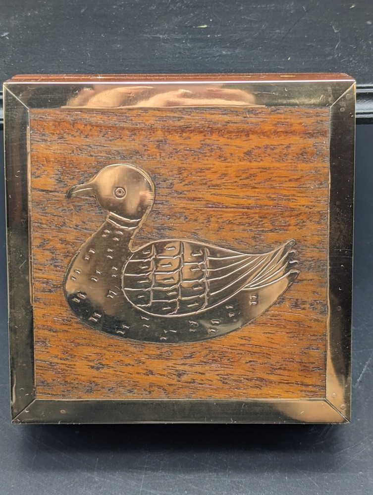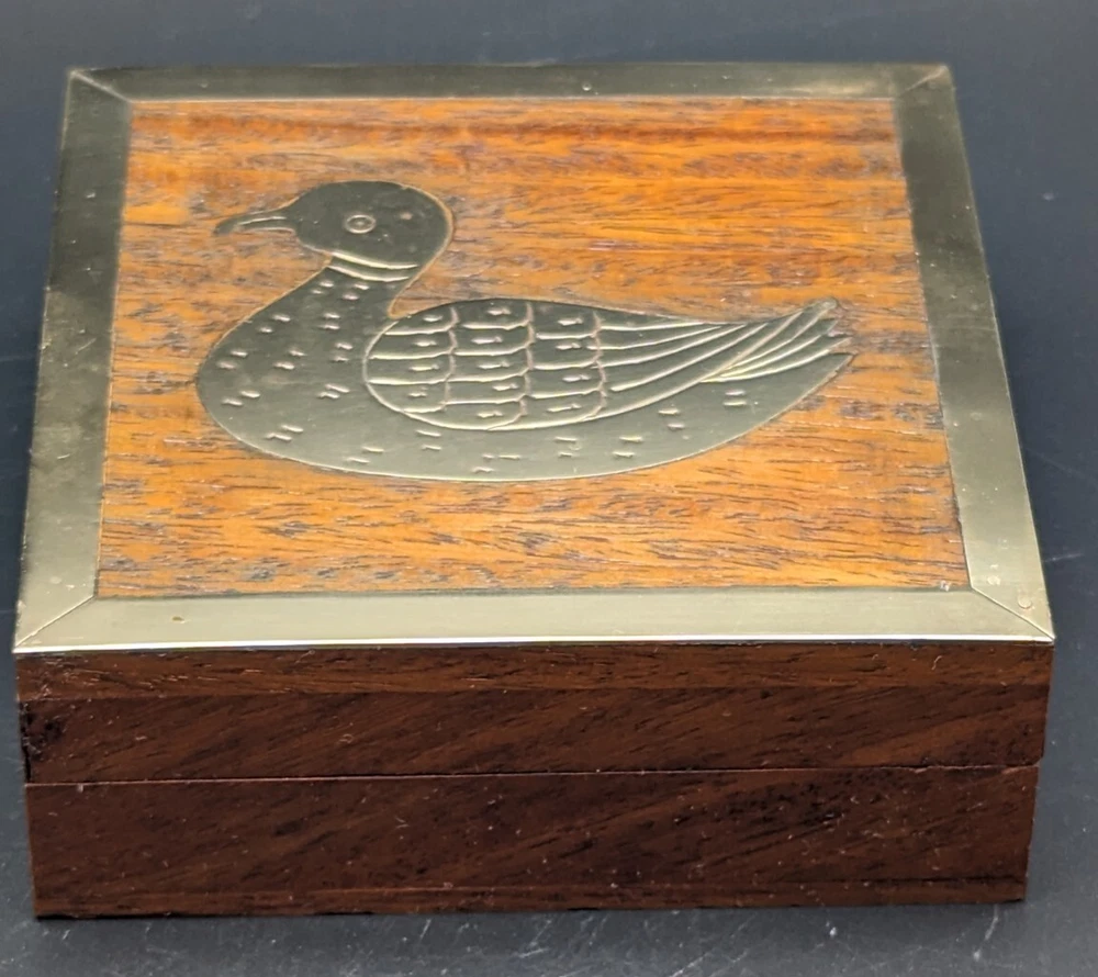 This vintage wooden trinket box is a charming collectible that adds character to any space. The box features a brass duck inlay and a hinged closure, making it perfect for storing small items. The mid-century modernism style and brown/brass color scheme make it suitable for all occasions and themes, from a rustic cabin to a modern apartment. Crafted with wood and brass materials, this box is an original handmade piece. The box is small in size, (approximately 4" × 4"× 1.5).