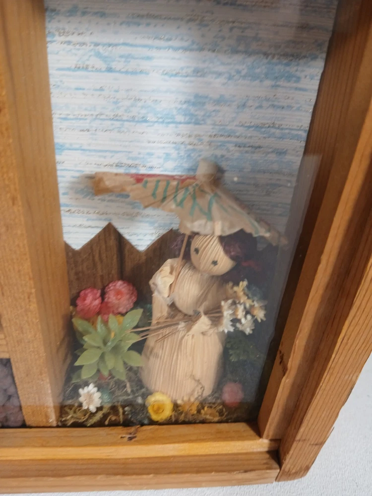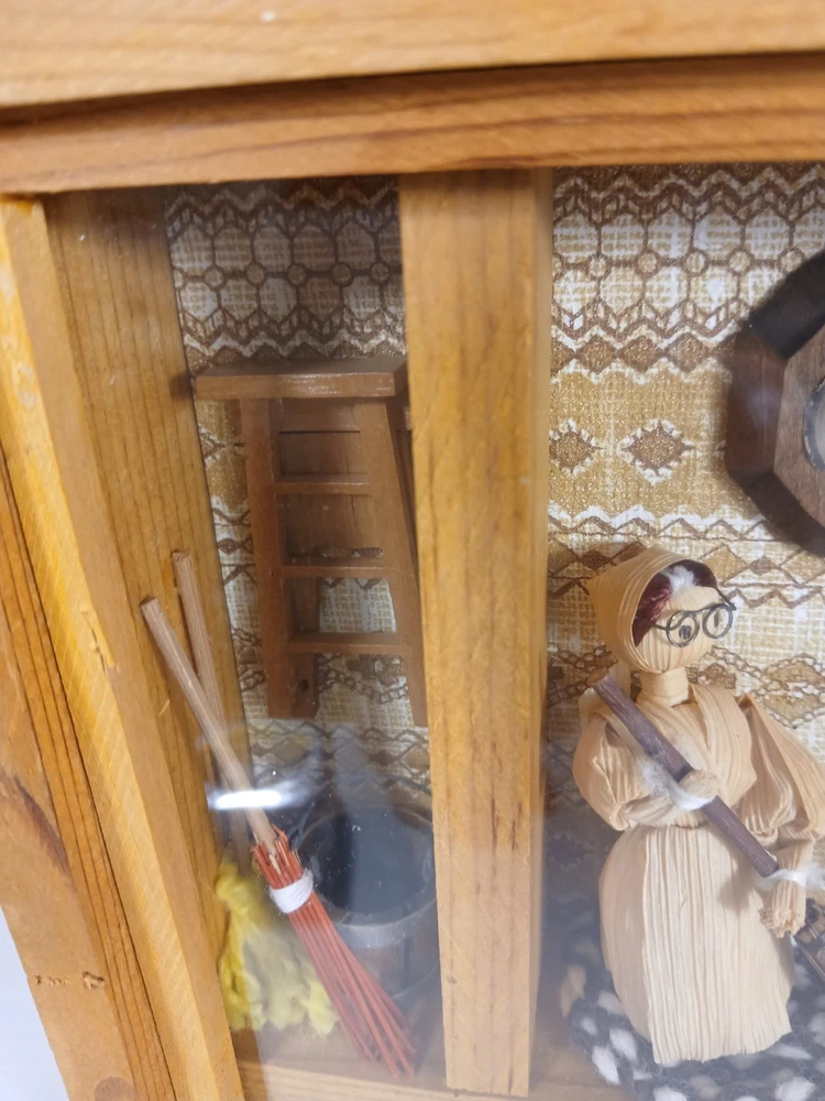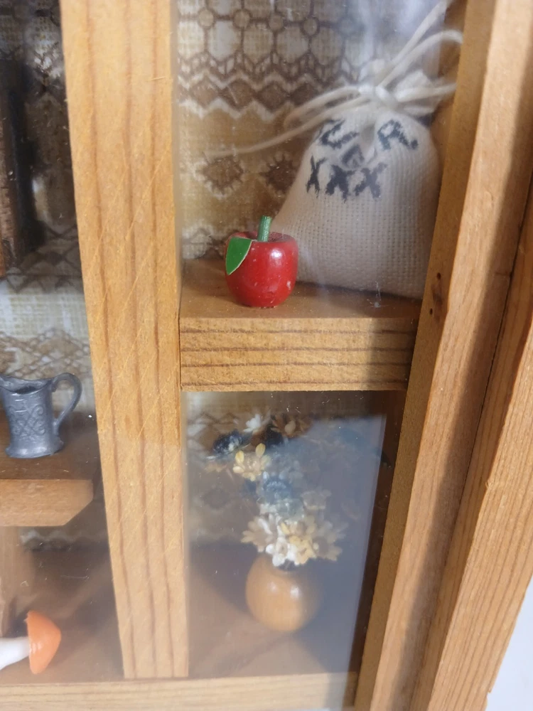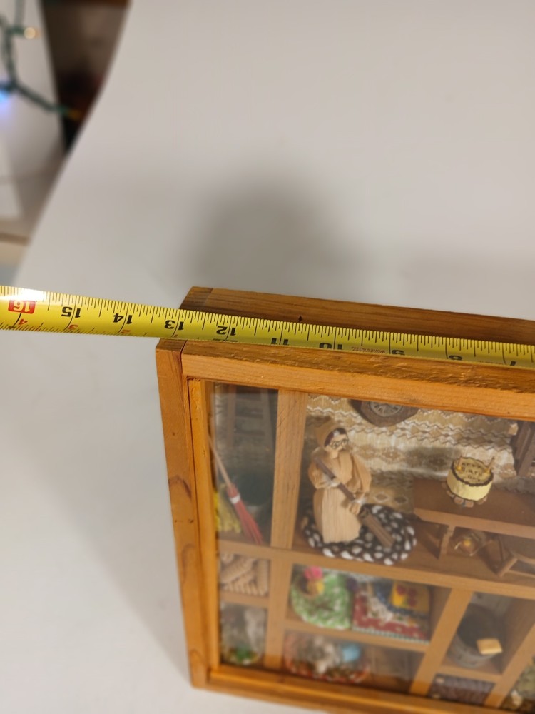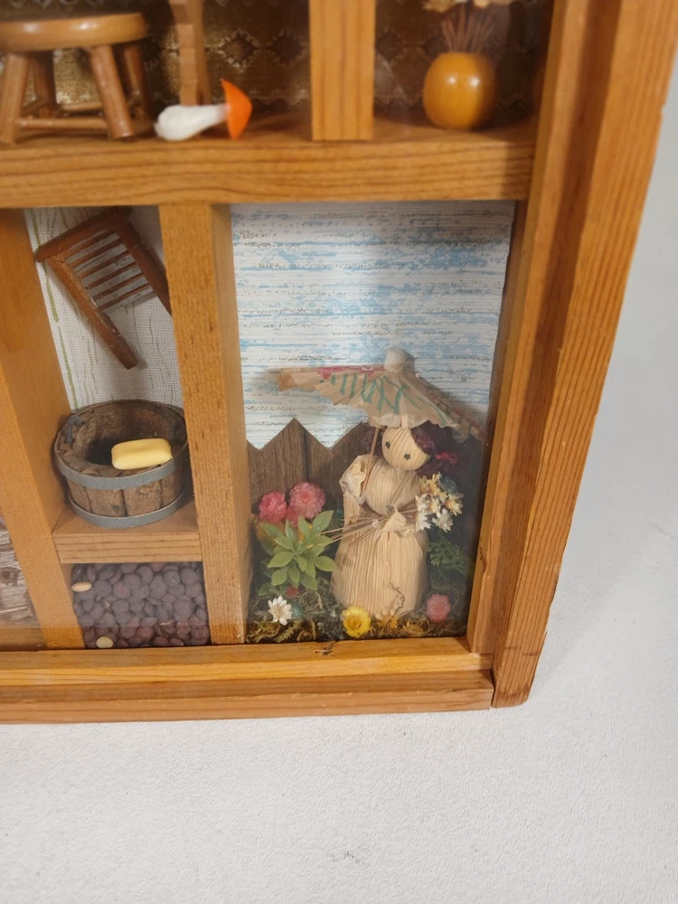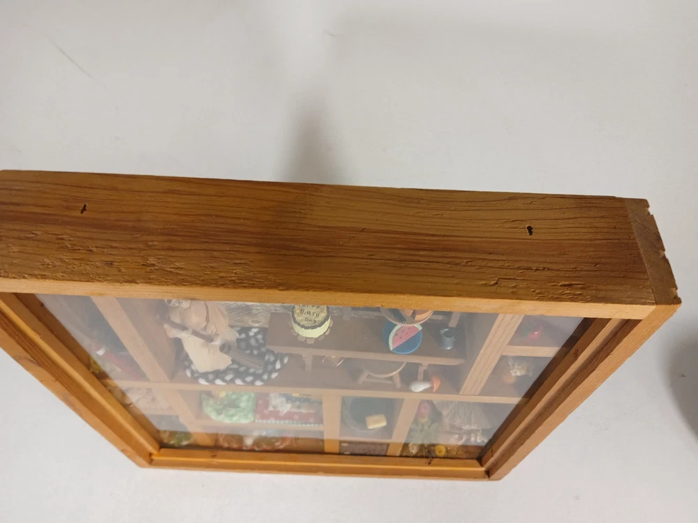 This vintage wooden kitchen shadow box features a rustic finish and is adorned with primitive 3D decor, making it a charming addition to any home. The square shape and hanging orientation add to its vintage appeal, while the multi-color accents and vintage country theme bring a touch of nostalgia to your space. Made with glass and wood materials, this shadow box showcases a portrait orientation and measures 13 inches in length, 13 inches in height, and 3 inches in width. Perfect for all occasions, this unique piece is a United States handmade treasure that adds character to your home décor. water damage on frame the two innermost wood rods came loose, I put them back they seem snug the table in box is overturned and not glued down. still fits the spilled milk theme frame has wear, knicks and some marks teddy bear in lower left is also unglued please see photos
