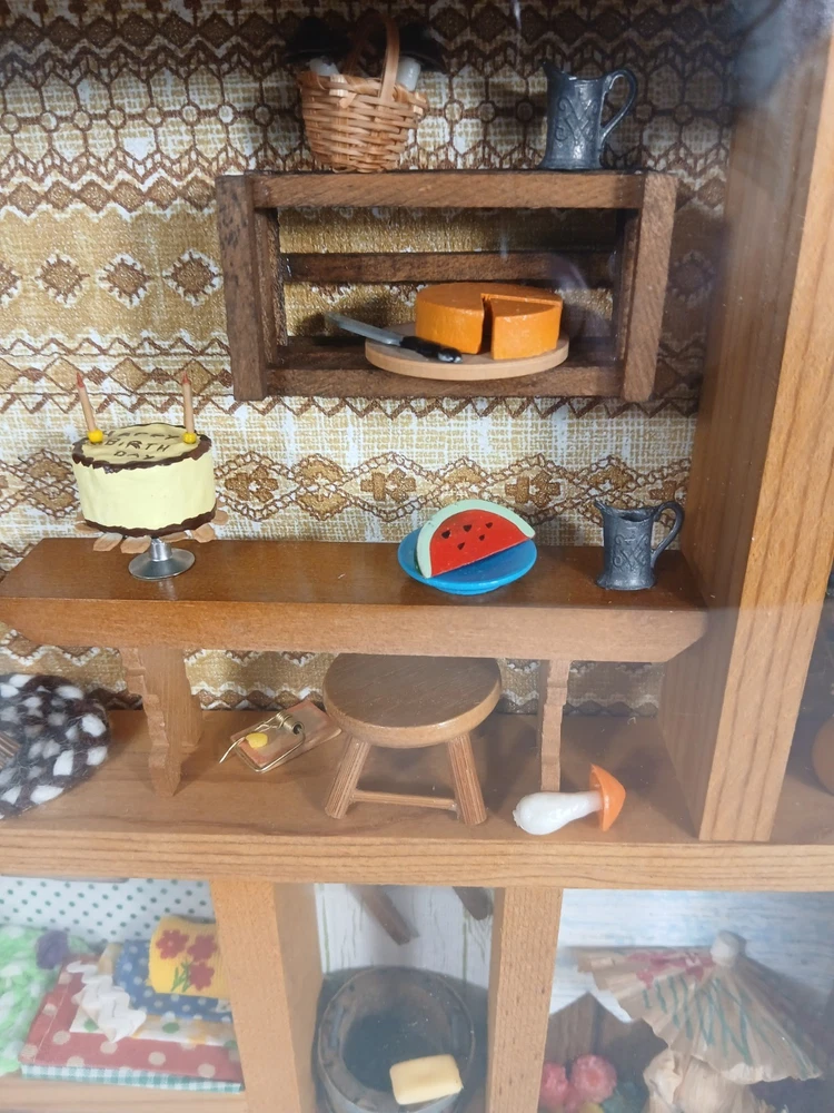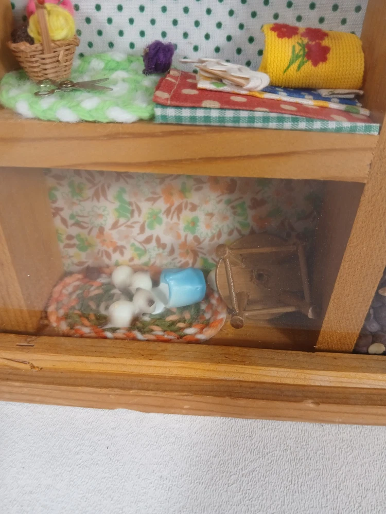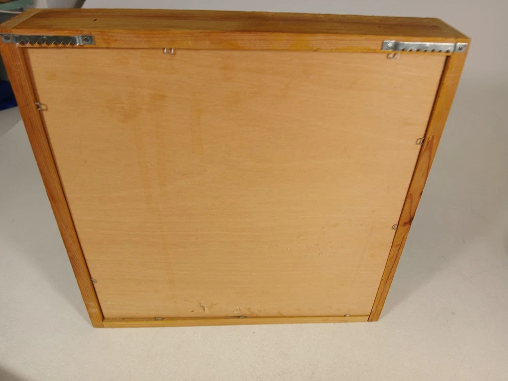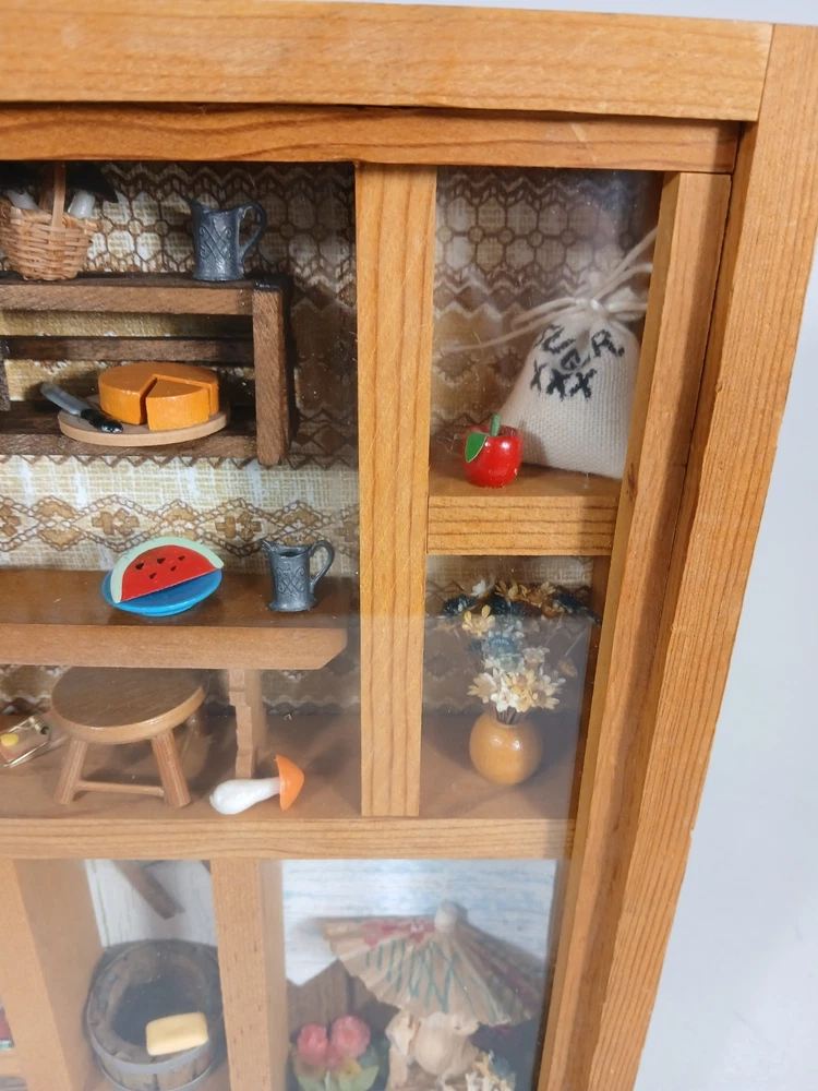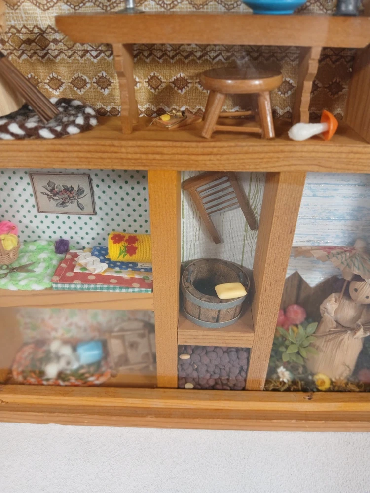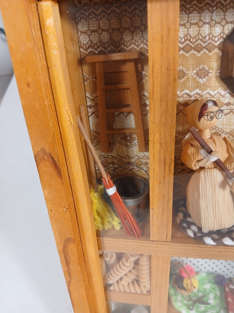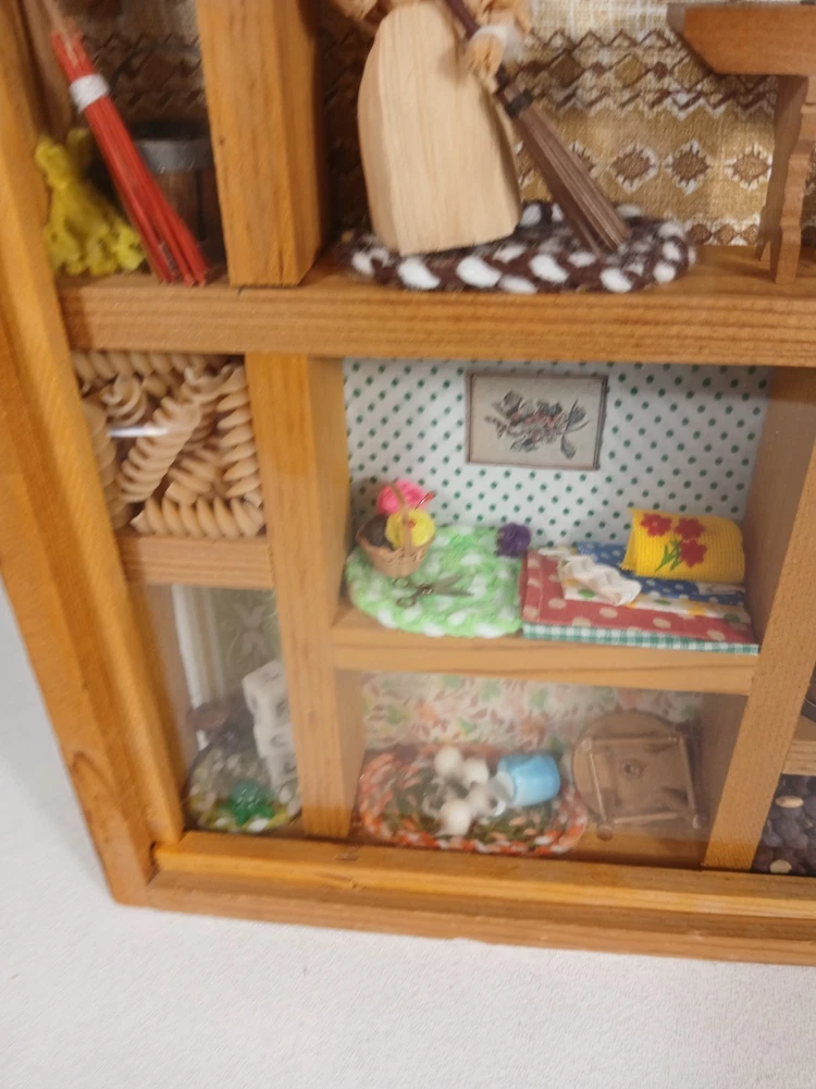 This vintage wooden kitchen shadow box features a rustic finish and is adorned with primitive 3D decor, making it a charming addition to any home. The square shape and hanging orientation add to its vintage appeal, while the multi-color accents and vintage country theme bring a touch of nostalgia to your space. Made with glass and wood materials, this shadow box showcases a portrait orientation and measures 13 inches in length, 13 inches in height, and 3 inches in width. Perfect for all occasions, this unique piece is a United States handmade treasure that adds character to your home décor. water damage on frame the two innermost wood rods came loose, I put them back they seem snug the table in box is overturned and not glued down. still fits the spilled milk theme frame has wear, knicks and some marks teddy bear in lower left is also unglued please see photos