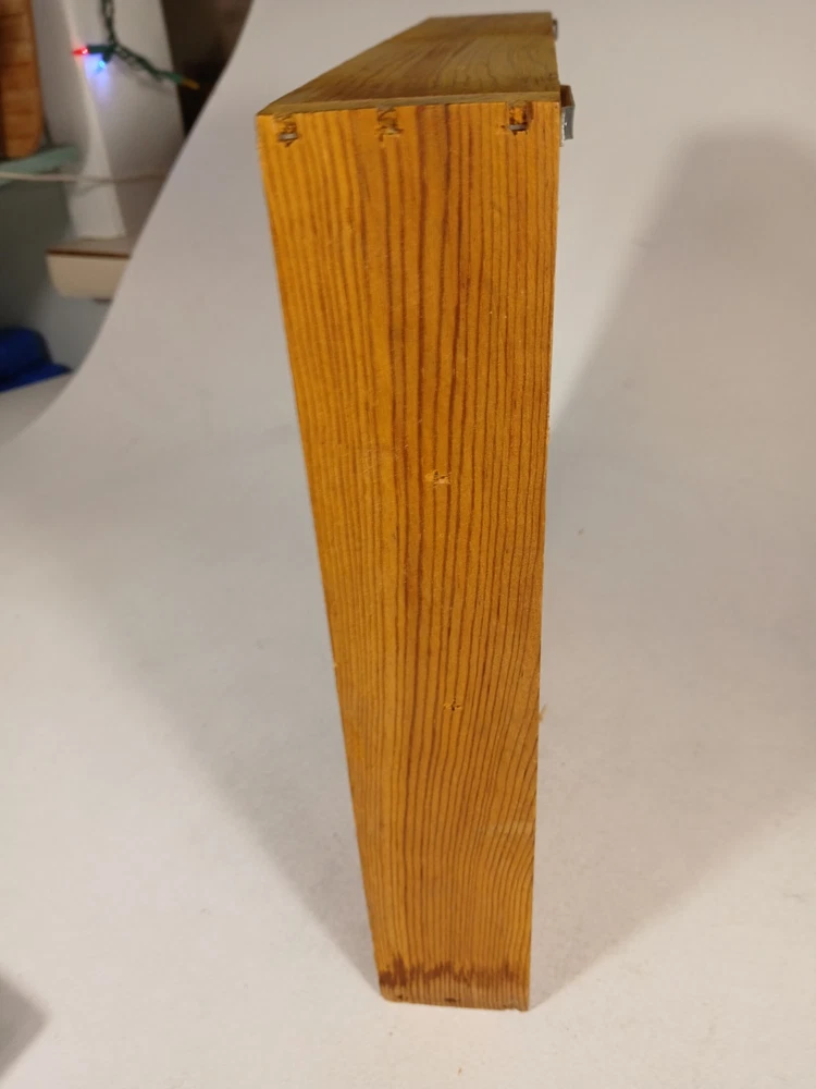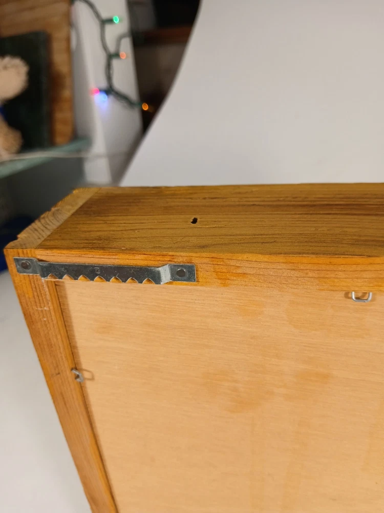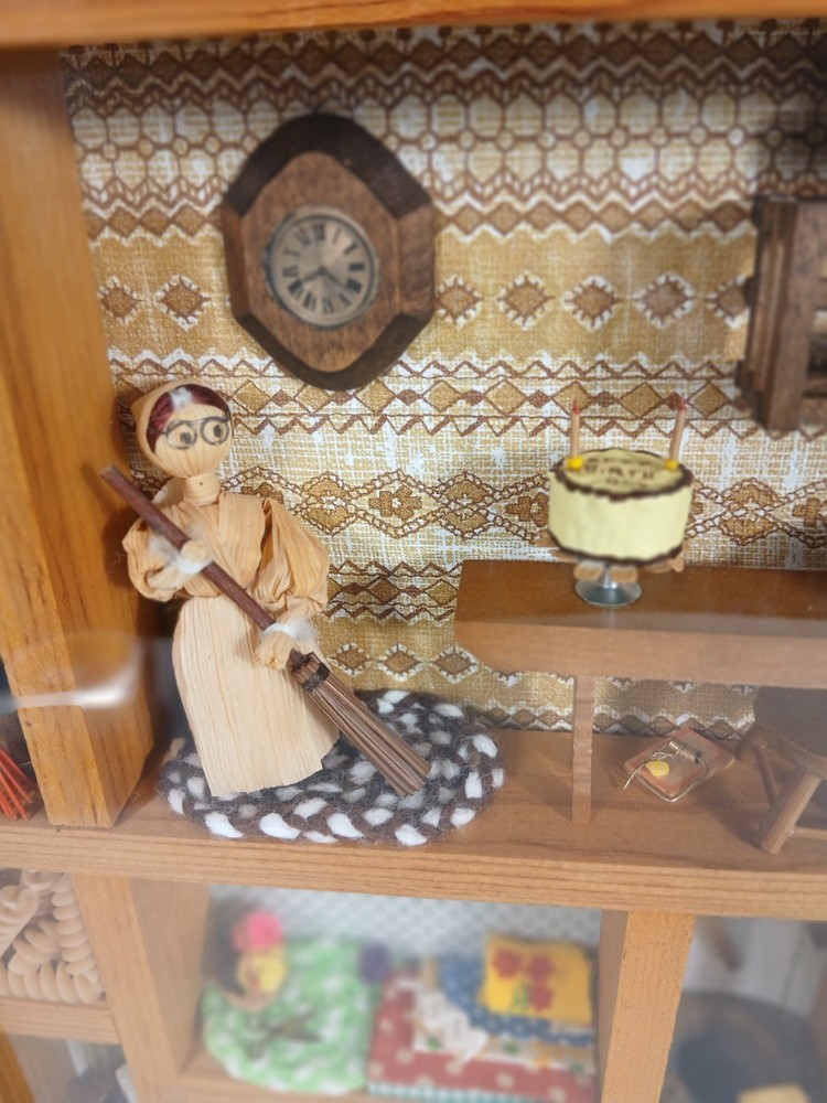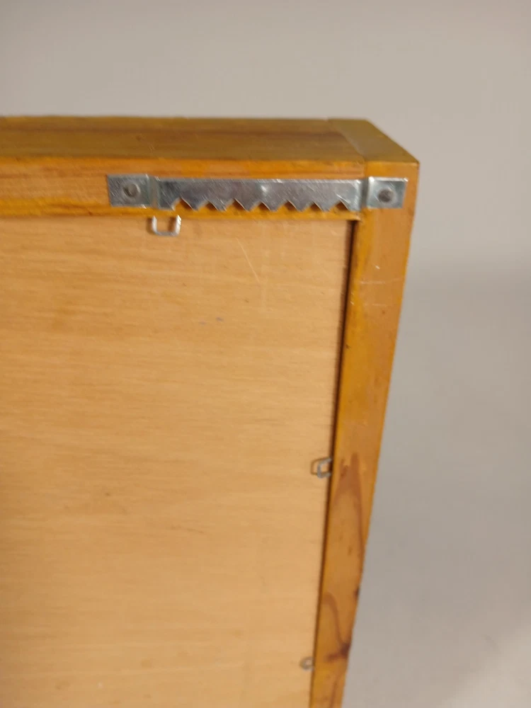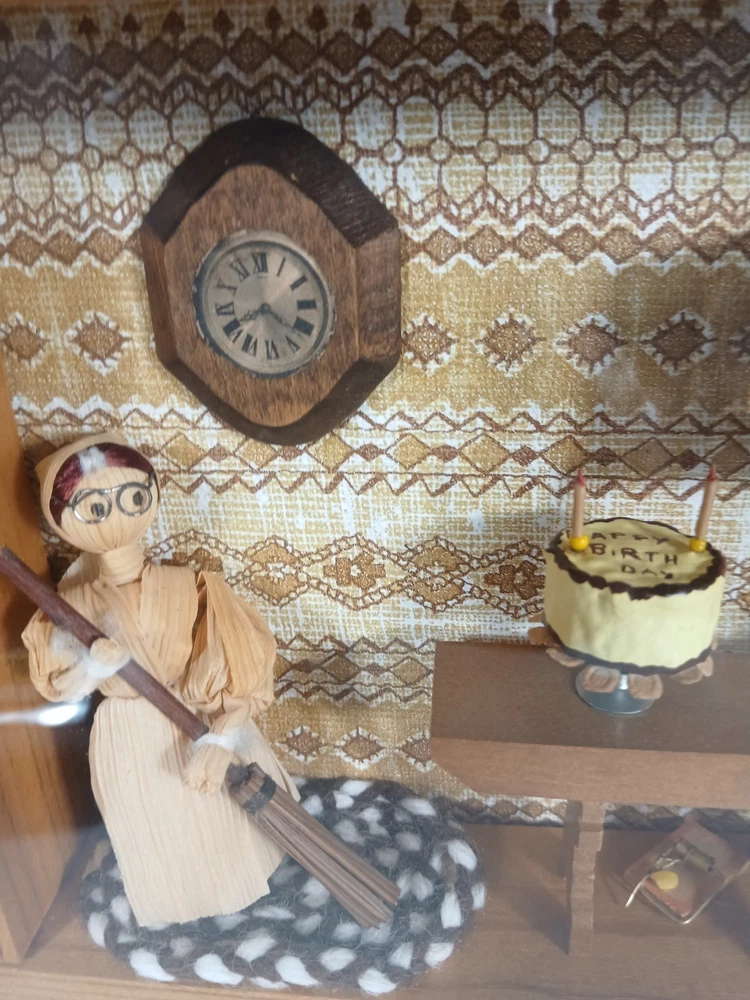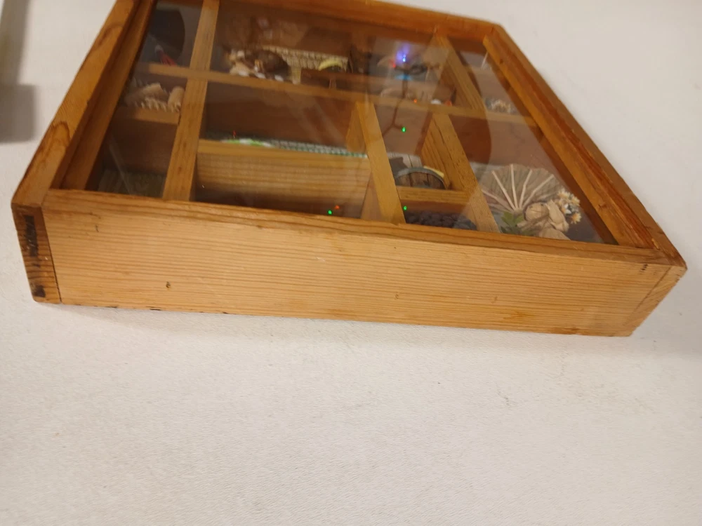 This vintage wooden kitchen shadow box features a rustic finish and is adorned with primitive 3D decor, making it a charming addition to any home. The square shape and hanging orientation add to its vintage appeal, while the multi-color accents and vintage country theme bring a touch of nostalgia to your space. Made with glass and wood materials, this shadow box showcases a portrait orientation and measures 13 inches in length, 13 inches in height, and 3 inches in width. Perfect for all occasions, this unique piece is a United States handmade treasure that adds character to your home décor. water damage on frame the two innermost wood rods came loose, I put them back they seem snug the table in box is overturned and not glued down. still fits the spilled milk theme frame has wear, knicks and some marks teddy bear in lower left is also unglued please see photos