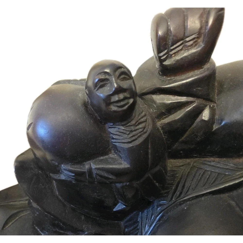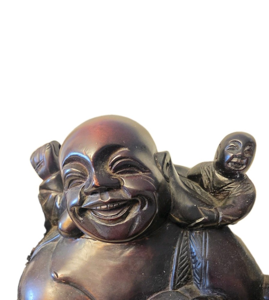 This beautiful 19th century vintage wood carved figure features a Laughing Smiling Buddha with children, standing at 8 inches tall. The brown-colored sculpture reflects the theme of Buddha and was originally created post-1940. A unique and antique piece, this figurine captures the essence of Buddhist teachings and traditional craftsmanship. Size: 10.5"x8"x4.5"