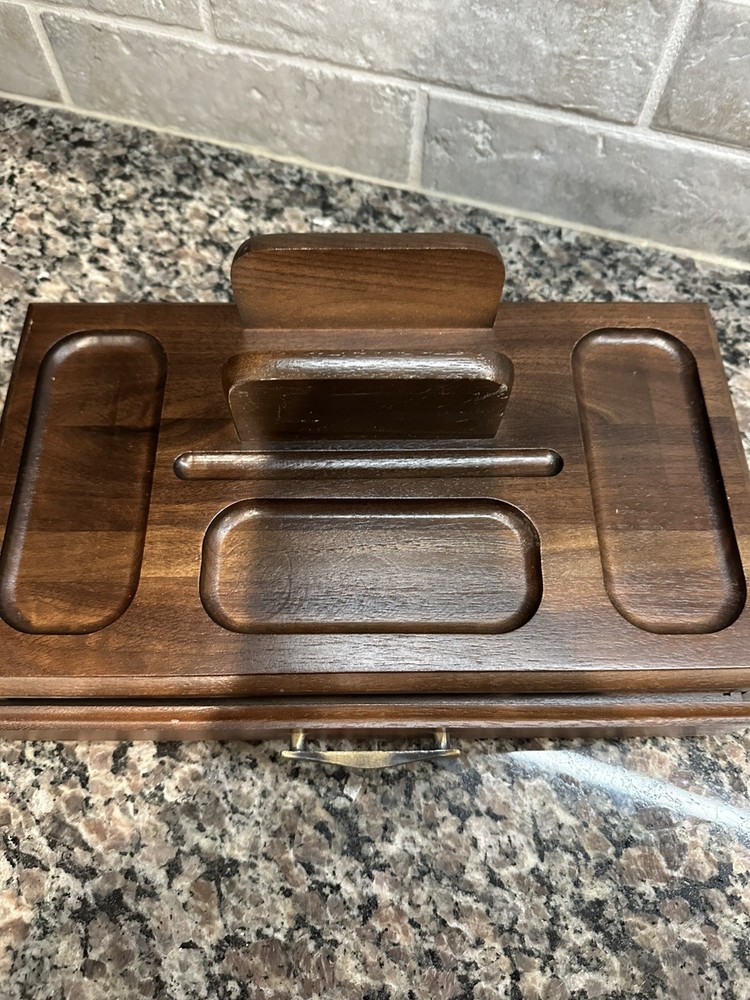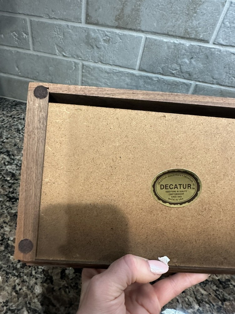 Keep your valuable items organized in this vintage Decatur men's wooden personal organizer. The tray/valet station is perfect for storing your jewelry, watches, and other small accessories. The brown velvet lining adds a touch of elegance and protects your items from scratches. The organizer is made of high-quality wood and measures 11 inches in length, 6.5 inches in width, and 2 inches in depth. It is ideal for men who appreciate vintage jewelry boxes and organizers. This item is perfect for your personal collection or as a gift for your loved ones.