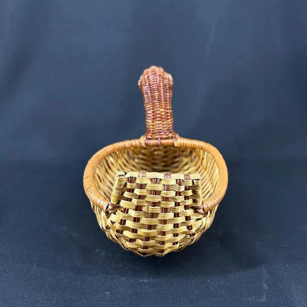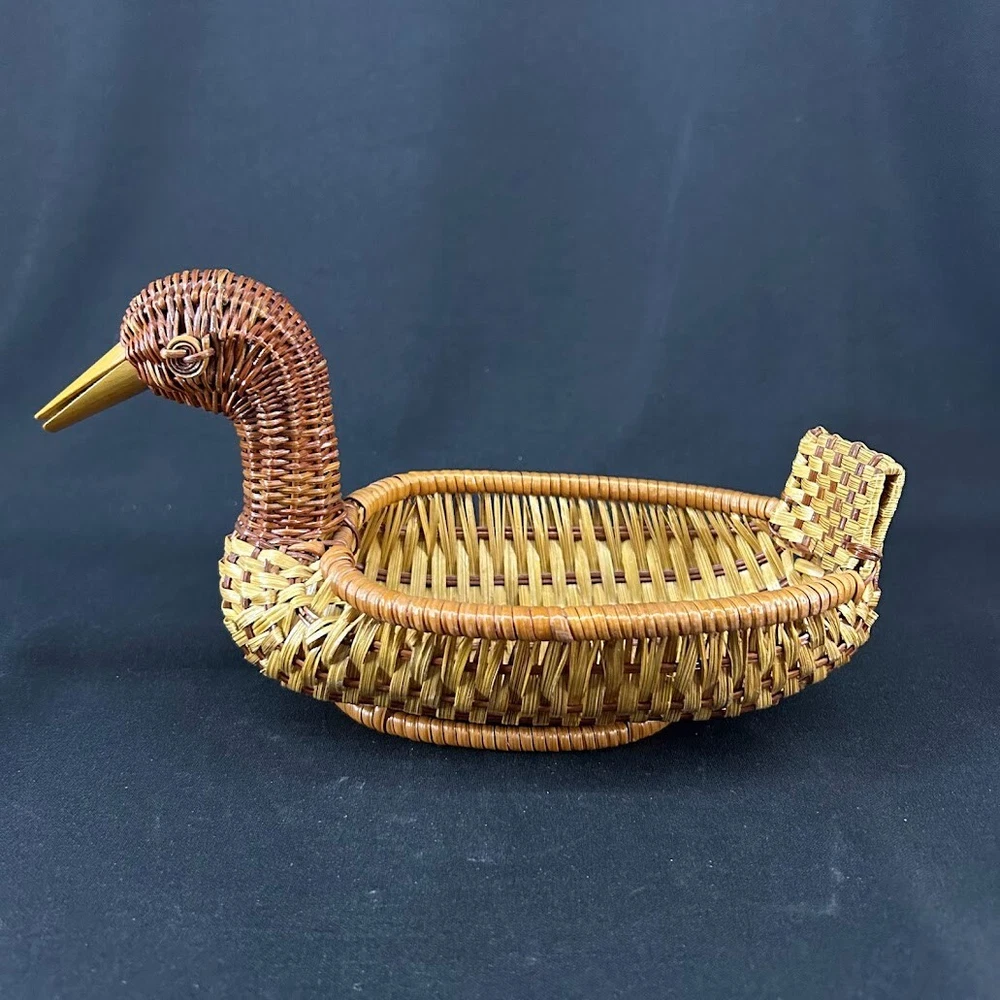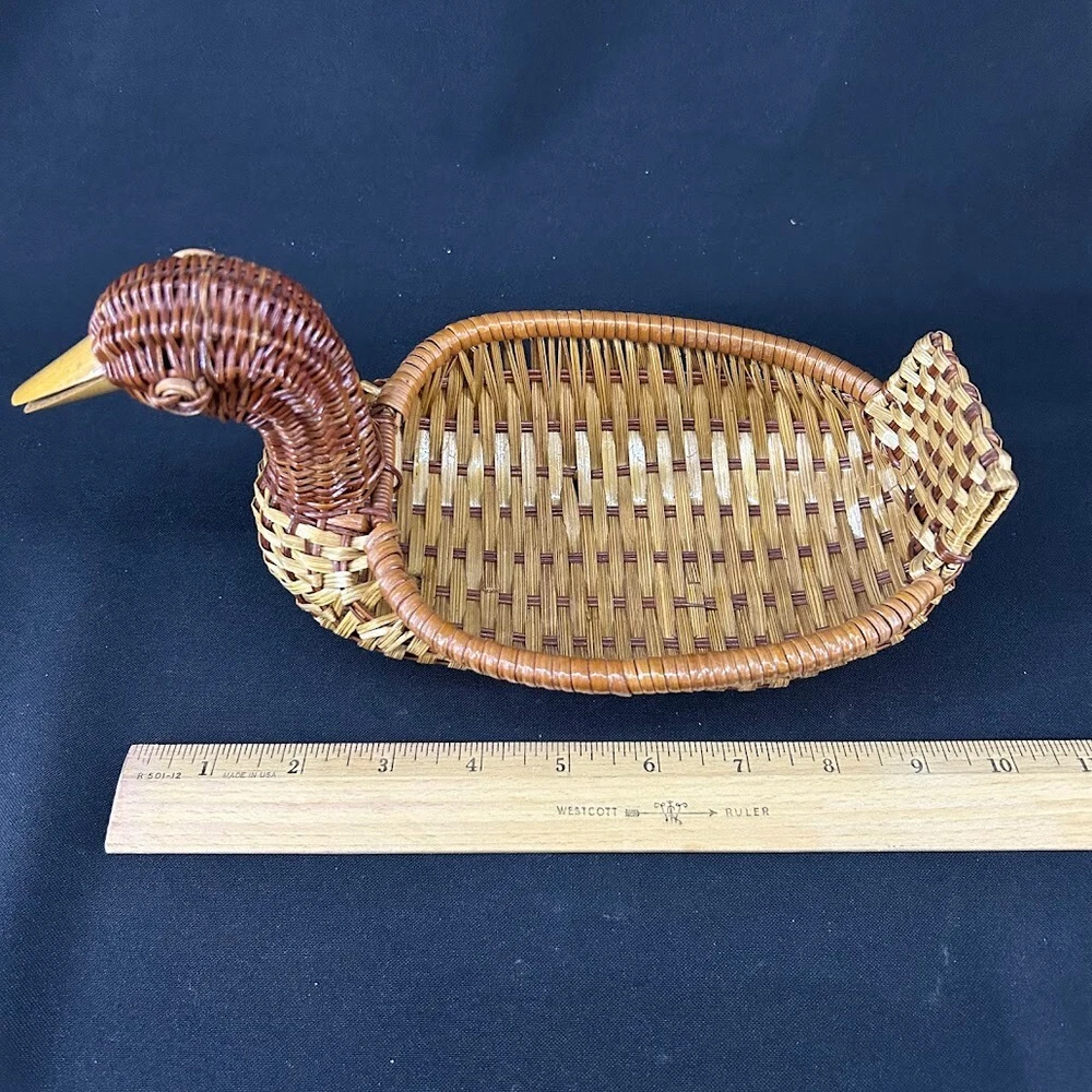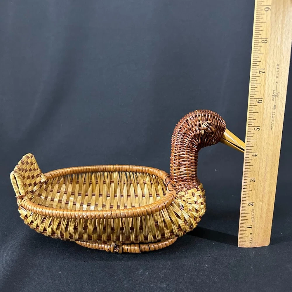 This vintage woven wicker duck basket is a charming addition to any farmhouse or rustic decor. The medium-sized basket is perfect for displaying on a table and features a woven design with a brown color scheme. The basket is handmade and has a duck shape, making it a unique and whimsical piece. The basket is suitable for all occasions and is perfect for teens and adults alike. It is an original, one-of-a-kind piece that is sure to delight collectors of decorative items. The basket has no closure and is made of wood, giving it a sturdy and durable quality. Add this vintage duck basket to your collection today!