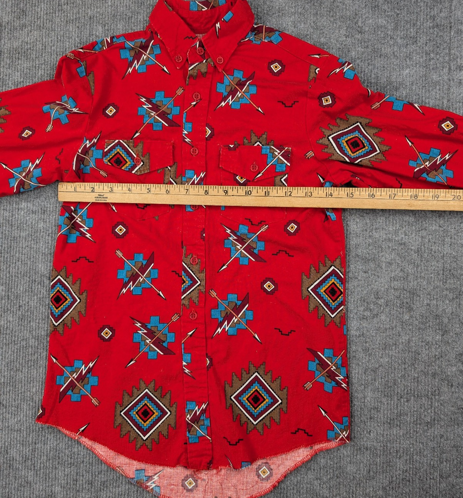 Brand: Wrangler Department: Boys Type: Button-Up Shirt Style: Western Shirt Color: Red Pattern: Southwestern / Aztec Material: Cotton (typical Wrangler western fabric) Fabric Type: Woven Sleeve Length: Long Sleeve Closure: Button Front Fit: Regular Season: Fall, Winter, Spring Features: Button-Down Collar, Chest Pockets, Western Style Condition: Pre-owned