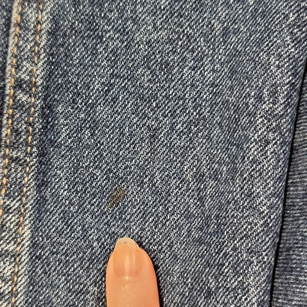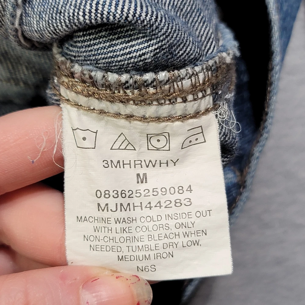 Brand: Wrangler Pattern: Solid Style: Bomber Jacket Color: Blue Closure: Button Collar Style: Spread Department: Men Jacket/Coat Length: Short Seller Notes: “Small, barely visible stain, pointed out.” Fabric Type: Denim Accents: Button Type: Jacket Outer Shell Material: Cotton Size: M Size Type: Regular