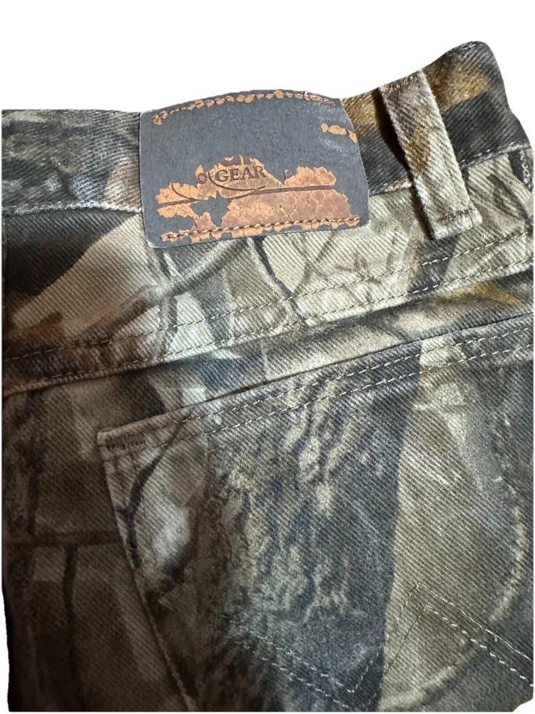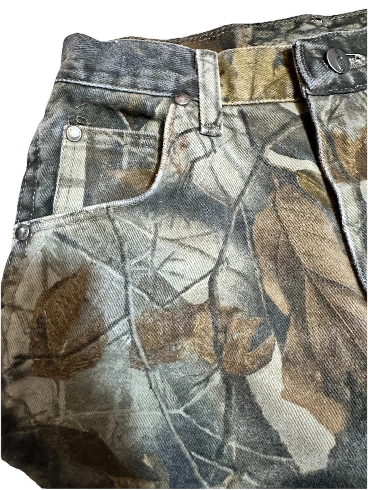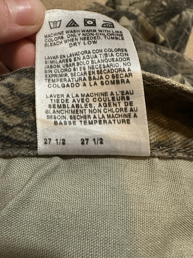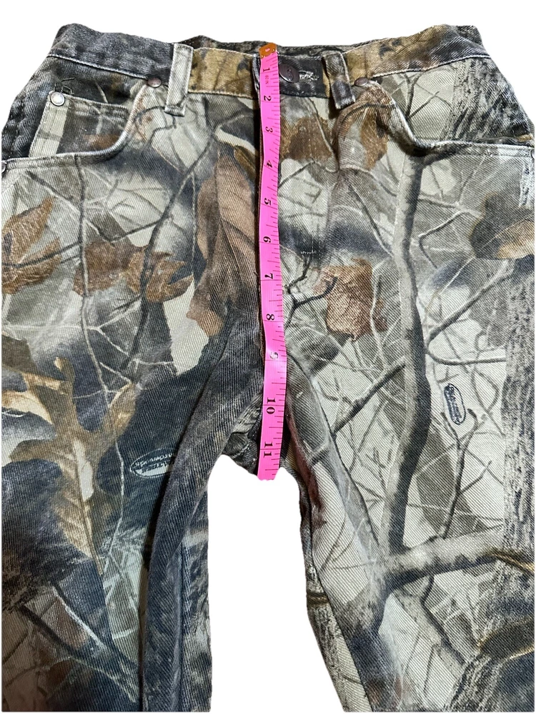 Vintage Wrangler Pro Gear Youth Camo Pants in size 14 made of 100% cotton. These multicolor pants feature a camouflage pattern, zip and button closures, and a carpenter style. They are machine washable and suitable for casual occasions. With a denim fabric type, these pants have a regular fit and come with pockets. Ideal for outdoor activities like hunting, fishing, hiking, and climbing in all seasons. Brand: Wrangler. Made in Mexico. These vintage hunting jeans are in great condition for their age. No problems with the jeans themselves. The Wrangler Pro Gear outer label on the back of the jeans is coming off as seen in pictures.