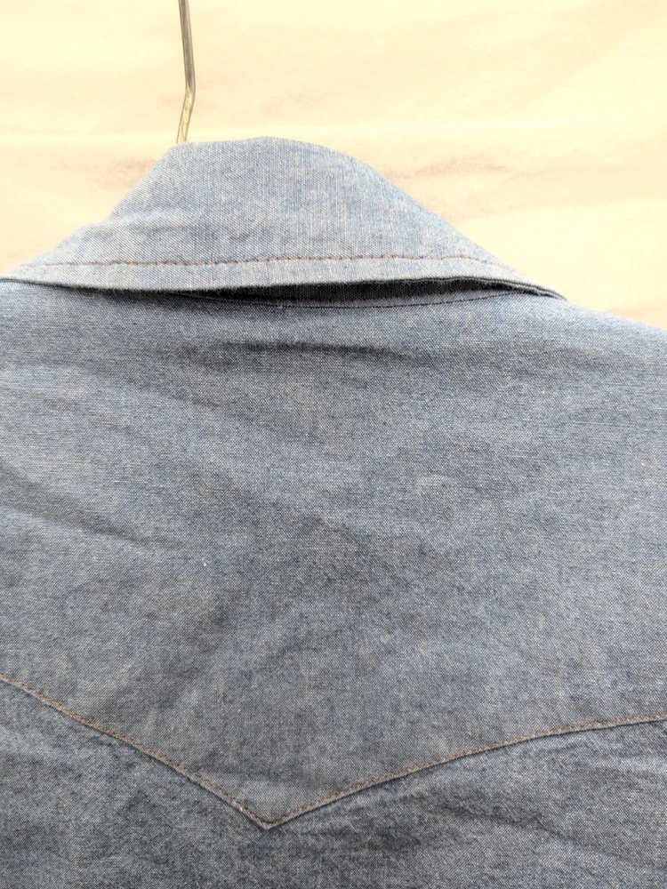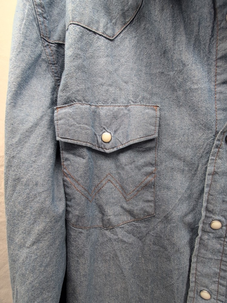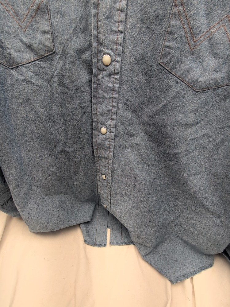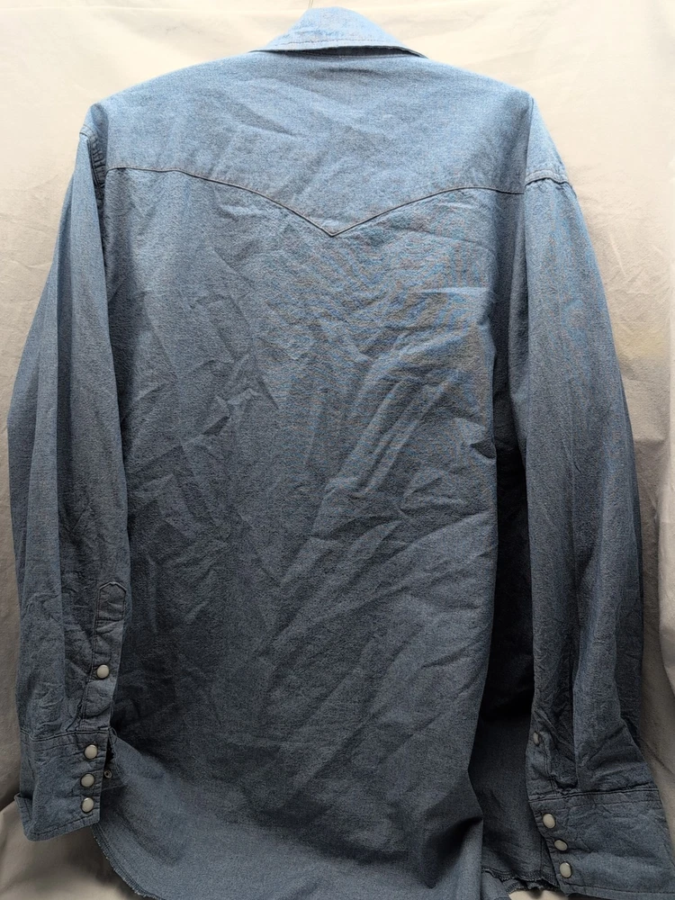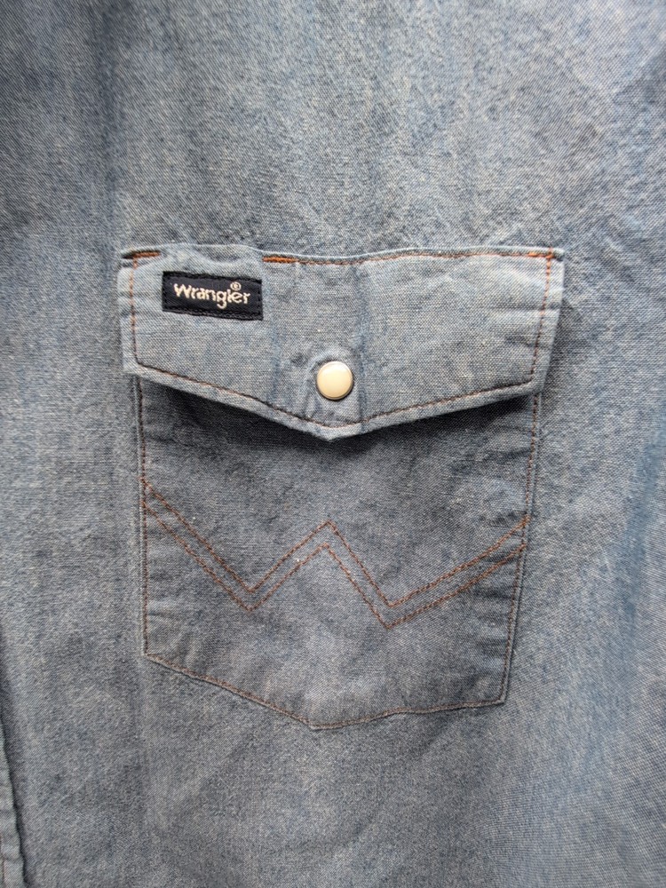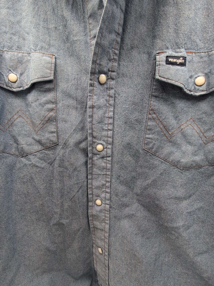 This vintage Wrangler Western denim shirt for men in size XL features pearl snap buttons, a collared neckline, and a classic button-down style. The shirt is made of durable cotton denim with a solid blue color, perfect for casual occasions with a touch of retro Western flair. The regular fit and standard cuff style make it a versatile addition to any wardrobe, with accents that hint at a cowboy or rodeo theme. Ideal for those who appreciate vintage western denim and the iconic Wrangler brand. pit to pit 25 inch