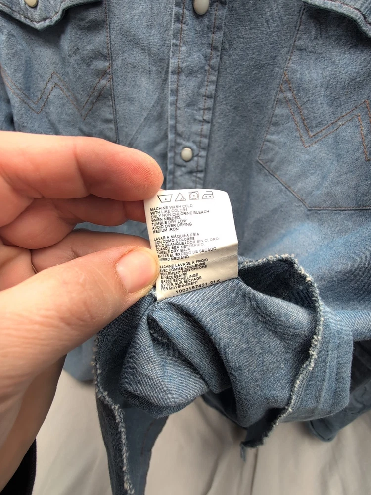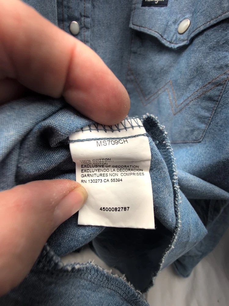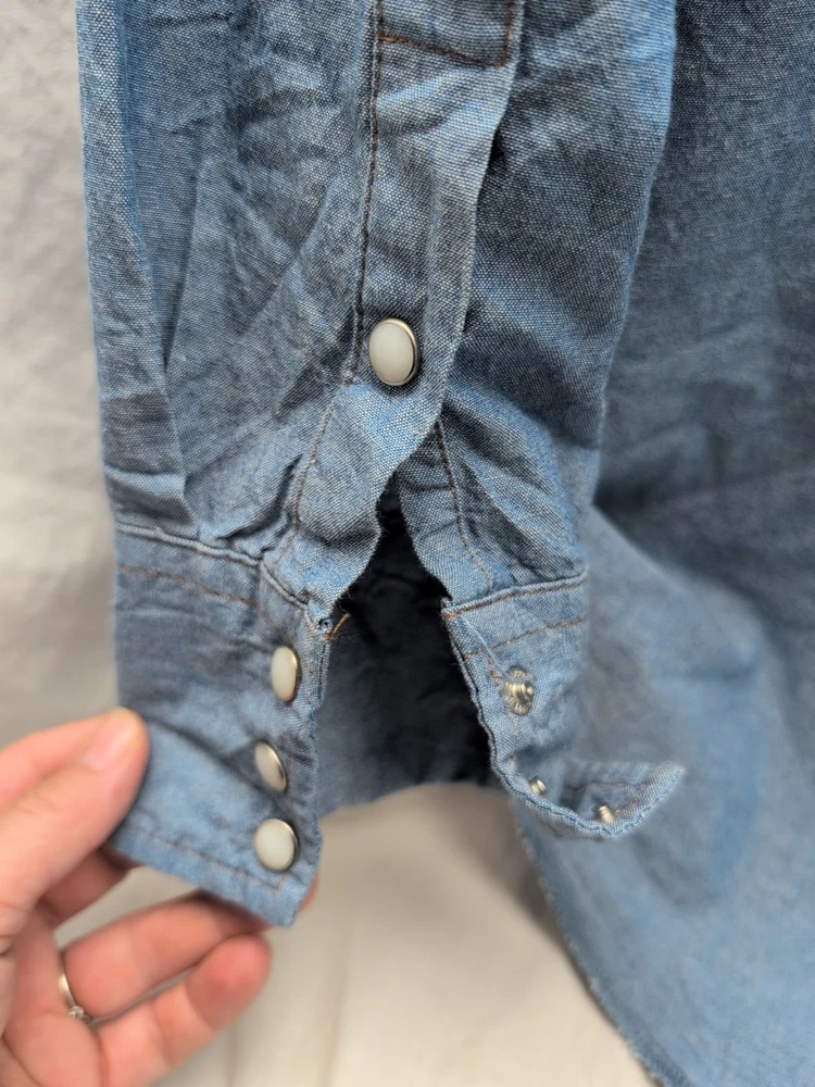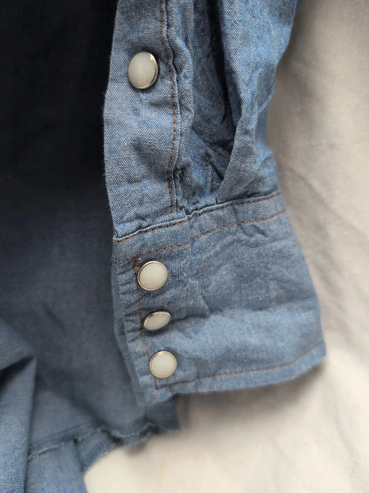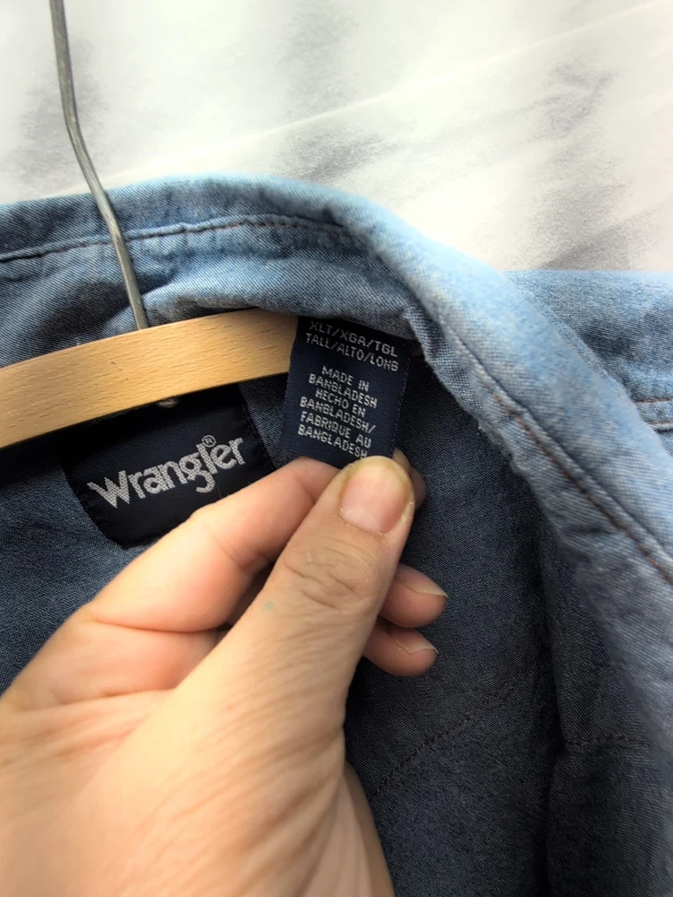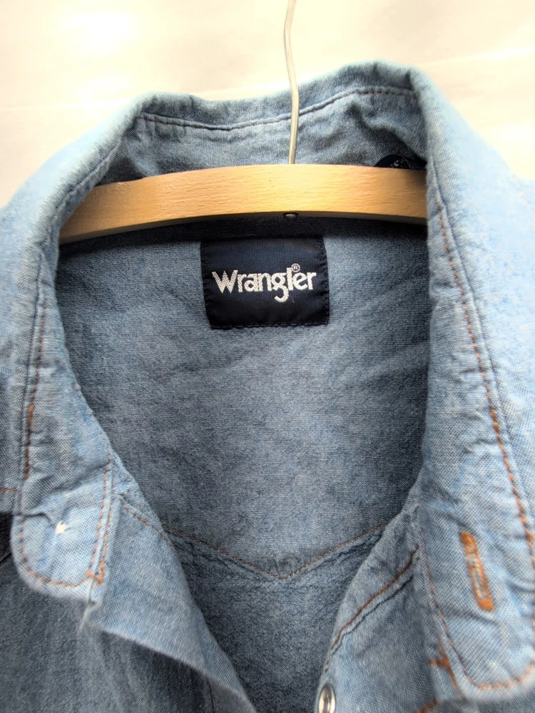 This vintage Wrangler Western denim shirt for men in size XL features pearl snap buttons, a collared neckline, and a classic button-down style. The shirt is made of durable cotton denim with a solid blue color, perfect for casual occasions with a touch of retro Western flair. The regular fit and standard cuff style make it a versatile addition to any wardrobe, with accents that hint at a cowboy or rodeo theme. Ideal for those who appreciate vintage western denim and the iconic Wrangler brand. pit to pit 25 inch