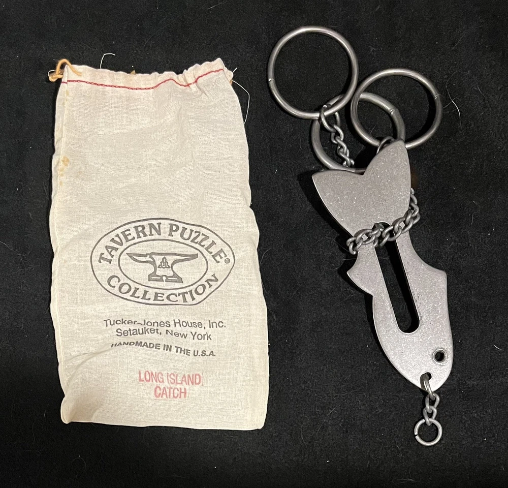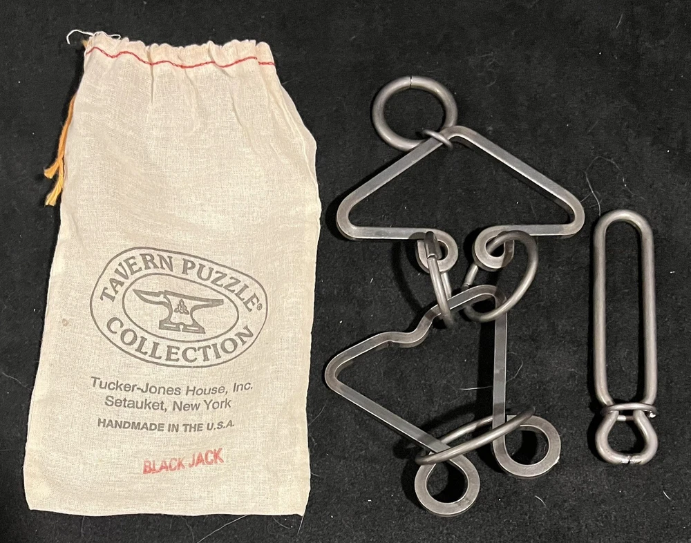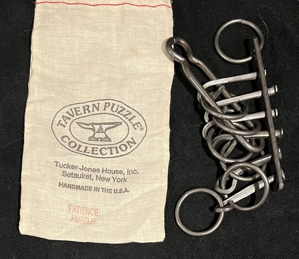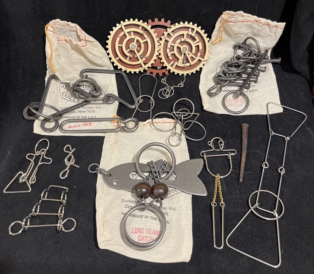 This is a very nice collection of Tavern Puzzles, brain teasers, and games including 3 vintage wrought iron Tucker-Jones House, Inc. tavern puzzles: Black Jack Long Island Catch Patience Puzzle
