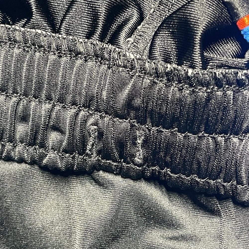 Has some pilling and missing the drawstring. Still very good stretch in the waist. The second waist measurement photo is the waist fully stretched