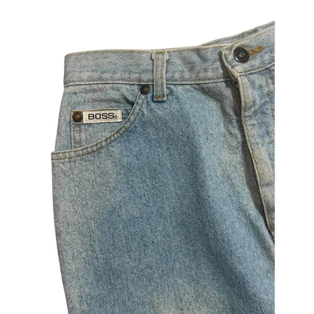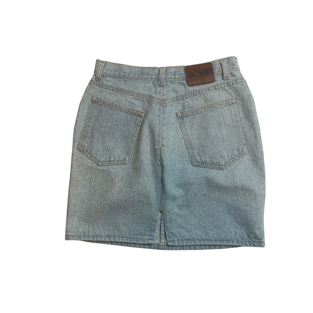Vintage Y2K Boss by IG Design Denim Jean Skirt Womens Small Light Wash Mini Blue Festival Country Cowgirl Cowgirlcore Western Basic Everyday Staple Capsule Wardrobe Classic Timeless 5 pocket design Casual High Rise High Waisted America American Made 2000s denim skirt by Boss. Light blue. High waist. Leather brand logo tag on back. PLEASE READ – As with all vintage pieces please see measurements for sizing. VTG tag size 11/12, measurements indicate would be todays size small, please review measurements. Made in the USA. This VTG piece in great preowned condition for age. Professional, highly rated seller, quick shipper, open to offers! Approximate measurements: Waist: 29 inches Length (waist to hem): 18 inches 71602